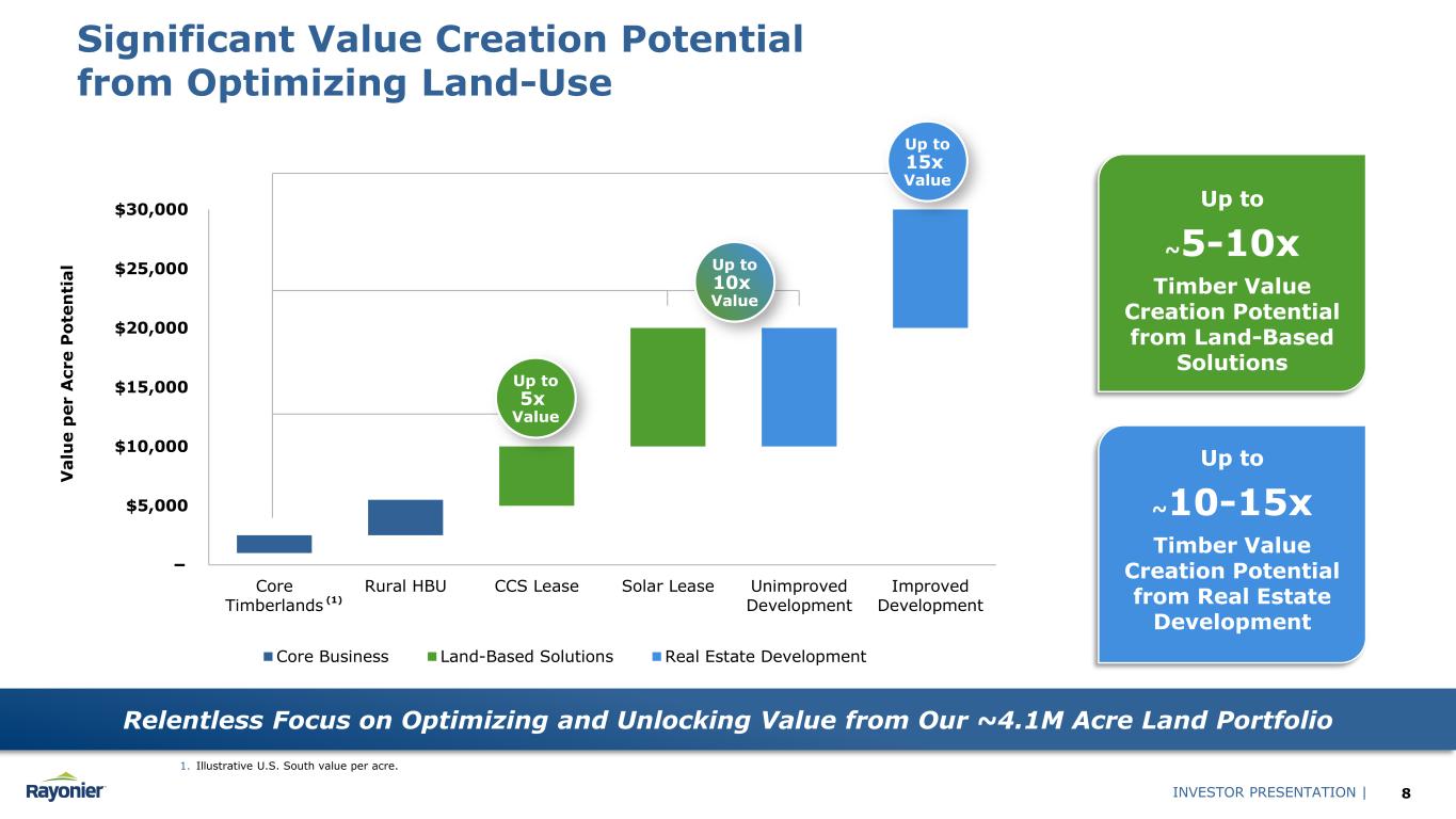 7 Key Trends Driving Alternative Uses for Land and Timber Well-Positioned to Capitalize on Key Trends Emerging for Large-Scale Landowners Timber & Real Estate Need for solutions to support transition to low-carbon economy Trends Leasing land for solar development and carbon capture and storage; utilization of timber for bioenergy or carbon credits Opportunity Population migration and underbuilt housing supply Trends Investment in entitlements and horizontal infrastructure to catalyze demand and enhance underlying land values Opportunity Strong demand for rural land and appreciating land values Trends Capturing premium on HBU / rural land above core timberland values Opportunity INVESTOR PRESENTATION |