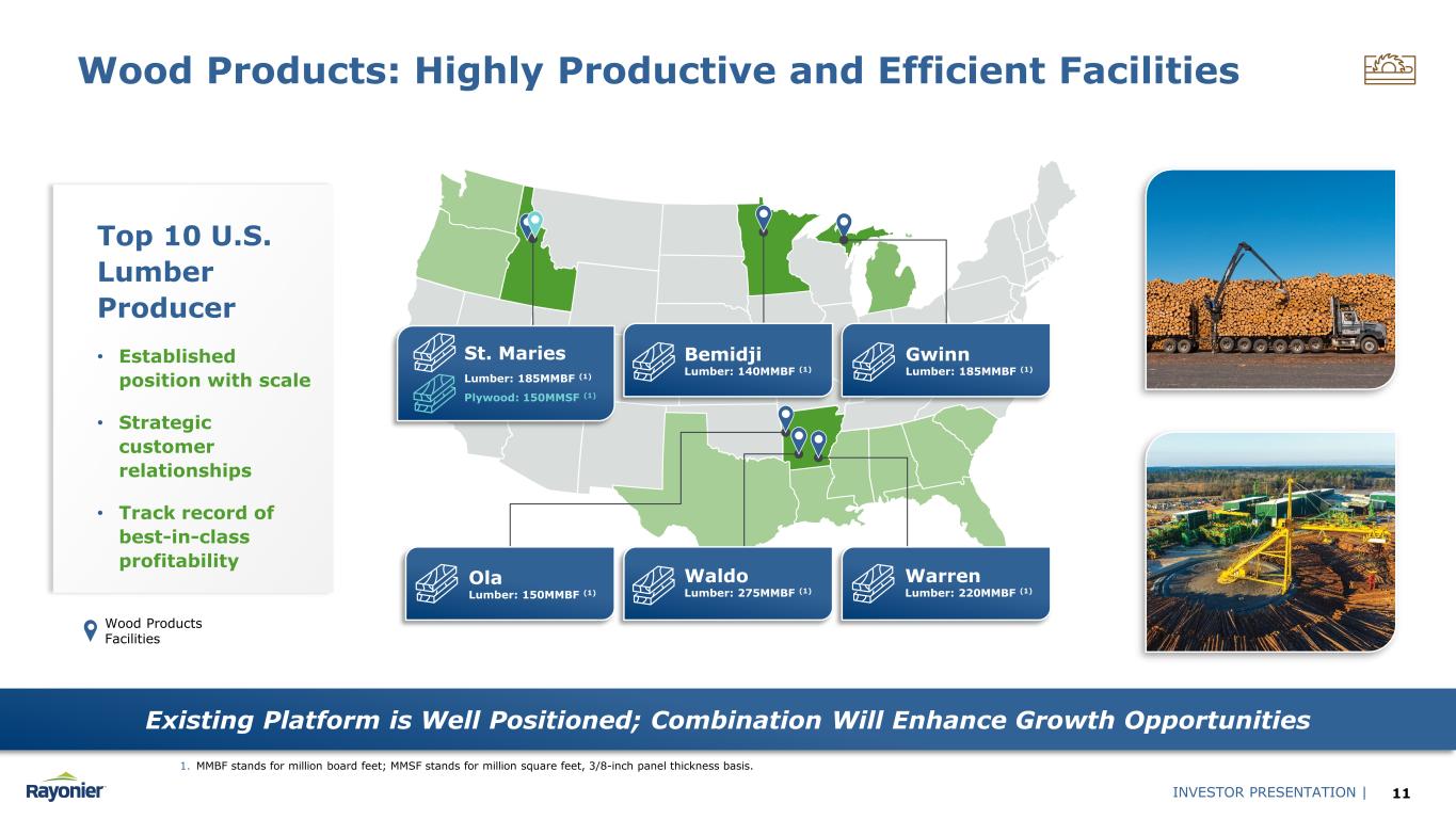 10 Forecast 90 92 94 96 98 100 102 104 106 108 110 20 17 20 18 20 19 20 20 20 21 20 22 20 23 20 24 20 25 20 26 20 27 (Housing Starts – Millions, SAAR) Lumber Production Grade products are largely sold to lumber mill customers that have direct exposure to residential construction activity U.S. Housing U.S. Housing Remains Underbuilt The share of U.S. lumber consumption being produced in the United States is increasing Pulp mills provide a base load of timber demand within many of our operating areas, particularly in the U.S. South U.S. Lumber Production to Rise U.S. Quarterly Box Shipments Forecast (U.S. Lumber Consumption – Billion Board Feet) (Seasonally Adjusted, Billion Square Feet) Pulpwood Markets Forecast Factors Influencing Results Vary by Market, But Largely Tie Back to Three Central Forces Timberlands: Key Market Drivers 0.00 0.50 1.00 1.50 2.00 2.50 20 00 20 01 20 02 20 03 20 05 20 06 20 07 20 08 20 10 20 11 20 12 20 13 20 15 20 16 20 17 20 18 20 20 20 21 20 22 20 23 20 25 Housing Starts Underlying Demand 55% 60% 65% 70% 75% 80% 0 10 20 30 40 50 60 70 Domestic Production Canadian Imports Offshore Imports U.S. Share Source: U.S. Census, FEA Monthly Macroeconomic Advisor, FEA Lumber Quarterly Forecast. Includes content supplied by Fastmarkets; Copyright © Fastmarkets, 2026. All rights reserved. INVESTOR PRESENTATION |