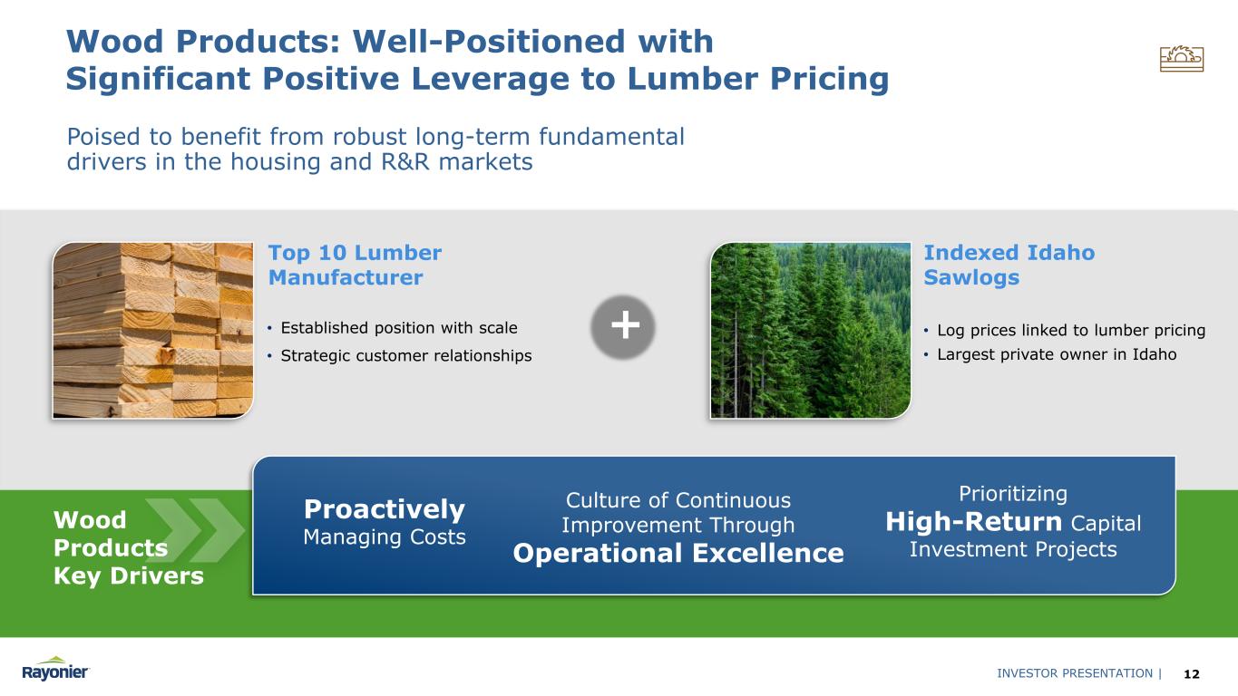 11 Wood Products Facilities Top 10 U.S. Lumber Producer • Established position with scale • Strategic customer relationships • Track record of best-in-class profitability Gwinn Lumber: 185MMBF (1) St. Maries Lumber: 185MMBF (1) Plywood: 150MMSF (1) Bemidji Lumber: 140MMBF (1) Waldo Lumber: 275MMBF (1) Warren Lumber: 220MMBF (1) Ola Lumber: 150MMBF (1) Existing Platform is Well Positioned; Combination Will Enhance Growth Opportunities Wood Products: Highly Productive and Efficient Facilities 1. MMBF stands for million board feet; MMSF stands for million square feet, 3/8-inch panel thickness basis. INVESTOR PRESENTATION |