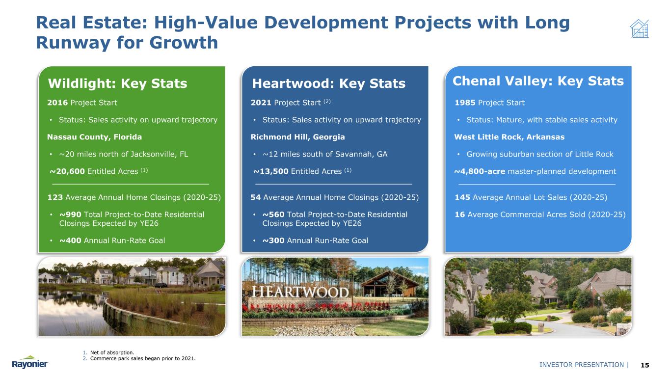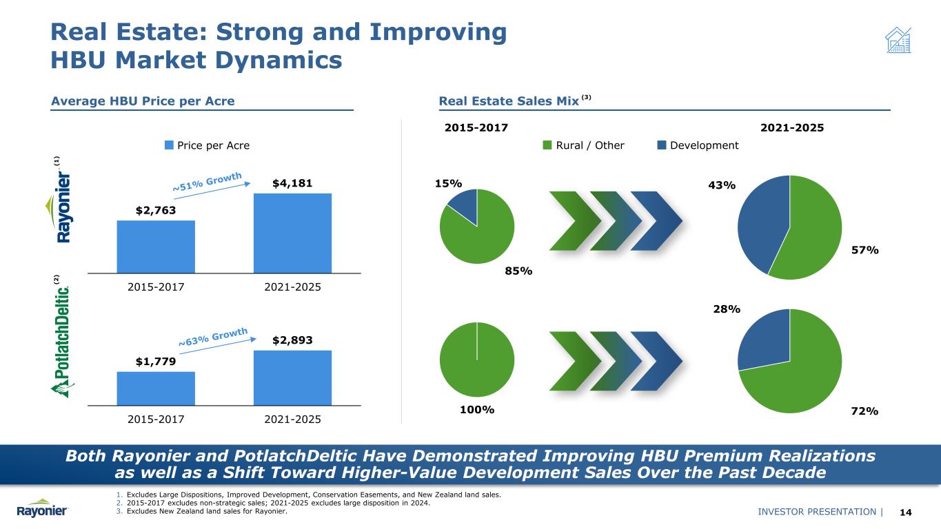 14 Average HBU Price per Acre Real Estate Sales Mix (3) 85% 15% $2,763 $4,181 2015-2017 2021-2025 $1,779 $2,893 2015-2017 2021-2025 Rural / Other Development 2015-2017 2021-2025 100% 57% 43% 72% 28% Price per Acre Both Rayonier and PotlatchDeltic Have Demonstrated Improving HBU Premium Realizations as well as a Shift Toward Higher-Value Development Sales Over the Past Decade Real Estate: Strong and Improving HBU Market Dynamics (1 ) (2 ) 1. Excludes Large Dispositions, Improved Development, Conservation Easements, and New Zealand land sales. 2. 2015-2017 excludes non-strategic sales; 2021-2025 excludes large disposition in 2024. 3. Excludes New Zealand land sales for Rayonier. INVESTOR PRESENTATION |