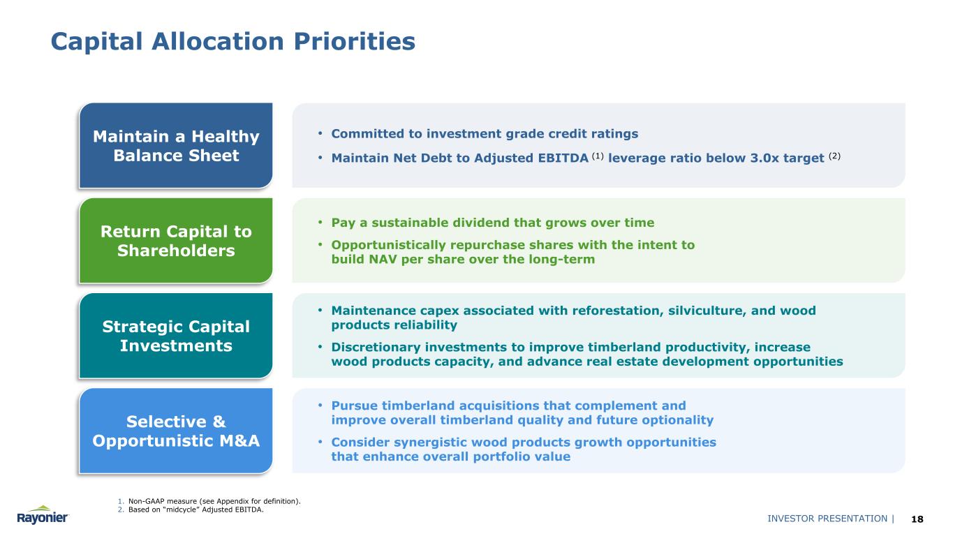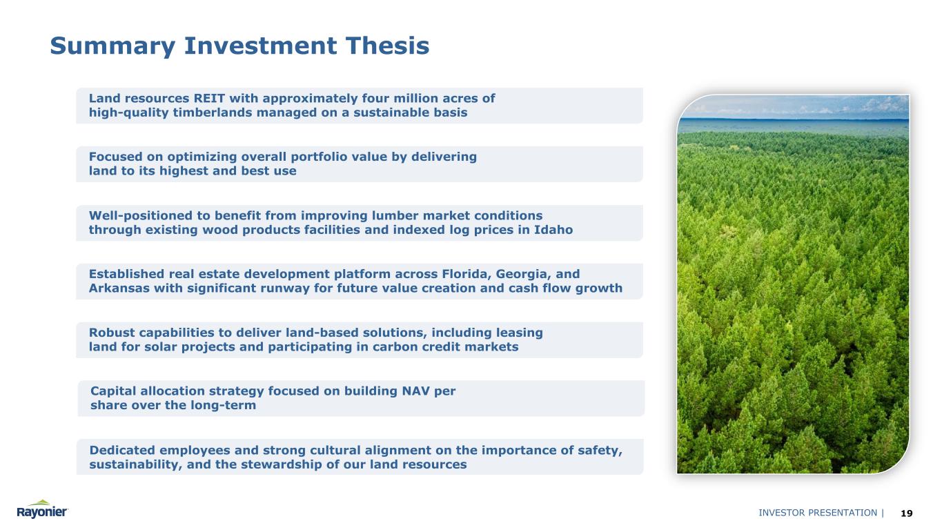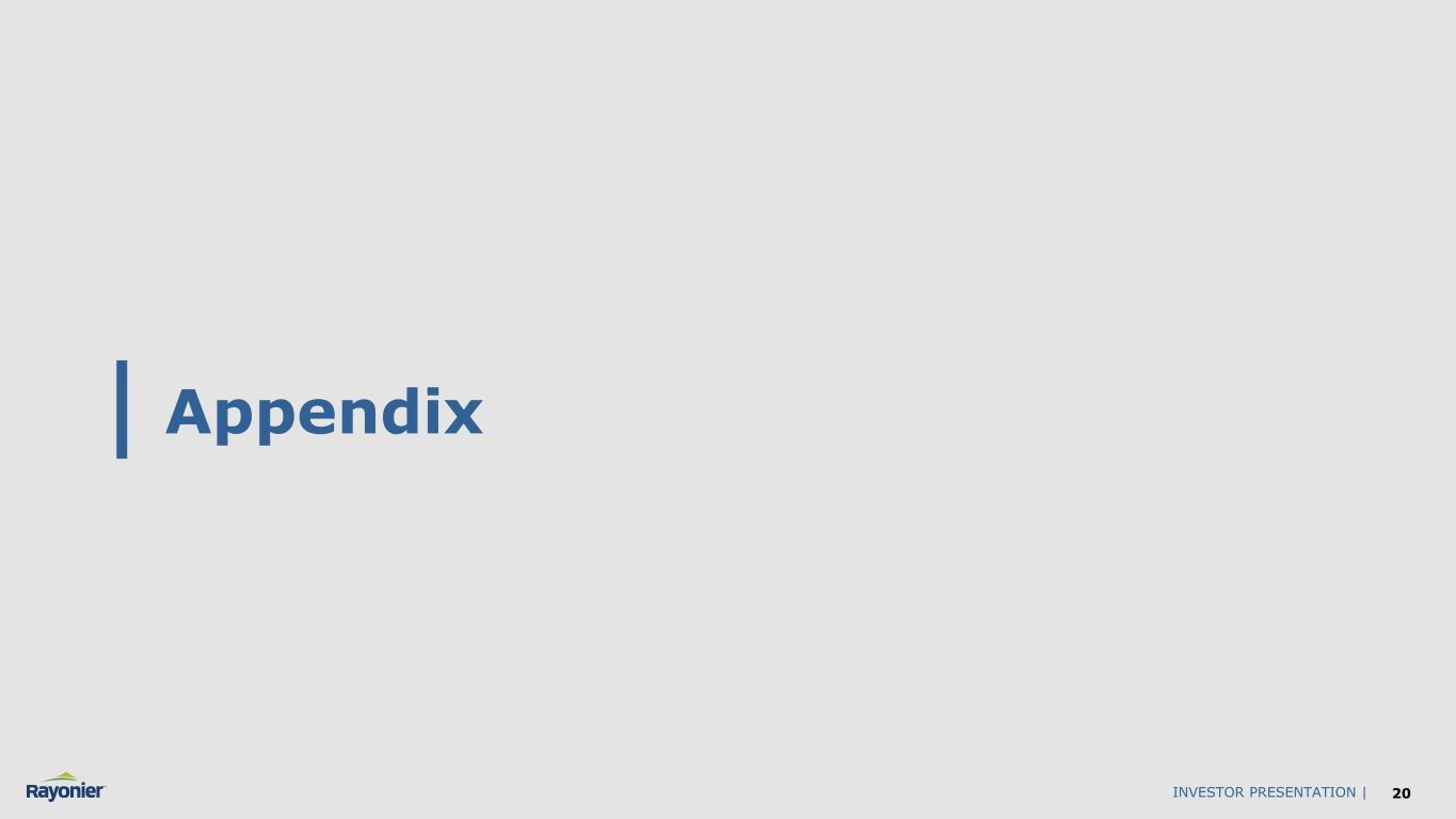 18 Maintain a Healthy Balance Sheet • Committed to investment grade credit ratings • Maintain Net Debt to Adjusted EBITDA (1) leverage ratio below 3.0x target (2) Return Capital to Shareholders • Pay a sustainable dividend that grows over time • Opportunistically repurchase shares with the intent to build NAV per share over the long-term Strategic Capital Investments • Maintenance capex associated with reforestation, silviculture, and wood products reliability • Discretionary investments to improve timberland productivity, increase wood products capacity, and advance real estate development opportunities Selective & Opportunistic M&A • Pursue timberland acquisitions that complement and improve overall timberland quality and future optionality • Consider synergistic wood products growth opportunities that enhance overall portfolio value Capital Allocation Priorities 1. Non-GAAP measure (see Appendix for definition). 2. Based on “midcycle” Adjusted EBITDA. INVESTOR PRESENTATION |