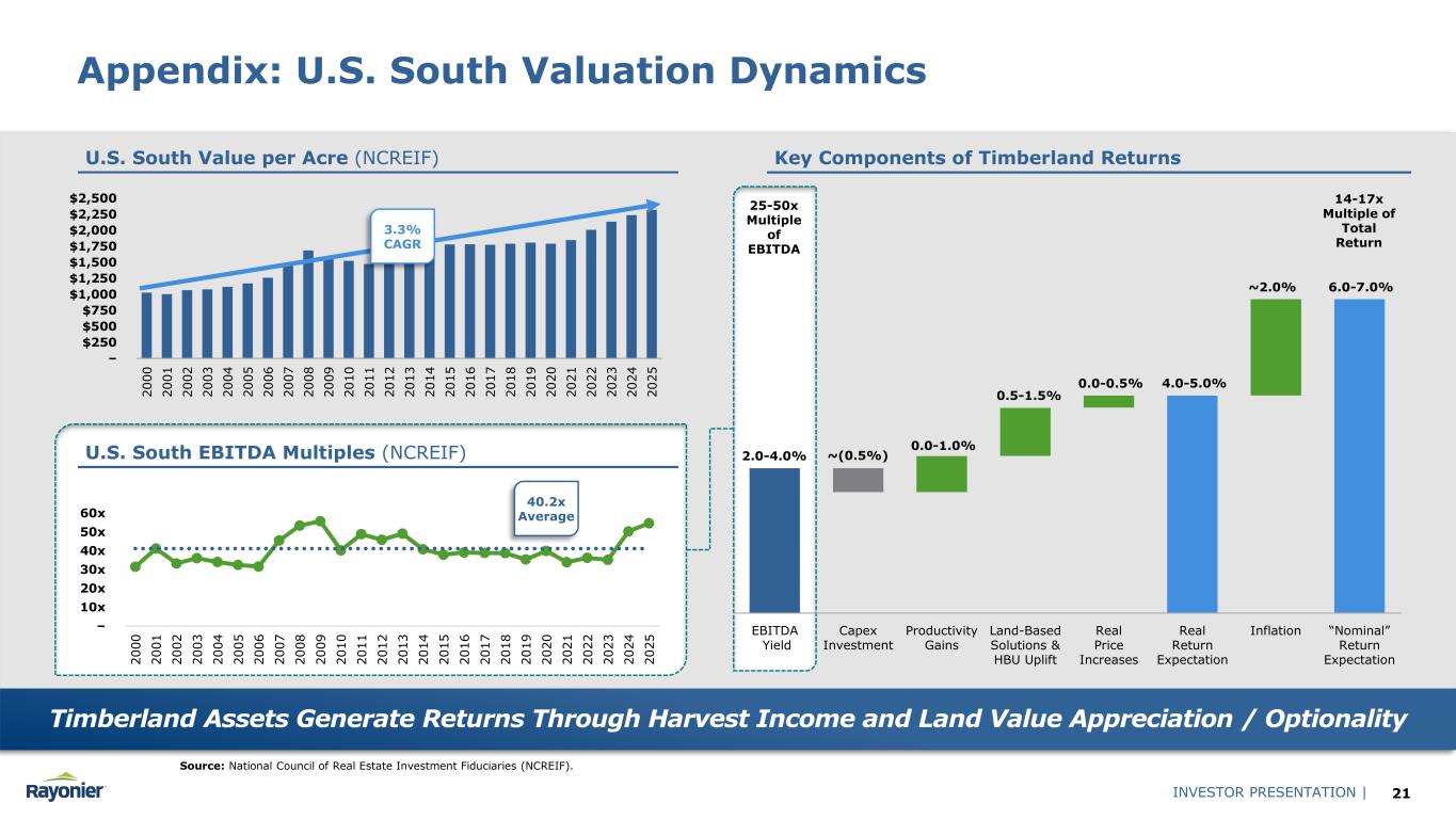 21 EBITDA Yield Capex Investment Productivity Gains Land-Based Solutions & HBU Uplift Real Price Increases Real Return Expectation Inflation “Nominal” Return Expectation Appendix: U.S. South Valuation Dynamics Timberland Assets Generate Returns Through Harvest Income and Land Value Appreciation / Optionality – 10x 20x 30x 40x 50x 60x 20 00 20 01 20 02 20 03 20 04 20 05 20 06 20 07 20 08 20 09 20 10 20 11 20 12 20 13 20 14 20 15 20 16 20 17 20 18 20 19 20 20 20 21 20 22 20 23 20 24 20 25 U.S. South Value per Acre (NCREIF) Key Components of Timberland Returns U.S. South EBITDA Multiples (NCREIF) – $250 $500 $750 $1,000 $1,250 $1,500 $1,750 $2,000 $2,250 $2,500 20 00 20 01 20 02 20 03 20 04 20 05 20 06 20 07 20 08 20 09 20 10 20 11 20 12 20 13 20 14 20 15 20 16 20 17 20 18 20 19 20 20 20 21 20 22 20 23 20 24 20 25 2.0-4.0% 4.0-5.0% 0.0-1.0% 0.5-1.5% ~2.0% ~(0.5%) 6.0-7.0% 0.0-0.5% 25-50x Multiple of EBITDA 14-17x Multiple of Total Return 3.3% CAGR 40.2x Average INVESTOR PRESENTATION | Source: National Council of Real Estate Investment Fiduciaries (NCREIF).