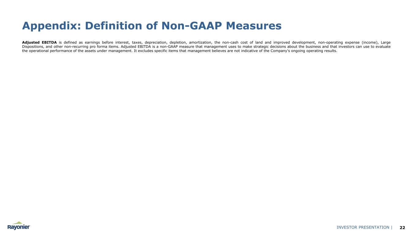 22INVESTOR PRESENTATION | Adjusted EBITDA is defined as earnings before interest, taxes, depreciation, depletion, amortization, the non-cash cost of land and improved development, non-operating expense (income), Large Dispositions, and other non-recurring pro forma items. Adjusted EBITDA is a non-GAAP measure that management uses to make strategic decisions about the business and that investors can use to evaluate the operational performance of the assets under management. It excludes specific items that management believes are not indicative of the Company's ongoing operating results. Appendix: Definition of Non-GAAP Measures