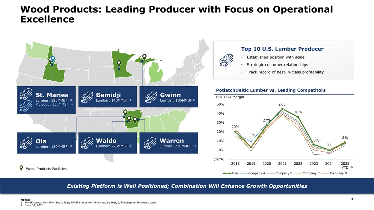 Wood Products: Leading Producer with Focus on Operational Excellence Top 10 U.S. Lumber Producer • Established position with scale • Strategic customer relationships • Track record of best-in-class profitability PotlatchDeltic Lumber vs. Leading Competitors St. Maries Bemidji Gwinn EBITDDA Margin (1) (1) (1) Lumber: 185MMBF Lumber: 140MMBF Lumber: 185MMBF (1) 50% Plywood: 150MMSF 45% 36% 40% 27% 30% 20% 20% 3% 8% 6% 10% Waldo Warren Ola (1) (1) 0% (1) Lumber: 275MMBF Lumber: 220MMBF Lumber: 150MMBF 0% (10%) 2018 2019 2020 2021 2022 2023 2024 2025 (2) YTD Wood Products Facilities Pine Company A Company B Company C Company D Existing Platform is Well Positioned; Combination Will Enhance Growth Opportunities 10 Notes: 1. MMBF stands for million board feet; MMSF stands for million square feet, 3/8-inch panel thickness basis 2. June 30, 2025