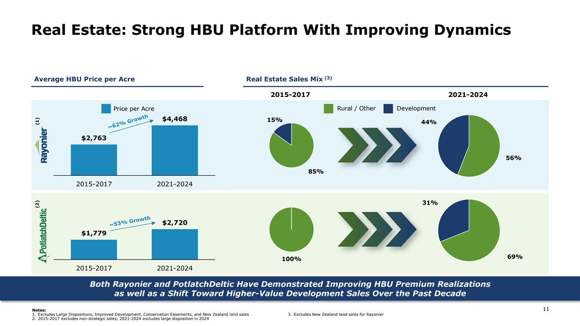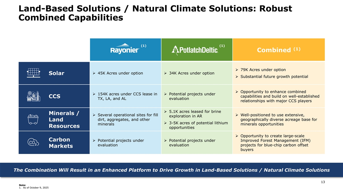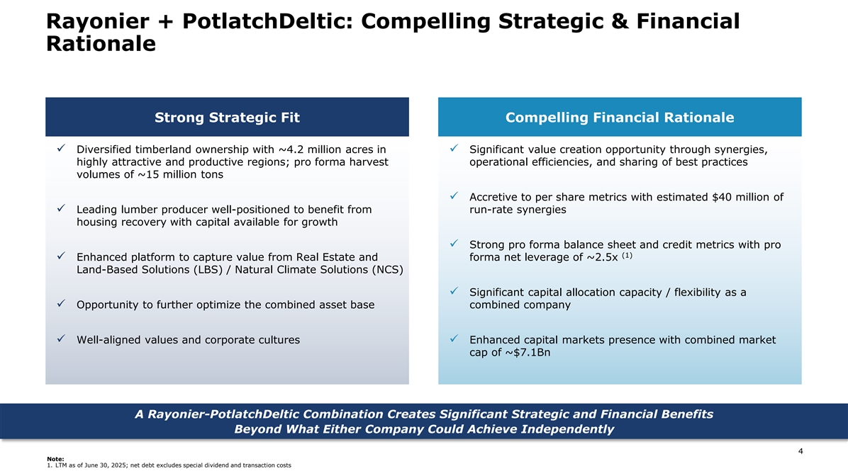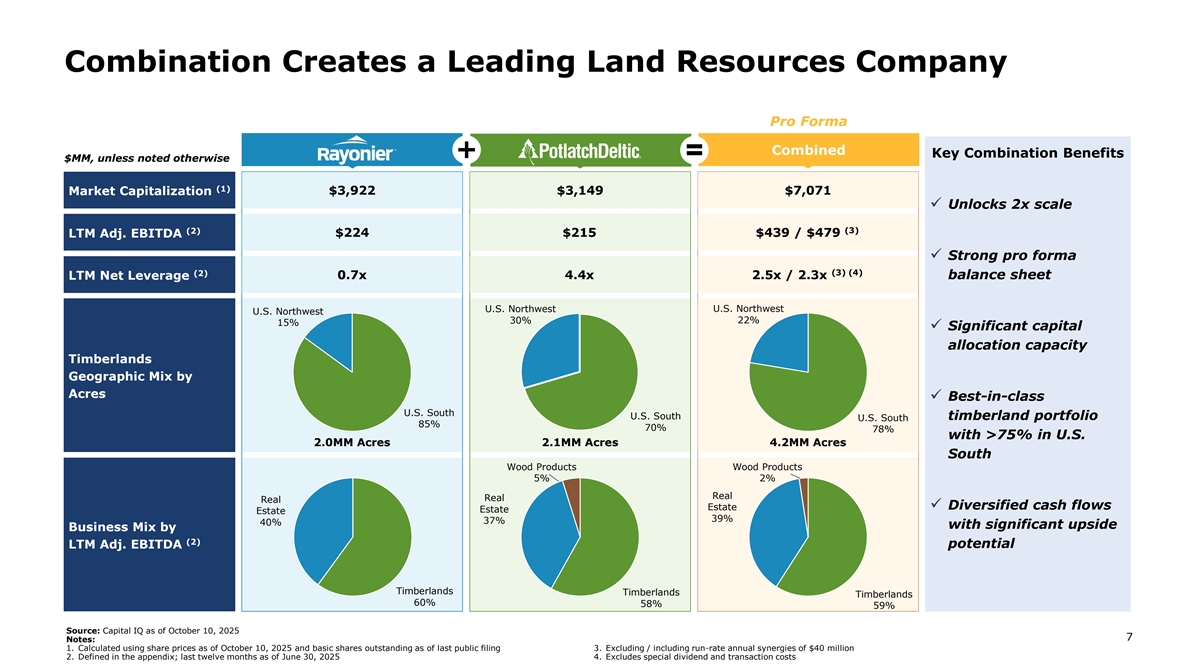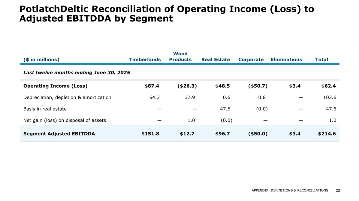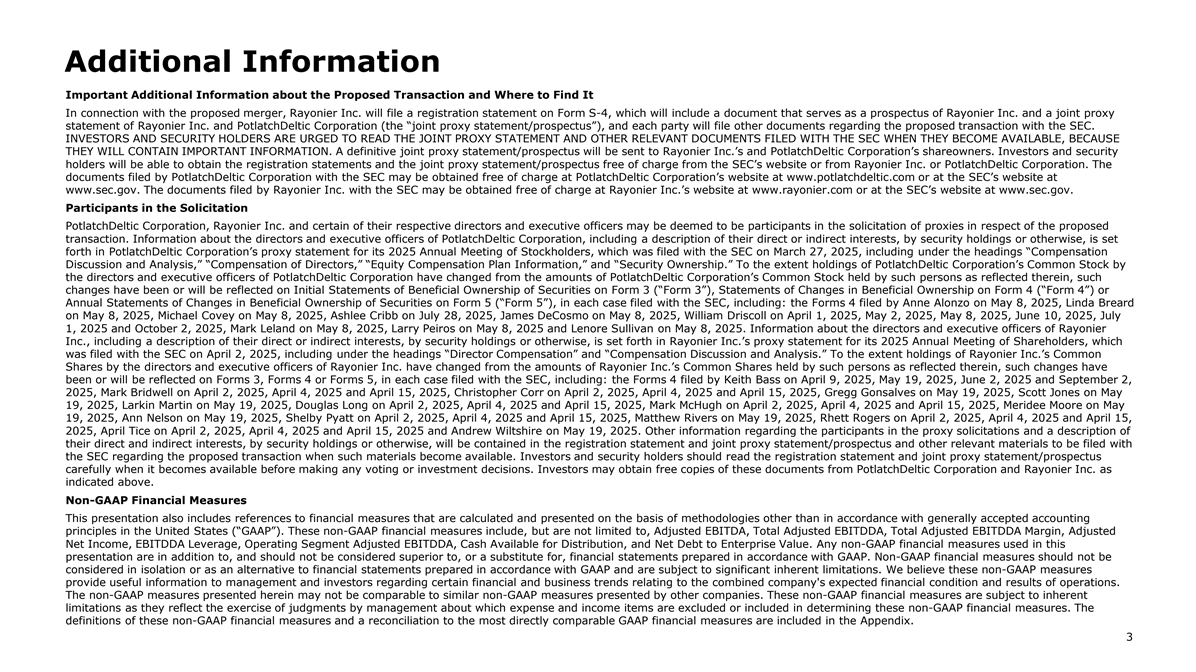 Additional Information Important Additional Information about the Proposed Transaction and Where to Find It In connection with the proposed merger, Rayonier Inc. will file a registration statement on Form S-4, which will include a document that serves as a prospectus of Rayonier Inc. and a joint proxy statement of Rayonier Inc. and PotlatchDeltic Corporation (the “joint proxy statement/prospectus”), and each party will file other documents regarding the proposed transaction with the SEC. INVESTORS AND SECURITY HOLDERS ARE URGED TO READ THE JOINT PROXY STATEMENT AND OTHER RELEVANT DOCUMENTS FILED WITH THE SEC WHEN THEY BECOME AVAILABLE, BECAUSE THEY WILL CONTAIN IMPORTANT INFORMATION. A definitive joint proxy statement/prospectus will be sent to Rayonier Inc.’s and PotlatchDeltic Corporation’s shareowners. Investors and security holders will be able to obtain the registration statements and the joint proxy statement/prospectus free of charge from the SEC’s website or from Rayonier Inc. or PotlatchDeltic Corporation. The documents filed by PotlatchDeltic Corporation with the SEC may be obtained free of charge at PotlatchDeltic Corporation’s website at www.potlatchdeltic.com or at the SEC’s website at www.sec.gov. The documents filed by Rayonier Inc. with the SEC may be obtained free of charge at Rayonier Inc.’s website at www.rayonier.com or at the SEC’s website at www.sec.gov. Participants in the Solicitation PotlatchDeltic Corporation, Rayonier Inc. and certain of their respective directors and executive officers may be deemed to be participants in the solicitation of proxies in respect of the proposed transaction. Information about the directors and executive officers of PotlatchDeltic Corporation, including a description of their direct or indirect interests, by security holdings or otherwise, is set forth in PotlatchDeltic Corporation’s proxy statement for its 2025 Annual Meeting of Stockholders, which was filed with the SEC on March 27, 2025, including under the headings “Compensation Discussion and Analysis,” “Compensation of Directors,” “Equity Compensation Plan Information,” and “Security Ownership.” To the extent holdings of PotlatchDeltic Corporation’s Common Stock by the directors and executive officers of PotlatchDeltic Corporation have changed from the amounts of PotlatchDeltic Corporation’s Common Stock held by such persons as reflected therein, such changes have been or will be reflected on Initial Statements of Beneficial Ownership of Securities on Form 3 (“Form 3”), Statements of Changes in Beneficial Ownership on Form 4 (“Form 4”) or Annual Statements of Changes in Beneficial Ownership of Securities on Form 5 (“Form 5”), in each case filed with the SEC, including: the Forms 4 filed by Anne Alonzo on May 8, 2025, Linda Breard on May 8, 2025, Michael Covey on May 8, 2025, Ashlee Cribb on July 28, 2025, James DeCosmo on May 8, 2025, William Driscoll on April 1, 2025, May 2, 2025, May 8, 2025, June 10, 2025, July 1, 2025 and October 2, 2025, Mark Leland on May 8, 2025, Larry Peiros on May 8, 2025 and Lenore Sullivan on May 8, 2025. Information about the directors and executive officers of Rayonier Inc., including a description of their direct or indirect interests, by security holdings or otherwise, is set forth in Rayonier Inc.’s proxy statement for its 2025 Annual Meeting of Shareholders, which was filed with the SEC on April 2, 2025, including under the headings “Director Compensation” and “Compensation Discussion and Analysis.” To the extent holdings of Rayonier Inc.’s Common Shares by the directors and executive officers of Rayonier Inc. have changed from the amounts of Rayonier Inc.’s Common Shares held by such persons as reflected therein, such changes have been or will be reflected on Forms 3, Forms 4 or Forms 5, in each case filed with the SEC, including: the Forms 4 filed by Keith Bass on April 9, 2025, May 19, 2025, June 2, 2025 and September 2, 2025, Mark Bridwell on April 2, 2025, April 4, 2025 and April 15, 2025, Christopher Corr on April 2, 2025, April 4, 2025 and April 15, 2025, Gregg Gonsalves on May 19, 2025, Scott Jones on May 19, 2025, Larkin Martin on May 19, 2025, Douglas Long on April 2, 2025, April 4, 2025 and April 15, 2025, Mark McHugh on April 2, 2025, April 4, 2025 and April 15, 2025, Meridee Moore on May 19, 2025, Ann Nelson on May 19, 2025, Shelby Pyatt on April 2, 2025, April 4, 2025 and April 15, 2025, Matthew Rivers on May 19, 2025, Rhett Rogers on April 2, 2025, April 4, 2025 and April 15, 2025, April Tice on April 2, 2025, April 4, 2025 and April 15, 2025 and Andrew Wiltshire on May 19, 2025. Other information regarding the participants in the proxy solicitations and a description of their direct and indirect interests, by security holdings or otherwise, will be contained in the registration statement and joint proxy statement/prospectus and other relevant materials to be filed with the SEC regarding the proposed transaction when such materials become available. Investors and security holders should read the registration statement and joint proxy statement/prospectus carefully when it becomes available before making any voting or investment decisions. Investors may obtain free copies of these documents from PotlatchDeltic Corporation and Rayonier Inc. as indicated above. Non-GAAP Financial Measures This presentation also includes references to financial measures that are calculated and presented on the basis of methodologies other than in accordance with generally accepted accounting principles in the United States (“GAAP”). These non-GAAP financial measures include, but are not limited to, Adjusted EBITDA, Total Adjusted EBITDDA, Total Adjusted EBITDDA Margin, Adjusted Net Income, EBITDDA Leverage, Operating Segment Adjusted EBITDDA, Cash Available for Distribution, and Net Debt to Enterprise Value. Any non-GAAP financial measures used in this presentation are in additio