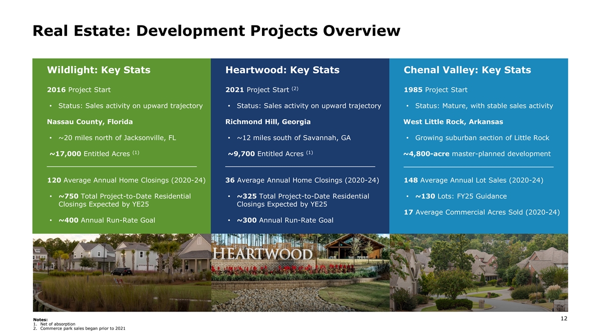 Real Estate: Development Projects Overview Wildlight: Key Stats Heartwood: Key Stats Chenal Valley: Key Stats (2) 2016 Project Start 2021 Project Start 1985 Project Start • Status: Sales activity on upward trajectory • Status: Sales activity on upward trajectory • Status: Mature, with stable sales activity Nassau County, Florida Richmond Hill, Georgia West Little Rock, Arkansas • ~20 miles north of Jacksonville, FL • ~12 miles south of Savannah, GA • Growing suburban section of Little Rock (1) (1) ~17,000 Entitled Acres ~9,700 Entitled Acres ~4,800-acre master-planned development 120 Average Annual Home Closings (2020-24) 36 Average Annual Home Closings (2020-24) 148 Average Annual Lot Sales (2020-24) • ~750 Total Project-to-Date Residential • ~325 Total Project-to-Date Residential • ~130 Lots: FY25 Guidance Closings Expected by YE25 Closings Expected by YE25 17 Average Commercial Acres Sold (2020-24) • ~400 Annual Run-Rate Goal • ~300 Annual Run-Rate Goal Notes: 12 Notes: 1. Net of absorption 1. Net of absorption 2. Commerce park sales began prior to 2021 2. Commerce park sales began prior to 2021