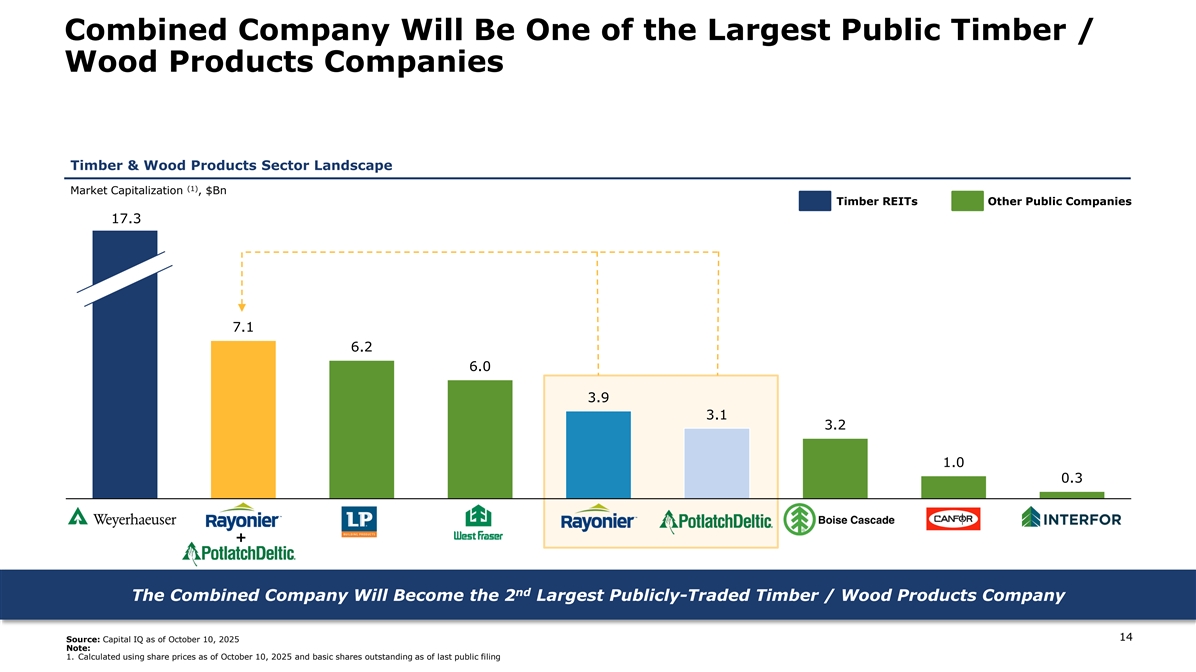 Land-Based Solutions / Natural Climate Solutions: Robust Combined Capabilities (1) (1) (1) Combined Ø 79K Acres under option Ø 45K Acres under optionØ 34K Acres under option Solar Ø Substantial future growth potential Ø Opportunity to enhance combined Ø 154K acres under CCS lease in Ø Potential projects under capabilities and build on well-established CCS TX, LA, and AL evaluation relationships with major CCS players Ø 5.1K acres leased for brine Minerals / Ø Several operational sites for fill Ø Well-positioned to use extensive, exploration in AR dirt, aggregates, and other geographically diverse acreage base for Land Ø 3-5K acres of potential lithium minerals minerals opportunities Resources opportunities Ø Opportunity to create large-scale Carbon Ø Potential projects under Ø Potential projects under Improved Forest Management (IFM) evaluation evaluation projects for blue-chip carbon offset Markets buyers The Combination Will Result in an Enhanced Platform to Drive Growth in Land-Based Solutions / Natural Climate Solutions 13 Note: 1. As of October 9, 2025