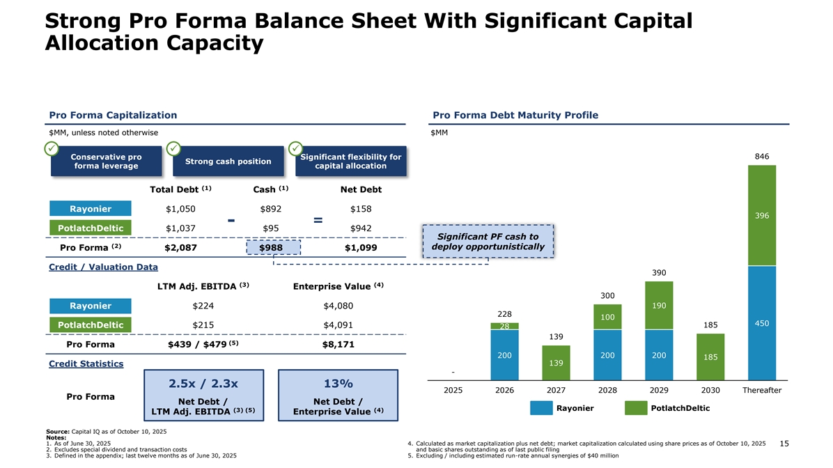 Combined Company Will Be One of the Largest Public Timber / Wood Products Companies Timber & Wood Products Sector Landscape (1) Market Capitalization , $Bn Timber REITs Other Public Companies 17.3 7.1 6.2 6.0 3.9 3.1 3.2 1.0 0.3 + nd The Combined Company Will Become the 2 Largest Publicly-Traded Timber / Wood Products Company 14 Source: Capital IQ as of October 10, 2025 Note: 1. Calculated using share prices as of October 10, 2025 and basic shares outstanding as of last public filing