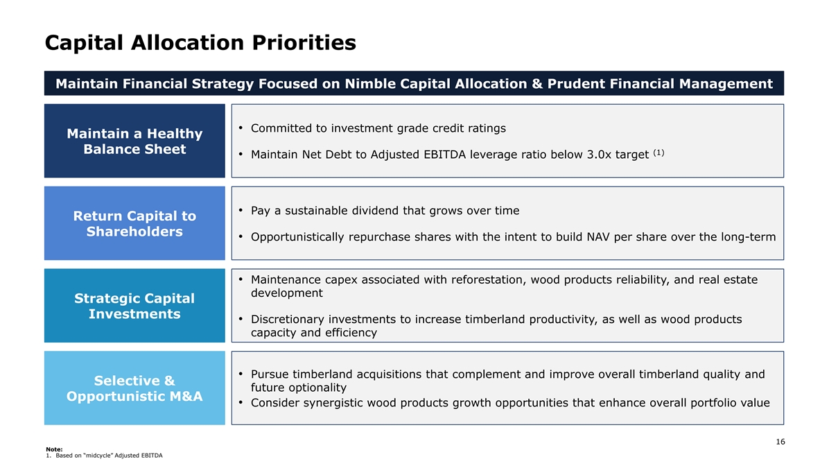 Strong Pro Forma Balance Sheet With Significant Capital Allocation Capacity Pro Forma Capitalization Pro Forma Debt Maturity Profile $MM, unless noted otherwise $MM üüü Conservative pro Significant flexibility for 846 Strong cash position forma leverage capital allocation (1) (1) Total Debt Cash Net Debt Rayonier $1,050 $892 $158 396 = - PotlatchDeltic $1,037 $95 $942 Significant PF cash to (2) deploy opportunistically Pro Forma $2,087 $988 $1,099 Credit / Valuation Data 390 (3) (4) LTM Adj. EBITDA Enterprise Value 300 190 Rayonier $224 $4,080 228 100 450 PotlatchDeltic $215 $4,091 185 28 139 (5) Pro Forma $439 / $479 $8,171 200 200 200 185 139 Credit Statistics - 2.5x / 2.3x 13% 2025 2026 2027 2028 2029 2030 Thereafter Pro Forma Net Debt / Net Debt / Rayonier PotlatchDeltic (3) (5) (4) LTM Adj. EBITDA Enterprise Value Source: Capital IQ as of October 10, 2025 Notes: 1. As of June 30, 2025 4. Calculated as market capitalization plus net debt; market capitalization calculated using share prices as of October 10, 2025 15 2. Excludes special dividend and transaction costs and basic shares outstanding as of last public filing 3. Defined in the appendix; last twelve months as of June 30, 2025 5. Excluding / including estimated run-rate annual synergies of $40 million