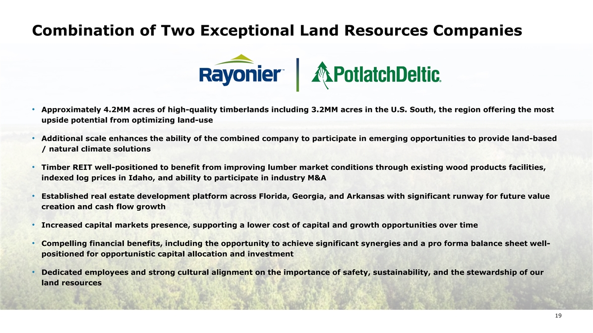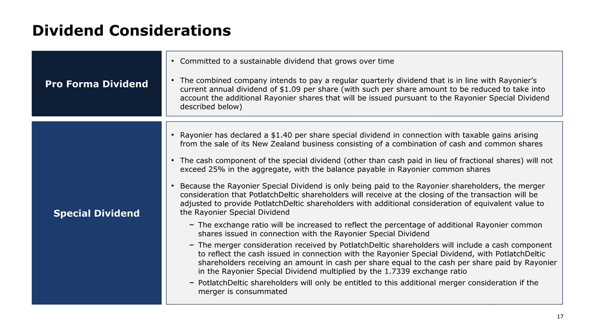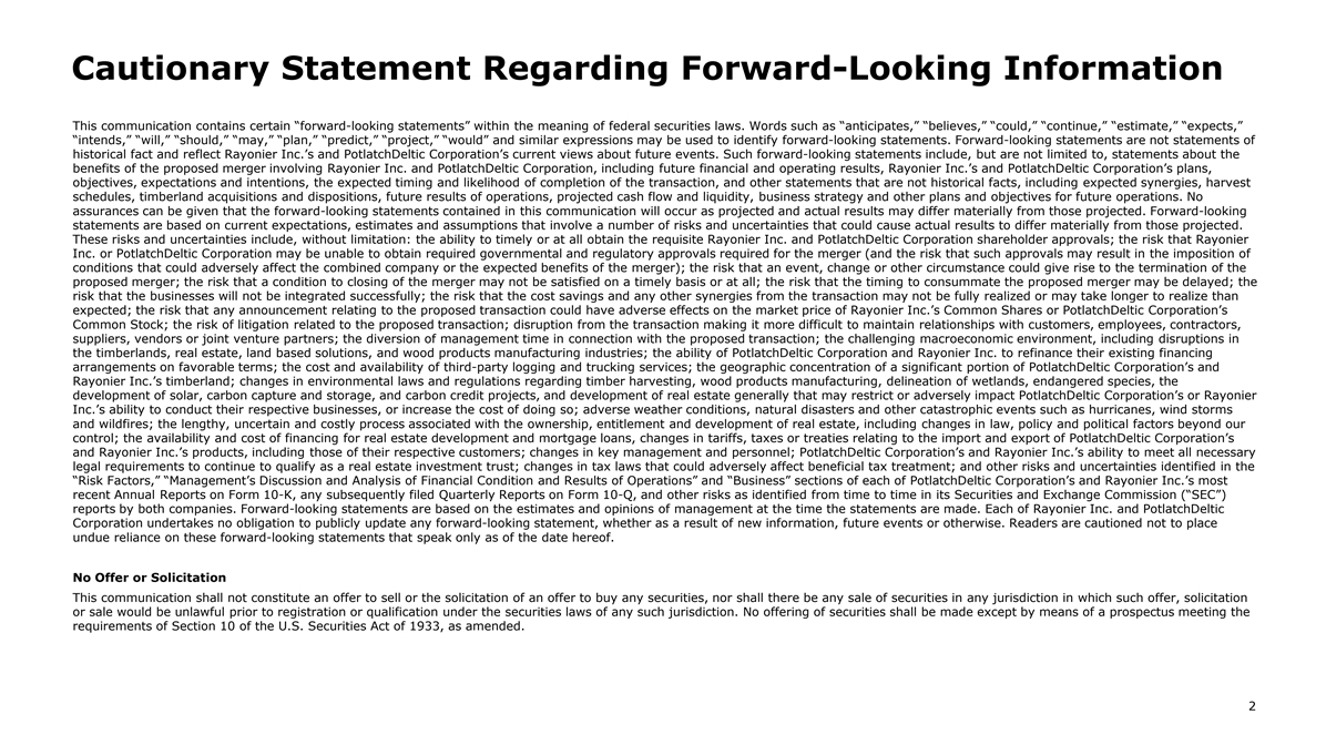 Cautionary Statement Regarding Forward-Looking Information This communication contains certain “forward-looking statements” within the meaning of federal securities laws. Words such as “anticipates,” “believes,” “could,” “continue,” “estimate,” “expects,” “intends,” “will,” “should,” “may,” “plan,” “predict,” “project,” “would” and similar expressions may be used to identify forward-looking statements. Forward-looking statements are not statements of historical fact and reflect Rayonier Inc.’s and PotlatchDeltic Corporation’s current views about future events. Such forward-looking statements include, but are not limited to, statements about the benefits of the proposed merger involving Rayonier Inc. and PotlatchDeltic Corporation, including future financial and operating results, Rayonier Inc.’s and PotlatchDeltic Corporation’s plans, objectives, expectations and intentions, the expected timing and likelihood of completion of the transaction, and other statements that are not historical facts, including expected synergies, harvest schedules, timberland acquisitions and dispositions, future results of operations, projected cash flow and liquidity, business strategy and other plans and objectives for future operations. No assurances can be given that the forward-looking statements contained in this communication will occur as projected and actual results may differ materially from those projected. Forward-looking statements are based on current expectations, estimates and assumptions that involve a number of risks and uncertainties that could cause actual results to differ materially from those projected. These risks and uncertainties include, without limitation: the ability to timely or at all obtain the requisite Rayonier Inc. and PotlatchDeltic Corporation shareholder approvals; the risk that Rayonier Inc. or PotlatchDeltic Corporation may be unable to obtain required governmental and regulatory approvals required for the merger (and the risk that such approvals may result in the imposition of conditions that could adversely affect the combined company or the expected benefits of the merger); the risk that an event, change or other circumstance could give rise to the termination of the proposed merger; the risk that a condition to closing of the merger may not be satisfied on a timely basis or at all; the risk that the timing to consummate the proposed merger may be delayed; the risk that the businesses will not be integrated successfully; the risk that the cost savings and any other synergies from the transaction may not be fully realized or may take longer to realize than expected; the risk that any announcement relating to the proposed transaction could have adverse effects on the market price of Rayonier Inc.’s Common Shares or PotlatchDeltic Corporation’s Common Stock; the risk of litigation related to the proposed transaction; disruption from the transaction making it more difficult to maintain relationships with customers, employees, contractors, suppliers, vendors or joint venture partners; the diversion of management time in connection with the proposed transaction; the challenging macroeconomic environment, including disruptions in the timberlands, real estate, land based solutions, and wood products manufacturing industries; the ability of PotlatchDeltic Corporation and Rayonier Inc. to refinance their existing financing arrangements on favorable terms; the cost and availability of third-party logging and trucking services; the geographic concentration of a significant portion of PotlatchDeltic Corporation’s and Rayonier Inc.’s timberland; changes in environmental laws and regulations regarding timber harvesting, wood products manufacturing, delineation of wetlands, endangered species, the development of solar, carbon capture and storage, and carbon credit projects, and development of real estate generally that may restrict or adversely impact PotlatchDeltic Corporation’s or Rayonier Inc.’s ability to conduct their respective businesses, or increase the cost of doing so; adverse weather conditions, natural disasters and other catastrophic events such as hurricanes, wind storms and wildfires; the lengthy, uncertain and costly process associated with the ownership, entitlement and development of real estate, including changes in law, policy and political factors beyond our control; the availability and cost of financing for real estate development and mortgage loans, changes in tariffs, taxes or treaties relating to the import and export of PotlatchDeltic Corporation’s and Rayonier Inc.’s products, including those of their respective customers; changes in key management and personnel; PotlatchDeltic Corporation’s and Rayonier Inc.’s ability to meet all necessary legal requirements to continue to qualify as a real estate investment trust; changes in tax laws that could adversely affect beneficial tax treatment; and other risks and uncertainties identified in the “Risk Factors,” “Management’s Discussion and Analysis of Financial Condition and Results of Operations” and “Business” sections of each of PotlatchDeltic Corporation’s and Rayonier Inc.’s most recent Annual Reports on Form 10-K, any subsequently filed Quarterly Reports on Form 10-Q, and other risks as identified from time to time in its Securities and Exchange Commission (“SEC”) reports by both companies. Forward-looking statements are based on the estimates and opinions of management at the time the statements are made. Each of Rayonier Inc. and PotlatchDeltic Corporation undertakes no obligation to publicly update any forward-looking statement, whether as a result of new information, future events or otherwise. Readers are cautioned not to place undue reliance on these forward-looking statements that speak only as of the date hereof. No Offer or Solicitation This communication shall not constitute an offer to s