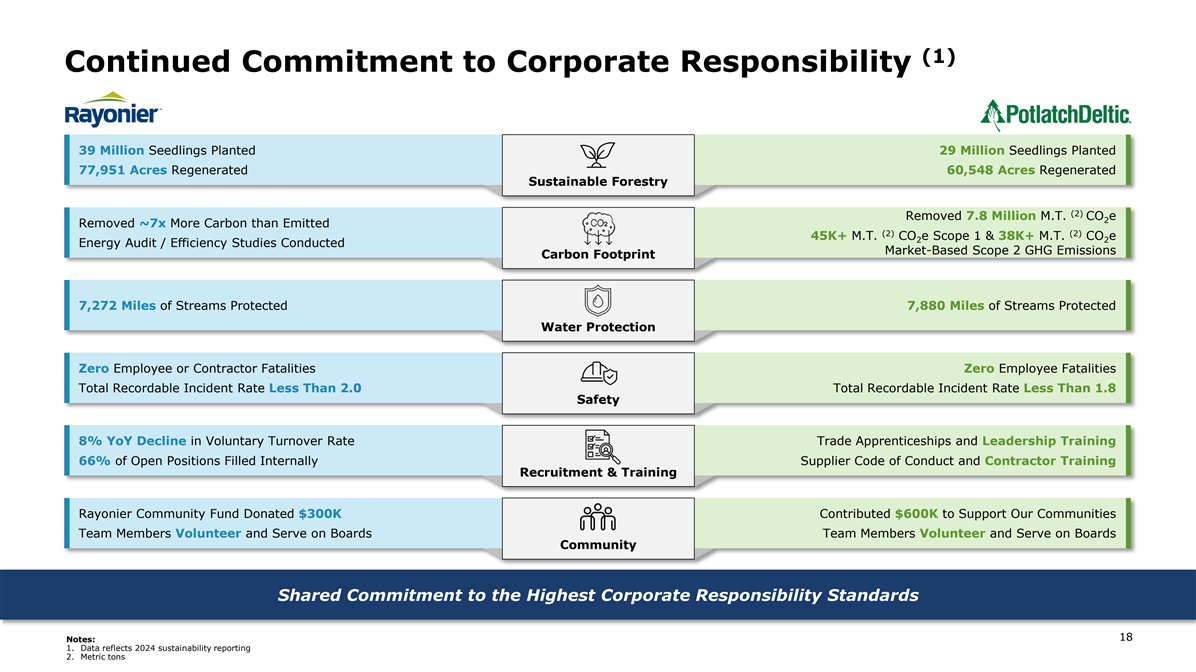 Dividend Considerations • Committed to a sustainable dividend that grows over time • The combined company intends to pay a regular quarterly dividend that is in line with Rayonier’s Pro Forma Dividend current annual dividend of $1.09 per share (with such per share amount to be reduced to take into account the additional Rayonier shares that will be issued pursuant to the Rayonier Special Dividend described below) • Rayonier has declared a $1.40 per share special dividend in connection with taxable gains arising from the sale of its New Zealand business consisting of a combination of cash and common shares • The cash component of the special dividend (other than cash paid in lieu of fractional shares) will not exceed 25% in the aggregate, with the balance payable in Rayonier common shares • Because the Rayonier Special Dividend is only being paid to the Rayonier shareholders, the merger consideration that PotlatchDeltic shareholders will receive at the closing of the transaction will be adjusted to provide PotlatchDeltic shareholders with additional consideration of equivalent value to the Rayonier Special Dividend Special Dividend – The exchange ratio will be increased to reflect the percentage of additional Rayonier common shares issued in connection with the Rayonier Special Dividend – The merger consideration received by PotlatchDeltic shareholders will include a cash component to reflect the cash issued in connection with the Rayonier Special Dividend, with PotlatchDeltic shareholders receiving an amount in cash per share equal to the cash per share paid by Rayonier in the Rayonier Special Dividend multiplied by the 1.7339 exchange ratio – PotlatchDeltic shareholders will only be entitled to this additional merger consideration if the merger is consummated 17