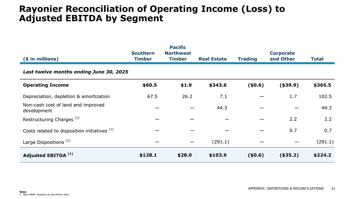 Rayonier Reconciliation of Operating Income (Loss) to Adjusted EBITDA by Segment Pacific Southern Northwest Corporate ($ in millions) Timber Timber Real Estate Trading and Other Total Last twelve months ending June 30, 2025 Operating Income $60.5 $1.9 $343.6 ($0.6) ($39.9) $365.5 Depreciation, depletion & amortization 67.5 26.2 7.1 — 1.7 102.5 Non-cash cost of land and improved — — 44.3 — — 44.3 development (1) — — — — 2.2 2.2 Restructuring Charges (1) — — — — 0.7 0.7 Costs related to disposition initiatives (1) — — (291.1) — — (291.1) Large Dispositions (1) $128.1 $28.0 $103.9 ($0.6) ($35.2) $224.2 Adjusted EBITDA APPENDIX: DEFINITIONS & RECONCILIATIONS 21 Note: 1. Non-GAAP measure or pro-forma item