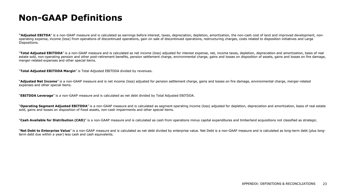 Non-GAAP Definitions “Adjusted EBITDA” is a non-GAAP measure and is calculated as earnings before interest, taxes, depreciation, depletion, amortization, the non-cash cost of land and improved development, non- operating expense, income (loss) from operations of discontinued operations, gain on sale of discontinued operations, restructuring charges, costs related to disposition initiatives and Large Dispositions. “Total Adjusted EBITDDA” is a non-GAAP measure and is calculated as net income (loss) adjusted for interest expense, net, income taxes, depletion, depreciation and amortization, basis of real estate sold, non-operating pension and other post-retirement benefits, pension settlement charge, environmental charge, gains and losses on disposition of assets, gains and losses on fire damage, merger-related expenses and other special items. “Total Adjusted EBITDDA Margin” is Total Adjusted EBITDDA divided by revenues. “Adjusted Net Income” is a non-GAAP measure and is net income (loss) adjusted for pension settlement charge, gains and losses on fire damage, environmental charge, merger-related expenses and other special items. “EBITDDA Leverage” is a non-GAAP measure and is calculated as net debt divided by Total Adjusted EBITDDA. “Operating Segment Adjusted EBITDDA” is a non-GAAP measure and is calculated as segment operating income (loss) adjusted for depletion, depreciation and amortization, basis of real estate sold, gains and losses on disposition of fixed assets, non-cash impairments and other special items. “Cash Available for Distribution (CAD)” is a non-GAAP measure and is calculated as cash from operations minus capital expenditures and timberland acquisitions not classified as strategic. “Net Debt to Enterprise Value” is a non-GAAP measure and is calculated as net debt divided by enterprise value. Net Debt is a non-GAAP measure and is calculated as long-term debt (plus long- term debt due within a year) less cash and cash equivalents. APPENDIX: DEFINITIONS & RECONCILIATIONS 23