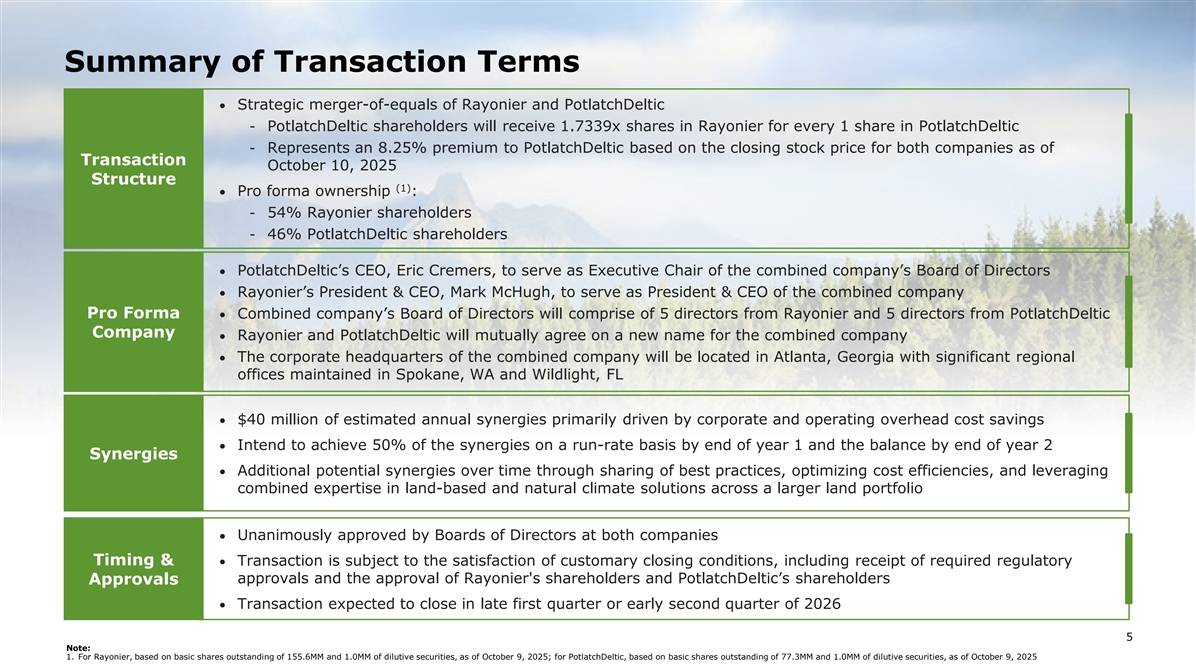 Rayonier + PotlatchDeltic: Compelling Strategic & Financial Rationale Strong Strategic Fit Compelling Financial Rationale ü Diversified timberland ownership with ~4.2 million acres in ü Significant value creation opportunity through synergies, highly attractive and productive regions; pro forma harvest operational efficiencies, and sharing of best practices volumes of ~15 million tons ü Accretive to per share metrics with estimated $40 million of ü Leading lumber producer well-positioned to benefit from run-rate synergies housing recovery with capital available for growth ü Strong pro forma balance sheet and credit metrics with pro (1) ü Enhanced platform to capture value from Real Estate and forma net leverage of ~2.5x Land-Based Solutions (LBS) / Natural Climate Solutions (NCS) ü Significant capital allocation capacity / flexibility as a ü Opportunity to further optimize the combined asset base combined company ü Well-aligned values and corporate culturesü Enhanced capital markets presence with combined market cap of ~$7.1Bn A Rayonier-PotlatchDeltic Combination Creates Significant Strategic and Financial Benefits Beyond What Either Company Could Achieve Independently 4 Note: 1. LTM as of June 30, 2025; net debt excludes special dividend and transaction costs