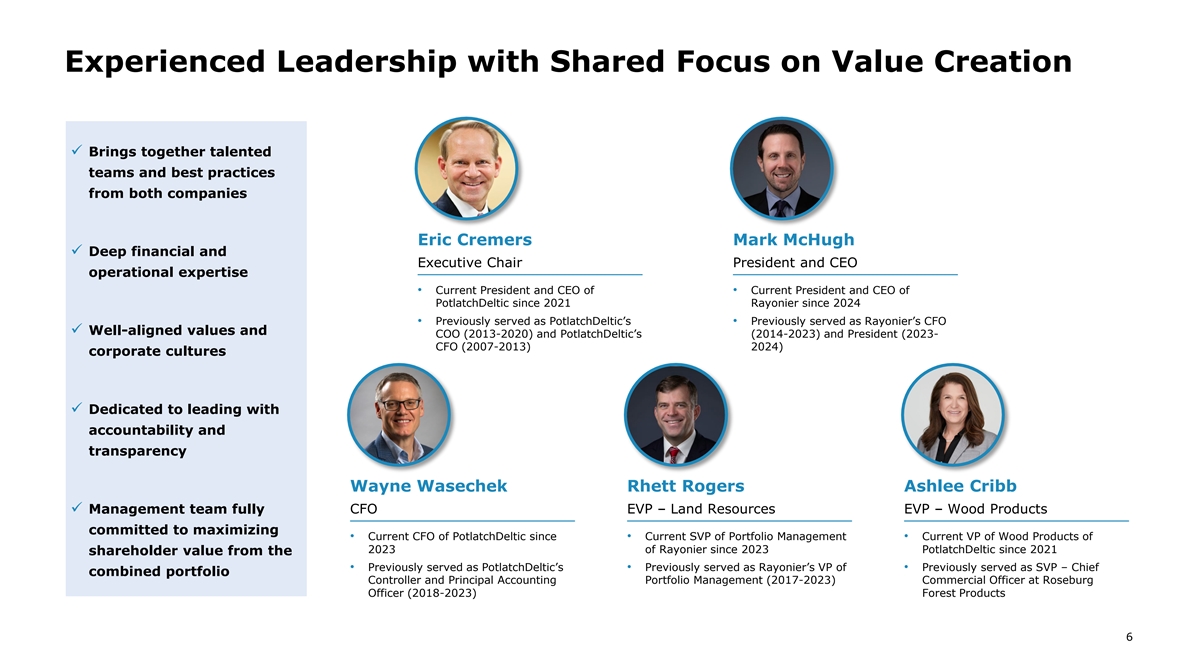 Summary of Transaction Terms • Strategic merger-of-equals of Rayonier and PotlatchDeltic - PotlatchDeltic shareholders will receive 1.7339x shares in Rayonier for every 1 share in PotlatchDeltic - Represents an 8.25% premium to PotlatchDeltic based on the closing stock price for both companies as of Transaction October 10, 2025 Structure (1) • Pro forma ownership : - 54% Rayonier shareholders - 46% PotlatchDeltic shareholders • PotlatchDeltic’s CEO, Eric Cremers, to serve as Executive Chair of the combined company’s Board of Directors • Rayonier’s President & CEO, Mark McHugh, to serve as President & CEO of the combined company Pro Forma • Combined company’s Board of Directors will comprise of 5 directors from Rayonier and 5 directors from PotlatchDeltic Company • Rayonier and PotlatchDeltic will mutually agree on a new name for the combined company • The corporate headquarters of the combined company will be located in Atlanta, Georgia with significant regional offices maintained in Spokane, WA and Wildlight, FL • $40 million of estimated annual synergies primarily driven by corporate and operating overhead cost savings • Intend to achieve 50% of the synergies on a run-rate basis by end of year 1 and the balance by end of year 2 Synergies • Additional potential synergies over time through sharing of best practices, optimizing cost efficiencies, and leveraging combined expertise in land-based and natural climate solutions across a larger land portfolio • Unanimously approved by Boards of Directors at both companies Timing & • Transaction is subject to the satisfaction of customary closing conditions, including receipt of required regulatory approvals and the approval of Rayonier's shareholders and PotlatchDeltic’s shareholders Approvals • Transaction expected to close in late first quarter or early second quarter of 2026 5 5 Note: 1. For Rayonier, based on basic shares outstanding of 155.6MM and 1.0MM of dilutive securities, as of October 9, 2025; for PotlatchDeltic, based on basic shares outstanding of 77.3MM and 1.0MM of dilutive securities, as of October 9, 2025