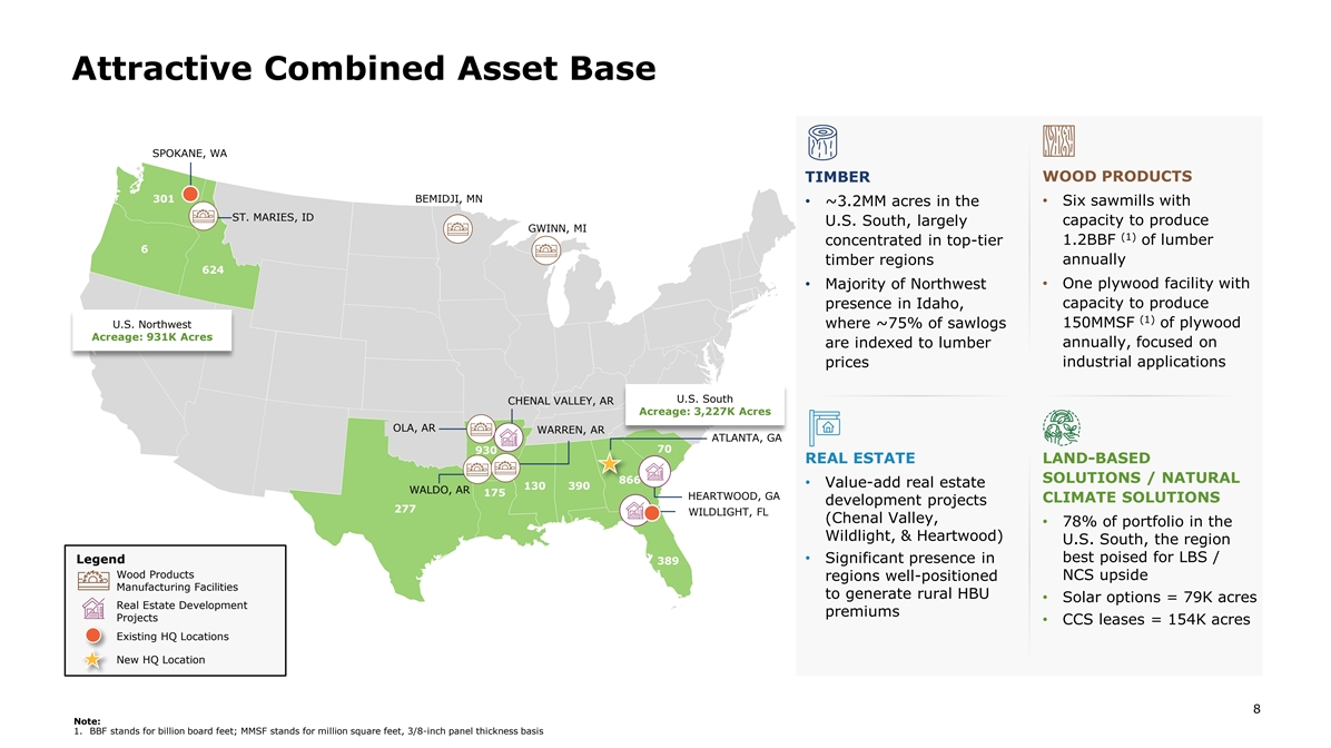 Combination Creates a Leading Land Resources Company Pro Forma Combined Key Combination Benefits $MM, unless noted otherwise (1) $3,922 $3,149 $7,071 Market Capitalization ü Unlocks 2x scale (3) (2) LTM Adj. EBITDA $224 $215 $439 / $479 ü Strong pro forma (2) (3) (4) LTM Net Leverage 0.7x 4.4x 2.5x / 2.3x balance sheet U.S. Northwest U.S. Northwest U.S. Northwest 30% 22% 15% ü Significant capital allocation capacity Timberlands Geographic Mix by Acres ü Best-in-class U.S. South U.S. South timberland portfolio U.S. South 85% 70% 78% with >75% in U.S. 2.0MM Acres 2.1MM Acres 4.2MM Acres South Wood Products Wood Products 5% 2% Real Real Real ü Diversified cash flows Estate Estate Estate 39% 37% 40% with significant upside Business Mix by (2) potential LTM Adj. EBITDA Timberlands Timberlands Timberlands 60% 58% 59% Source: Capital IQ as of October 10, 2025 7 Notes: 1. Calculated using share prices as of October 10, 2025 and basic shares outstanding as of last public filing 3. Excluding / including run-rate annual synergies of $40 million 2. Defined in the appendix; last twelve months as of June 30, 2025 4. Excludes special dividend and transaction costs
