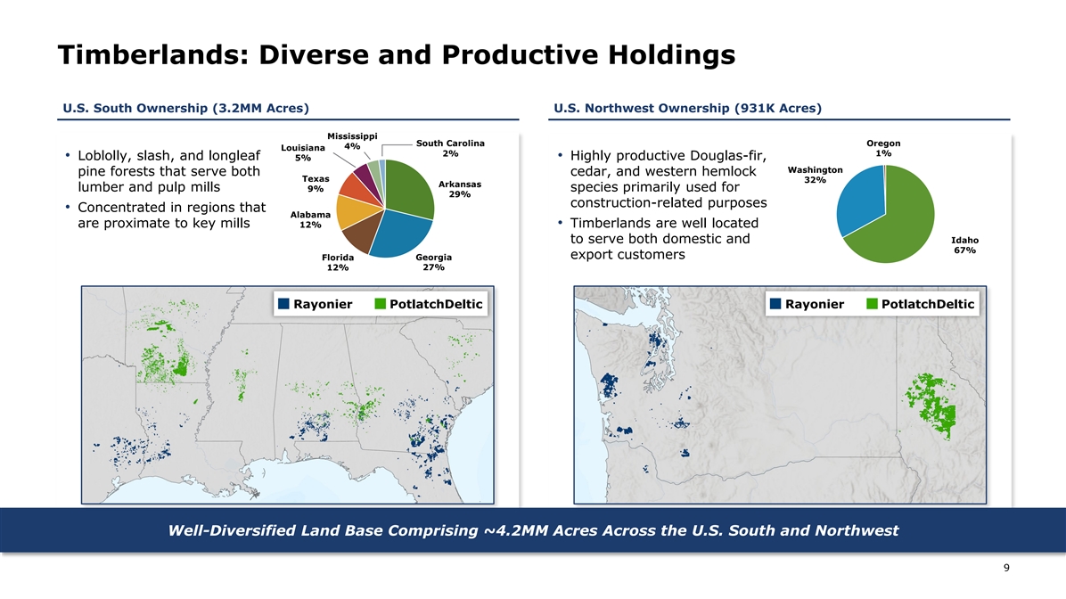 Timberlands: Diverse and Productive Holdings U.S. South Ownership (3.2MM Acres) U.S. Northwest Ownership (931K Acres) Mississippi South Carolina Oregon 4% Louisiana 2% 1% • Loblolly, slash, and longleaf • Highly productive Douglas-fir, 5% Washington pine forests that serve both cedar, and western hemlock Texas 32% Arkansas lumber and pulp mills species primarily used for 9% 29% construction-related purposes • Concentrated in regions that Alabama are proximate to key mills 12% • Timberlands are well located to serve both domestic and Idaho 67% export customers Florida Georgia 12% 27% Rayonier PotlatchDeltic Rayonier PotlatchDeltic Well-Diversified Land Base Comprising ~4.2MM Acres Across the U.S. South and Northwest 9