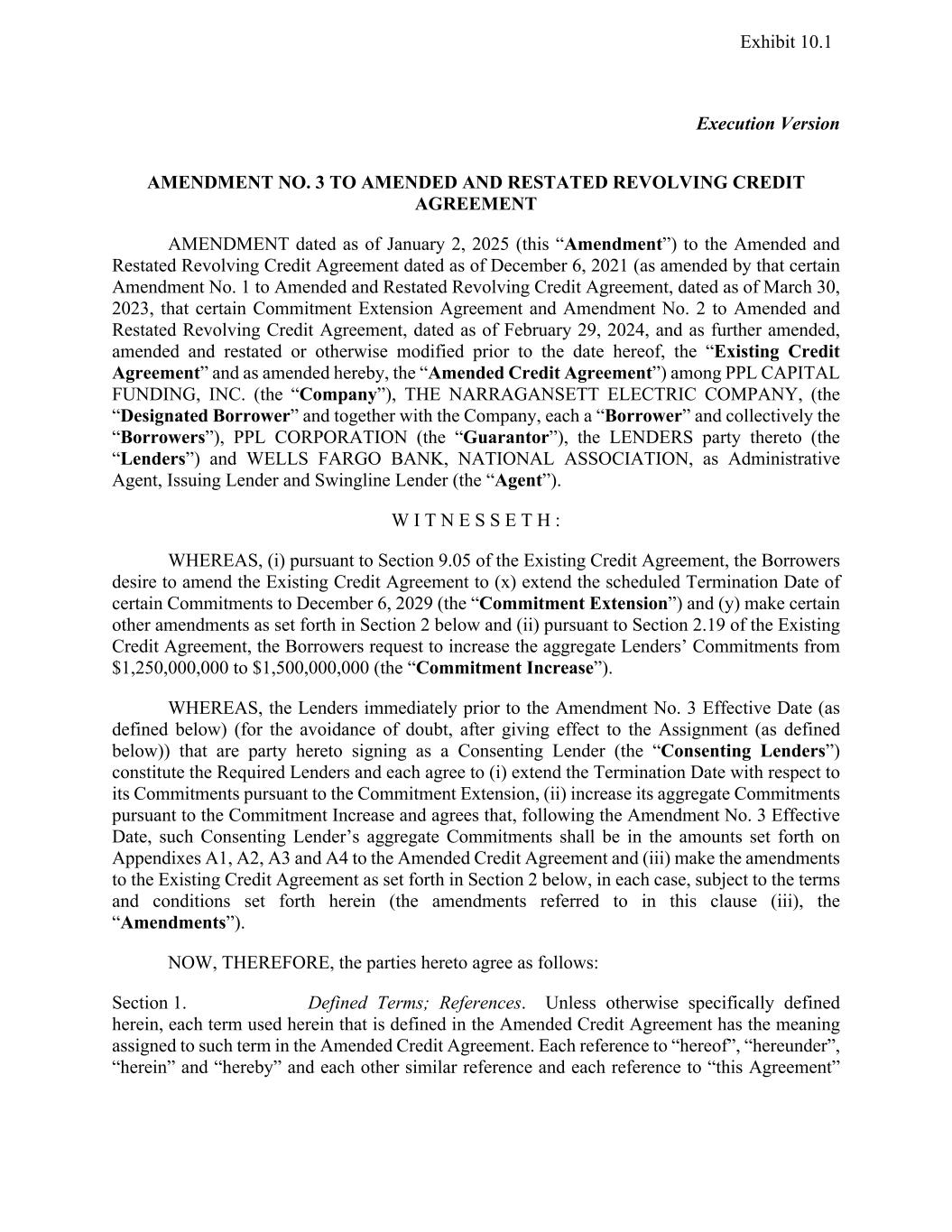 Execution Version AMENDMENT NO. 3 TO AMENDED AND RESTATED REVOLVING CREDIT AGREEMENT AMENDMENT dated as of January 2, 2025 (this “Amendment”) to the Amended and Restated Revolving Credit Agreement dated as of December 6, 2021 (as amended by that certain Amendment No. 1 to Amended and Restated Revolving Credit Agreement, dated as of March 30, 2023, that certain Commitment Extension Agreement and Amendment No. 2 to Amended and Restated Revolving Credit Agreement, dated as of February 29, 2024, and as further amended, amended and restated or otherwise modified prior to the date hereof, the “Existing Credit Agreement” and as amended hereby, the “Amended Credit Agreement”) among PPL CAPITAL FUNDING, INC. (the “Company”), THE NARRAGANSETT ELECTRIC COMPANY, (the “Designated Borrower” and together with the Company, each a “Borrower” and collectively the “Borrowers”), PPL CORPORATION (the “Guarantor”), the LENDERS party thereto (the “Lenders”) and WELLS FARGO BANK, NATIONAL ASSOCIATION, as Administrative Agent, Issuing Lender and Swingline Lender (the “Agent”). W I T N E S S E T H : WHEREAS, (i) pursuant to Section 9.05 of the Existing Credit Agreement, the Borrowers desire to amend the Existing Credit Agreement to (x) extend the scheduled Termination Date of certain Commitments to December 6, 2029 (the “Commitment Extension”) and (y) make certain other amendments as set forth in Section 2 below and (ii) pursuant to Section 2.19 of the Existing Credit Agreement, the Borrowers request to increase the aggregate Lenders’ Commitments from $1,250,000,000 to $1,500,000,000 (the “Commitment Increase”). WHEREAS, the Lenders immediately prior to the Amendment No. 3 Effective Date (as defined below) (for the avoidance of doubt, after giving effect to the Assignment (as defined below)) that are party hereto signing as a Consenting Lender (the “Consenting Lenders”) constitute the Required Lenders and each agree to (i) extend the Termination Date with respect to its Commitments pursuant to the Commitment Extension, (ii) increase its aggregate Commitments pursuant to the Commitment Increase and agrees that, following the Amendment No. 3 Effective Date, such Consenting Lender’s aggregate Commitments shall be in the amounts set forth on Appendixes A1, A2, A3 and A4 to the Amended Credit Agreement and (iii) make the amendments to the Existing Credit Agreement as set forth in Section 2 below, in each case, subject to the terms and conditions set forth herein (the amendments referred to in this clause (iii), the “Amendments”). NOW, THEREFORE, the parties hereto agree as follows: Section 1. Defined Terms; References. Unless otherwise specifically defined herein, each term used herein that is defined in the Amended Credit Agreement has the meaning assigned to such term in the Amended Credit Agreement. Each reference to “hereof”, “hereunder”, “herein” and “hereby” and each other similar reference and each reference to “this Agreement” Exhibit 10.1