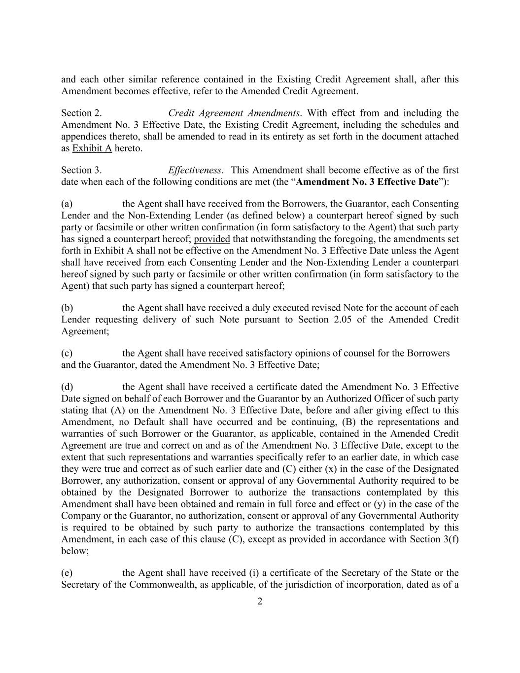 2 and each other similar reference contained in the Existing Credit Agreement shall, after this Amendment becomes effective, refer to the Amended Credit Agreement. Section 2. Credit Agreement Amendments. With effect from and including the Amendment No. 3 Effective Date, the Existing Credit Agreement, including the schedules and appendices thereto, shall be amended to read in its entirety as set forth in the document attached as Exhibit A hereto. Section 3. Effectiveness. This Amendment shall become effective as of the first date when each of the following conditions are met (the “Amendment No. 3 Effective Date”): (a) the Agent shall have received from the Borrowers, the Guarantor, each Consenting Lender and the Non-Extending Lender (as defined below) a counterpart hereof signed by such party or facsimile or other written confirmation (in form satisfactory to the Agent) that such party has signed a counterpart hereof; provided that notwithstanding the foregoing, the amendments set forth in Exhibit A shall not be effective on the Amendment No. 3 Effective Date unless the Agent shall have received from each Consenting Lender and the Non-Extending Lender a counterpart hereof signed by such party or facsimile or other written confirmation (in form satisfactory to the Agent) that such party has signed a counterpart hereof; (b) the Agent shall have received a duly executed revised Note for the account of each Lender requesting delivery of such Note pursuant to Section 2.05 of the Amended Credit Agreement; (c) the Agent shall have received satisfactory opinions of counsel for the Borrowers and the Guarantor, dated the Amendment No. 3 Effective Date; (d) the Agent shall have received a certificate dated the Amendment No. 3 Effective Date signed on behalf of each Borrower and the Guarantor by an Authorized Officer of such party stating that (A) on the Amendment No. 3 Effective Date, before and after giving effect to this Amendment, no Default shall have occurred and be continuing, (B) the representations and warranties of such Borrower or the Guarantor, as applicable, contained in the Amended Credit Agreement are true and correct on and as of the Amendment No. 3 Effective Date, except to the extent that such representations and warranties specifically refer to an earlier date, in which case they were true and correct as of such earlier date and (C) either (x) in the case of the Designated Borrower, any authorization, consent or approval of any Governmental Authority required to be obtained by the Designated Borrower to authorize the transactions contemplated by this Amendment shall have been obtained and remain in full force and effect or (y) in the case of the Company or the Guarantor, no authorization, consent or approval of any Governmental Authority is required to be obtained by such party to authorize the transactions contemplated by this Amendment, in each case of this clause (C), except as provided in accordance with Section 3(f) below; (e) the Agent shall have received (i) a certificate of the Secretary of the State or the Secretary of the Commonwealth, as applicable, of the jurisdiction of incorporation, dated as of a