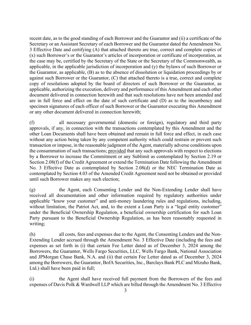 3 recent date, as to the good standing of each Borrower and the Guarantor and (ii) a certificate of the Secretary or an Assistant Secretary of each Borrower and the Guarantor dated the Amendment No. 3 Effective Date and certifying (A) that attached thereto are true, correct and complete copies of (x) such Borrower’s or the Guarantor’s articles of incorporation or certificate of incorporation, as the case may be, certified by the Secretary of the State or the Secretary of the Commonwealth, as applicable, in the applicable jurisdiction of incorporation and (y) the bylaws of such Borrower or the Guarantor, as applicable, (B) as to the absence of dissolution or liquidation proceedings by or against such Borrower or the Guarantor, (C) that attached thereto is a true, correct and complete copy of resolutions adopted by the board of directors of such Borrower or the Guarantor, as applicable, authorizing the execution, delivery and performance of this Amendment and each other document delivered in connection herewith and that such resolutions have not been amended and are in full force and effect on the date of such certificate and (D) as to the incumbency and specimen signatures of each officer of such Borrower or the Guarantor executing this Amendment or any other document delivered in connection herewith; (f) all necessary governmental (domestic or foreign), regulatory and third party approvals, if any, in connection with the transactions contemplated by this Amendment and the other Loan Documents shall have been obtained and remain in full force and effect, in each case without any action being taken by any competent authority which could restrain or prevent such transaction or impose, in the reasonable judgment of the Agent, materially adverse conditions upon the consummation of such transactions; provided that any such approvals with respect to elections by a Borrower to increase the Commitment or any Sublimit as contemplated by Section 2.19 or Section 2.08(f) of the Credit Agreement or extend the Termination Date following the Amendment No. 3 Effective Date as contemplated by Section 2.08(d) or the NEC Termination Date as contemplated by Section 4.03 of the Amended Credit Agreement need not be obtained or provided until such Borrower makes any such election; (g) the Agent, each Consenting Lender and the Non-Extending Lender shall have received all documentation and other information required by regulatory authorities under applicable “know your customer” and anti-money laundering rules and regulations, including, without limitation, the Patriot Act, and, to the extent a Loan Party is a “legal entity customer” under the Beneficial Ownership Regulation, a beneficial ownership certification for such Loan Party pursuant to the Beneficial Ownership Regulation, as has been reasonably requested in writing; (h) all costs, fees and expenses due to the Agent, the Consenting Lenders and the Non- Extending Lender accrued through the Amendment No. 3 Effective Date (including the fees and expenses as set forth in (i) that certain Fee Letter dated as of December 3, 2024 among the Borrowers, the Guarantor, Wells Fargo Securities, LLC, Wells Fargo Bank, National Association and JPMorgan Chase Bank, N.A. and (ii) that certain Fee Letter dated as of December 3, 2024 among the Borrowers, the Guarantor, BofA Securities, Inc., Barclays Bank PLC and Mizuho Bank, Ltd.) shall have been paid in full; (i) the Agent shall have received full payment from the Borrowers of the fees and expenses of Davis Polk & Wardwell LLP which are billed through the Amendment No. 3 Effective