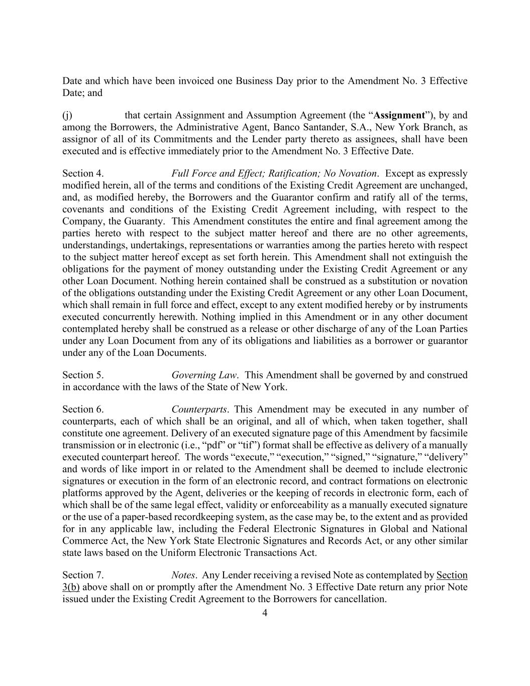 4 Date and which have been invoiced one Business Day prior to the Amendment No. 3 Effective Date; and (j) that certain Assignment and Assumption Agreement (the “Assignment”), by and among the Borrowers, the Administrative Agent, Banco Santander, S.A., New York Branch, as assignor of all of its Commitments and the Lender party thereto as assignees, shall have been executed and is effective immediately prior to the Amendment No. 3 Effective Date. Section 4. Full Force and Effect; Ratification; No Novation. Except as expressly modified herein, all of the terms and conditions of the Existing Credit Agreement are unchanged, and, as modified hereby, the Borrowers and the Guarantor confirm and ratify all of the terms, covenants and conditions of the Existing Credit Agreement including, with respect to the Company, the Guaranty. This Amendment constitutes the entire and final agreement among the parties hereto with respect to the subject matter hereof and there are no other agreements, understandings, undertakings, representations or warranties among the parties hereto with respect to the subject matter hereof except as set forth herein. This Amendment shall not extinguish the obligations for the payment of money outstanding under the Existing Credit Agreement or any other Loan Document. Nothing herein contained shall be construed as a substitution or novation of the obligations outstanding under the Existing Credit Agreement or any other Loan Document, which shall remain in full force and effect, except to any extent modified hereby or by instruments executed concurrently herewith. Nothing implied in this Amendment or in any other document contemplated hereby shall be construed as a release or other discharge of any of the Loan Parties under any Loan Document from any of its obligations and liabilities as a borrower or guarantor under any of the Loan Documents. Section 5. Governing Law. This Amendment shall be governed by and construed in accordance with the laws of the State of New York. Section 6. Counterparts. This Amendment may be executed in any number of counterparts, each of which shall be an original, and all of which, when taken together, shall constitute one agreement. Delivery of an executed signature page of this Amendment by facsimile transmission or in electronic (i.e., “pdf” or “tif”) format shall be effective as delivery of a manually executed counterpart hereof. The words “execute,” “execution,” “signed,” “signature,” “delivery” and words of like import in or related to the Amendment shall be deemed to include electronic signatures or execution in the form of an electronic record, and contract formations on electronic platforms approved by the Agent, deliveries or the keeping of records in electronic form, each of which shall be of the same legal effect, validity or enforceability as a manually executed signature or the use of a paper-based recordkeeping system, as the case may be, to the extent and as provided for in any applicable law, including the Federal Electronic Signatures in Global and National Commerce Act, the New York State Electronic Signatures and Records Act, or any other similar state laws based on the Uniform Electronic Transactions Act. Section 7. Notes. Any Lender receiving a revised Note as contemplated by Section 3(b) above shall on or promptly after the Amendment No. 3 Effective Date return any prior Note issued under the Existing Credit Agreement to the Borrowers for cancellation.