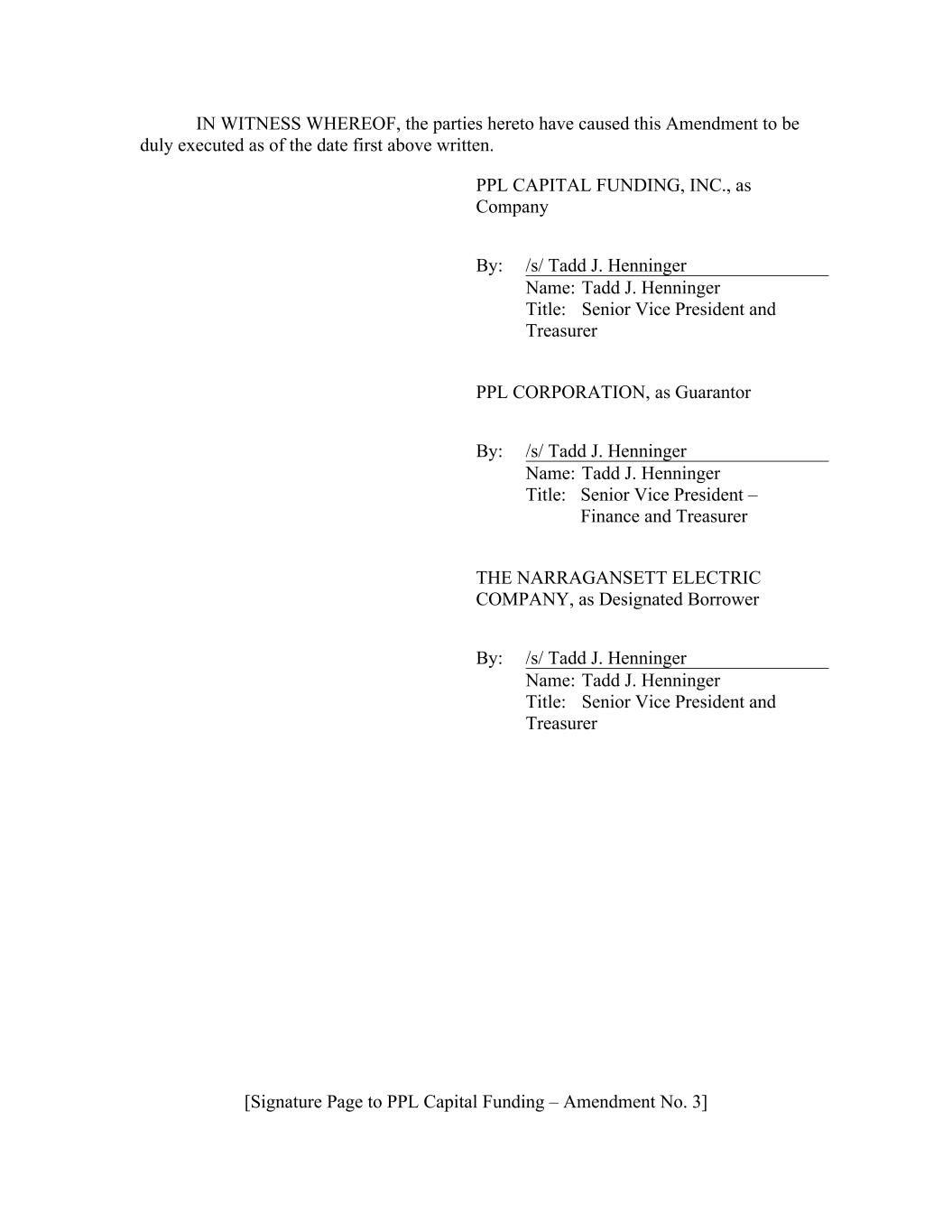 [Signature Page to PPL Capital Funding – Amendment No. 3] IN WITNESS WHEREOF, the parties hereto have caused this Amendment to be duly executed as of the date first above written. PPL CAPITAL FUNDING, INC., as Company By: /s/ Tadd J. Henninger Name: Tadd J. Henninger Title: Senior Vice President and Treasurer PPL CORPORATION, as Guarantor By: /s/ Tadd J. Henninger Name: Tadd J. Henninger Title: Senior Vice President – Finance and Treasurer THE NARRAGANSETT ELECTRIC COMPANY, as Designated Borrower By: /s/ Tadd J. Henninger Name: Tadd J. Henninger Title: Senior Vice President and Treasurer