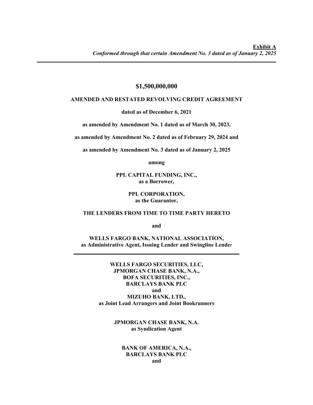 Exhibit A Conformed through that certain Amendment No. 3 dated as of January 2, 2025 $1,500,000,000 AMENDED AND RESTATED REVOLVING CREDIT AGREEMENT dated as of December 6, 2021 as amended by Amendment No. 1 dated as of March 30, 2023, as amended by Amendment No. 2 dated as of February 29, 2024 and as amended by Amendment No. 3 dated as of January 2, 2025 among PPL CAPITAL FUNDING, INC., as a Borrower, PPL CORPORATION, as the Guarantor, THE LENDERS FROM TIME TO TIME PARTY HERETO and WELLS FARGO BANK, NATIONAL ASSOCIATION, as Administrative Agent, Issuing Lender and Swingline Lender WELLS FARGO SECURITIES, LLC, JPMORGAN CHASE BANK, N.A., BOFA SECURITIES, INC., BARCLAYS BANK PLC and MIZUHO BANK, LTD., as Joint Lead Arrangers and Joint Bookrunners JPMORGAN CHASE BANK, N.A. as Syndication Agent BANK OF AMERICA, N.A., BARCLAYS BANK PLC and