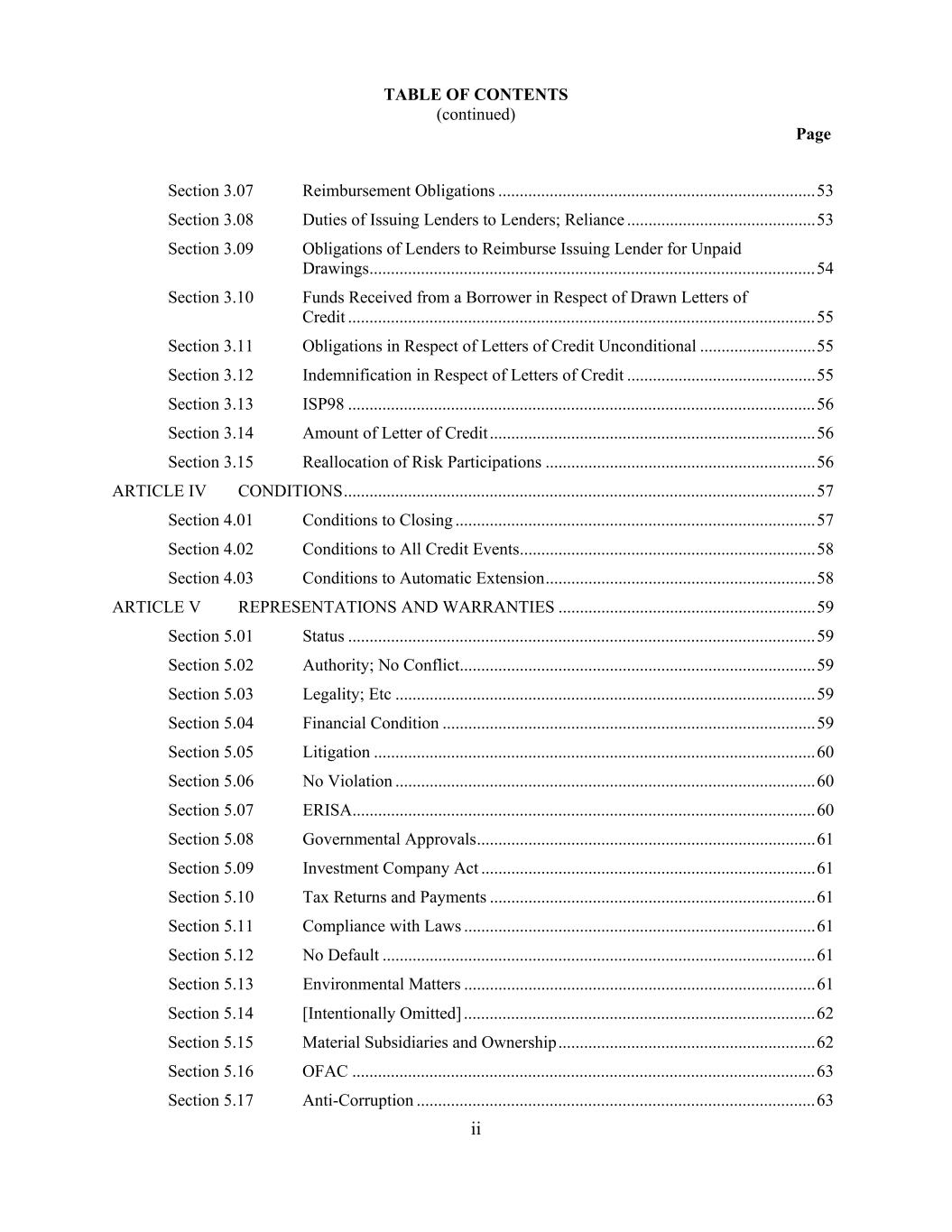 TABLE OF CONTENTS (continued) Page ii Section 3.07 Reimbursement Obligations .......................................................................... 53 Section 3.08 Duties of Issuing Lenders to Lenders; Reliance ............................................ 53 Section 3.09 Obligations of Lenders to Reimburse Issuing Lender for Unpaid Drawings ........................................................................................................ 54 Section 3.10 Funds Received from a Borrower in Respect of Drawn Letters of Credit ............................................................................................................. 55 Section 3.11 Obligations in Respect of Letters of Credit Unconditional ........................... 55 Section 3.12 Indemnification in Respect of Letters of Credit ............................................ 55 Section 3.13 ISP98 ............................................................................................................. 56 Section 3.14 Amount of Letter of Credit ............................................................................ 56 Section 3.15 Reallocation of Risk Participations ............................................................... 56 ARTICLE IV CONDITIONS .............................................................................................................. 57 Section 4.01 Conditions to Closing .................................................................................... 57 Section 4.02 Conditions to All Credit Events ..................................................................... 58 Section 4.03 Conditions to Automatic Extension ............................................................... 58 ARTICLE V REPRESENTATIONS AND WARRANTIES ............................................................ 59 Section 5.01 Status ............................................................................................................. 59 Section 5.02 Authority; No Conflict ................................................................................... 59 Section 5.03 Legality; Etc .................................................................................................. 59 Section 5.04 Financial Condition ....................................................................................... 59 Section 5.05 Litigation ....................................................................................................... 60 Section 5.06 No Violation .................................................................................................. 60 Section 5.07 ERISA ............................................................................................................ 60 Section 5.08 Governmental Approvals ............................................................................... 61 Section 5.09 Investment Company Act .............................................................................. 61 Section 5.10 Tax Returns and Payments ............................................................................ 61 Section 5.11 Compliance with Laws .................................................................................. 61 Section 5.12 No Default ..................................................................................................... 61 Section 5.13 Environmental Matters .................................................................................. 61 Section 5.14 [Intentionally Omitted] .................................................................................. 62 Section 5.15 Material Subsidiaries and Ownership ............................................................ 62 Section 5.16 OFAC ............................................................................................................ 63 Section 5.17 Anti-Corruption ............................................................................................. 63
