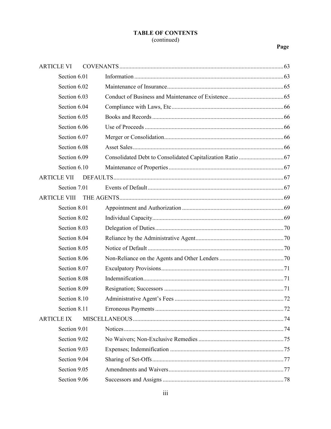TABLE OF CONTENTS (continued) Page iii ARTICLE VI COVENANTS .............................................................................................................. 63 Section 6.01 Information .................................................................................................... 63 Section 6.02 Maintenance of Insurance .............................................................................. 65 Section 6.03 Conduct of Business and Maintenance of Existence ..................................... 65 Section 6.04 Compliance with Laws, Etc ........................................................................... 66 Section 6.05 Books and Records ........................................................................................ 66 Section 6.06 Use of Proceeds ............................................................................................. 66 Section 6.07 Merger or Consolidation ................................................................................ 66 Section 6.08 Asset Sales ..................................................................................................... 66 Section 6.09 Consolidated Debt to Consolidated Capitalization Ratio .............................. 67 Section 6.10 Maintenance of Properties ............................................................................. 67 ARTICLE VII DEFAULTS .................................................................................................................. 67 Section 7.01 Events of Default ........................................................................................... 67 ARTICLE VIII THE AGENTS .............................................................................................................. 69 Section 8.01 Appointment and Authorization .................................................................... 69 Section 8.02 Individual Capacity ........................................................................................ 69 Section 8.03 Delegation of Duties ...................................................................................... 70 Section 8.04 Reliance by the Administrative Agent ........................................................... 70 Section 8.05 Notice of Default ........................................................................................... 70 Section 8.06 Non-Reliance on the Agents and Other Lenders ........................................... 70 Section 8.07 Exculpatory Provisions .................................................................................. 71 Section 8.08 Indemnification .............................................................................................. 71 Section 8.09 Resignation; Successors ................................................................................ 71 Section 8.10 Administrative Agent’s Fees ......................................................................... 72 Section 8.11 Erroneous Payments ...................................................................................... 72 ARTICLE IX MISCELLANEOUS ..................................................................................................... 74 Section 9.01 Notices ........................................................................................................... 74 Section 9.02 No Waivers; Non-Exclusive Remedies ......................................................... 75 Section 9.03 Expenses; Indemnification ............................................................................ 75 Section 9.04 Sharing of Set-Offs ........................................................................................ 77 Section 9.05 Amendments and Waivers ............................................................................. 77 Section 9.06 Successors and Assigns ................................................................................. 78