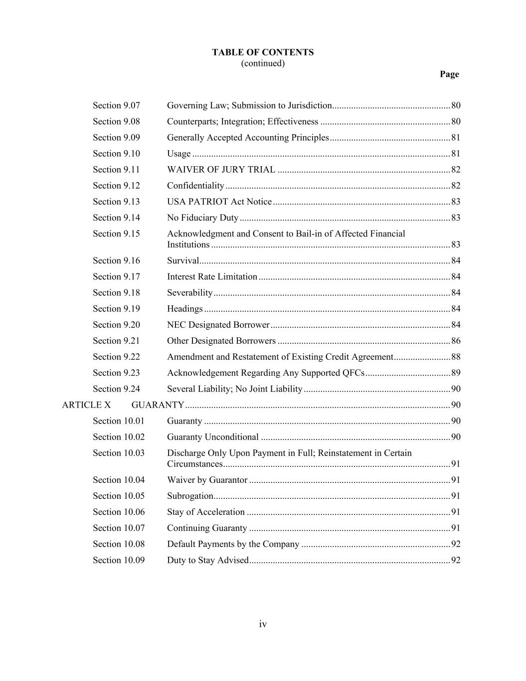 TABLE OF CONTENTS (continued) Page iv Section 9.07 Governing Law; Submission to Jurisdiction .................................................. 80 Section 9.08 Counterparts; Integration; Effectiveness ....................................................... 80 Section 9.09 Generally Accepted Accounting Principles ................................................... 81 Section 9.10 Usage ............................................................................................................. 81 Section 9.11 WAIVER OF JURY TRIAL ......................................................................... 82 Section 9.12 Confidentiality ............................................................................................... 82 Section 9.13 USA PATRIOT Act Notice ........................................................................... 83 Section 9.14 No Fiduciary Duty ......................................................................................... 83 Section 9.15 Acknowledgment and Consent to Bail-in of Affected Financial Institutions ..................................................................................................... 83 Section 9.16 Survival .......................................................................................................... 84 Section 9.17 Interest Rate Limitation ................................................................................. 84 Section 9.18 Severability .................................................................................................... 84 Section 9.19 Headings ........................................................................................................ 84 Section 9.20 NEC Designated Borrower ............................................................................ 84 Section 9.21 Other Designated Borrowers ......................................................................... 86 Section 9.22 Amendment and Restatement of Existing Credit Agreement ........................ 88 Section 9.23 Acknowledgement Regarding Any Supported QFCs .................................... 89 Section 9.24 Several Liability; No Joint Liability .............................................................. 90 ARTICLE X GUARANTY ................................................................................................................ 90 Section 10.01 Guaranty ........................................................................................................ 90 Section 10.02 Guaranty Unconditional ................................................................................ 90 Section 10.03 Discharge Only Upon Payment in Full; Reinstatement in Certain Circumstances ................................................................................................ 91 Section 10.04 Waiver by Guarantor ..................................................................................... 91 Section 10.05 Subrogation .................................................................................................... 91 Section 10.06 Stay of Acceleration ...................................................................................... 91 Section 10.07 Continuing Guaranty ..................................................................................... 91 Section 10.08 Default Payments by the Company ............................................................... 92 Section 10.09 Duty to Stay Advised ..................................................................................... 92