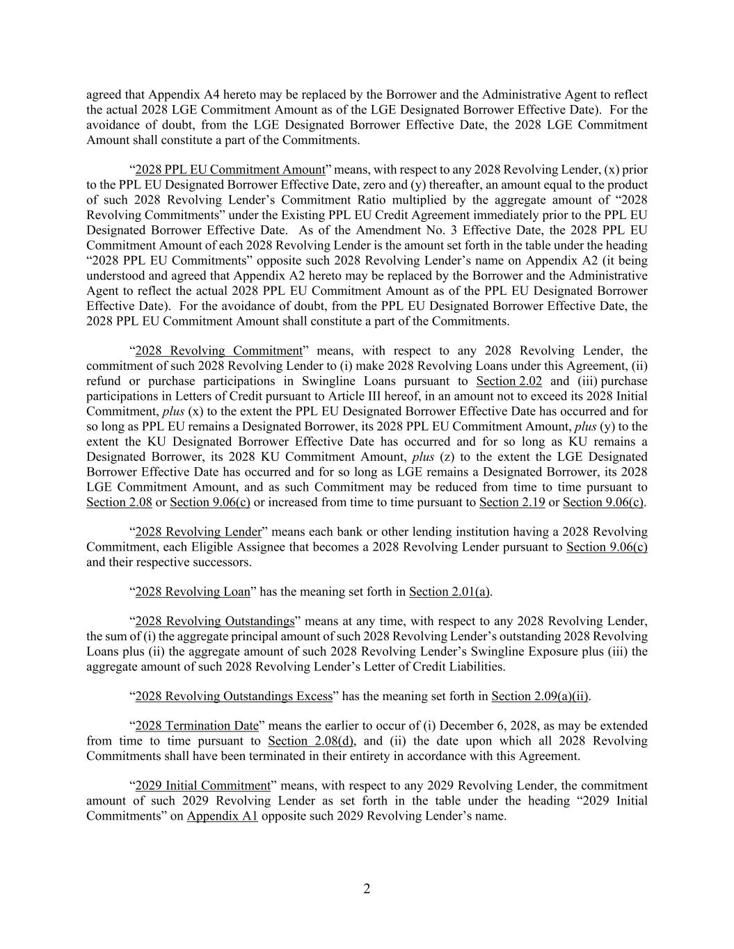 2 agreed that Appendix A4 hereto may be replaced by the Borrower and the Administrative Agent to reflect the actual 2028 LGE Commitment Amount as of the LGE Designated Borrower Effective Date). For the avoidance of doubt, from the LGE Designated Borrower Effective Date, the 2028 LGE Commitment Amount shall constitute a part of the Commitments. “2028 PPL EU Commitment Amount” means, with respect to any 2028 Revolving Lender, (x) prior to the PPL EU Designated Borrower Effective Date, zero and (y) thereafter, an amount equal to the product of such 2028 Revolving Lender’s Commitment Ratio multiplied by the aggregate amount of “2028 Revolving Commitments” under the Existing PPL EU Credit Agreement immediately prior to the PPL EU Designated Borrower Effective Date. As of the Amendment No. 3 Effective Date, the 2028 PPL EU Commitment Amount of each 2028 Revolving Lender is the amount set forth in the table under the heading “2028 PPL EU Commitments” opposite such 2028 Revolving Lender’s name on Appendix A2 (it being understood and agreed that Appendix A2 hereto may be replaced by the Borrower and the Administrative Agent to reflect the actual 2028 PPL EU Commitment Amount as of the PPL EU Designated Borrower Effective Date). For the avoidance of doubt, from the PPL EU Designated Borrower Effective Date, the 2028 PPL EU Commitment Amount shall constitute a part of the Commitments. “2028 Revolving Commitment” means, with respect to any 2028 Revolving Lender, the commitment of such 2028 Revolving Lender to (i) make 2028 Revolving Loans under this Agreement, (ii) refund or purchase participations in Swingline Loans pursuant to Section 2.02 and (iii) purchase participations in Letters of Credit pursuant to Article III hereof, in an amount not to exceed its 2028 Initial Commitment, plus (x) to the extent the PPL EU Designated Borrower Effective Date has occurred and for so long as PPL EU remains a Designated Borrower, its 2028 PPL EU Commitment Amount, plus (y) to the extent the KU Designated Borrower Effective Date has occurred and for so long as KU remains a Designated Borrower, its 2028 KU Commitment Amount, plus (z) to the extent the LGE Designated Borrower Effective Date has occurred and for so long as LGE remains a Designated Borrower, its 2028 LGE Commitment Amount, and as such Commitment may be reduced from time to time pursuant to Section 2.08 or Section 9.06(c) or increased from time to time pursuant to Section 2.19 or Section 9.06(c). “2028 Revolving Lender” means each bank or other lending institution having a 2028 Revolving Commitment, each Eligible Assignee that becomes a 2028 Revolving Lender pursuant to Section 9.06(c) and their respective successors. “2028 Revolving Loan” has the meaning set forth in Section 2.01(a). “2028 Revolving Outstandings” means at any time, with respect to any 2028 Revolving Lender, the sum of (i) the aggregate principal amount of such 2028 Revolving Lender’s outstanding 2028 Revolving Loans plus (ii) the aggregate amount of such 2028 Revolving Lender’s Swingline Exposure plus (iii) the aggregate amount of such 2028 Revolving Lender’s Letter of Credit Liabilities. “2028 Revolving Outstandings Excess” has the meaning set forth in Section 2.09(a)(ii). “2028 Termination Date” means the earlier to occur of (i) December 6, 2028, as may be extended from time to time pursuant to Section 2.08(d), and (ii) the date upon which all 2028 Revolving Commitments shall have been terminated in their entirety in accordance with this Agreement. “2029 Initial Commitment” means, with respect to any 2029 Revolving Lender, the commitment amount of such 2029 Revolving Lender as set forth in the table under the heading “2029 Initial Commitments” on Appendix A1 opposite such 2029 Revolving Lender’s name.
