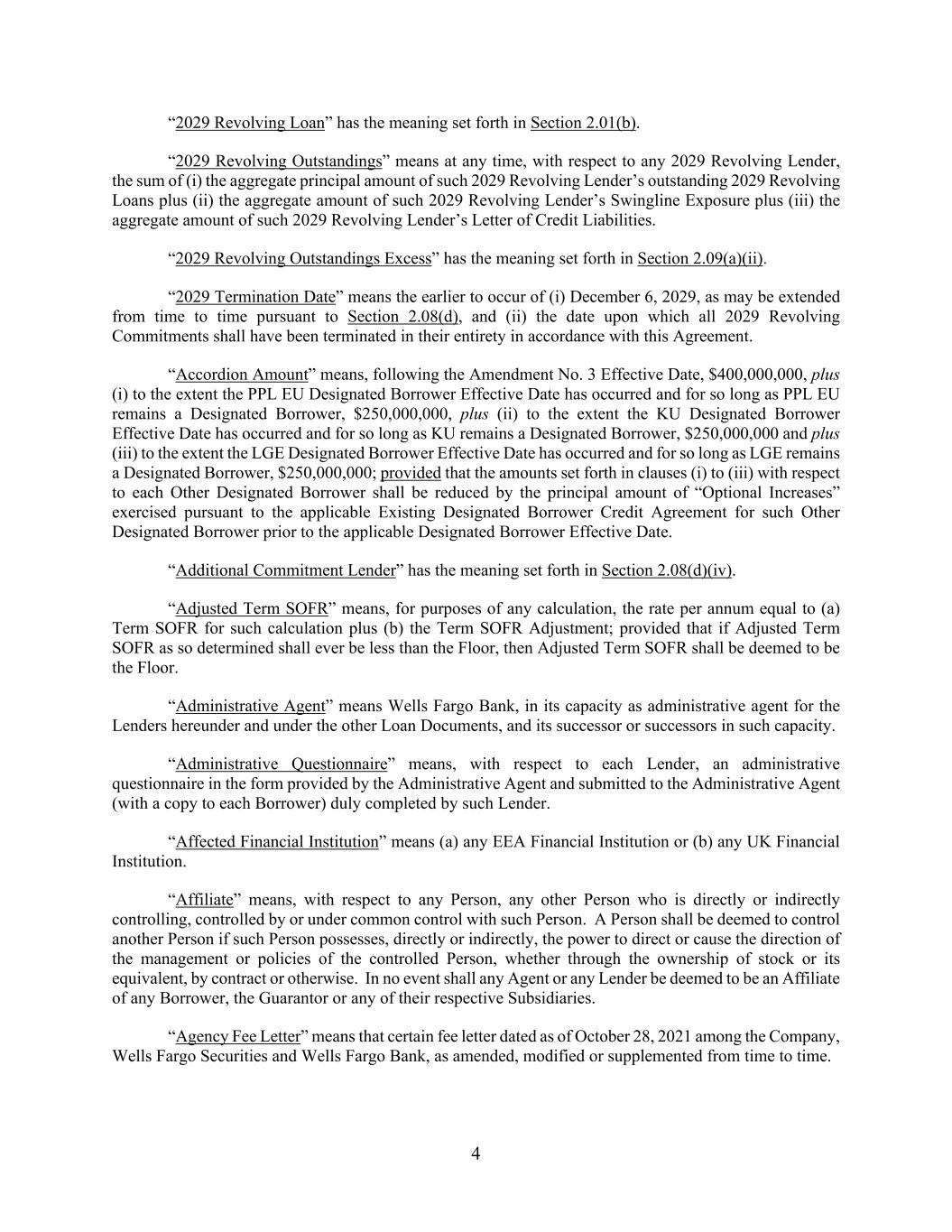 4 “2029 Revolving Loan” has the meaning set forth in Section 2.01(b). “2029 Revolving Outstandings” means at any time, with respect to any 2029 Revolving Lender, the sum of (i) the aggregate principal amount of such 2029 Revolving Lender’s outstanding 2029 Revolving Loans plus (ii) the aggregate amount of such 2029 Revolving Lender’s Swingline Exposure plus (iii) the aggregate amount of such 2029 Revolving Lender’s Letter of Credit Liabilities. “2029 Revolving Outstandings Excess” has the meaning set forth in Section 2.09(a)(ii). “2029 Termination Date” means the earlier to occur of (i) December 6, 2029, as may be extended from time to time pursuant to Section 2.08(d), and (ii) the date upon which all 2029 Revolving Commitments shall have been terminated in their entirety in accordance with this Agreement. “Accordion Amount” means, following the Amendment No. 3 Effective Date, $400,000,000, plus (i) to the extent the PPL EU Designated Borrower Effective Date has occurred and for so long as PPL EU remains a Designated Borrower, $250,000,000, plus (ii) to the extent the KU Designated Borrower Effective Date has occurred and for so long as KU remains a Designated Borrower, $250,000,000 and plus (iii) to the extent the LGE Designated Borrower Effective Date has occurred and for so long as LGE remains a Designated Borrower, $250,000,000; provided that the amounts set forth in clauses (i) to (iii) with respect to each Other Designated Borrower shall be reduced by the principal amount of “Optional Increases” exercised pursuant to the applicable Existing Designated Borrower Credit Agreement for such Other Designated Borrower prior to the applicable Designated Borrower Effective Date. “Additional Commitment Lender” has the meaning set forth in Section 2.08(d)(iv). “Adjusted Term SOFR” means, for purposes of any calculation, the rate per annum equal to (a) Term SOFR for such calculation plus (b) the Term SOFR Adjustment; provided that if Adjusted Term SOFR as so determined shall ever be less than the Floor, then Adjusted Term SOFR shall be deemed to be the Floor. “Administrative Agent” means Wells Fargo Bank, in its capacity as administrative agent for the Lenders hereunder and under the other Loan Documents, and its successor or successors in such capacity. “Administrative Questionnaire” means, with respect to each Lender, an administrative questionnaire in the form provided by the Administrative Agent and submitted to the Administrative Agent (with a copy to each Borrower) duly completed by such Lender. “Affected Financial Institution” means (a) any EEA Financial Institution or (b) any UK Financial Institution. “Affiliate” means, with respect to any Person, any other Person who is directly or indirectly controlling, controlled by or under common control with such Person. A Person shall be deemed to control another Person if such Person possesses, directly or indirectly, the power to direct or cause the direction of the management or policies of the controlled Person, whether through the ownership of stock or its equivalent, by contract or otherwise. In no event shall any Agent or any Lender be deemed to be an Affiliate of any Borrower, the Guarantor or any of their respective Subsidiaries. “Agency Fee Letter” means that certain fee letter dated as of October 28, 2021 among the Company, Wells Fargo Securities and Wells Fargo Bank, as amended, modified or supplemented from time to time.