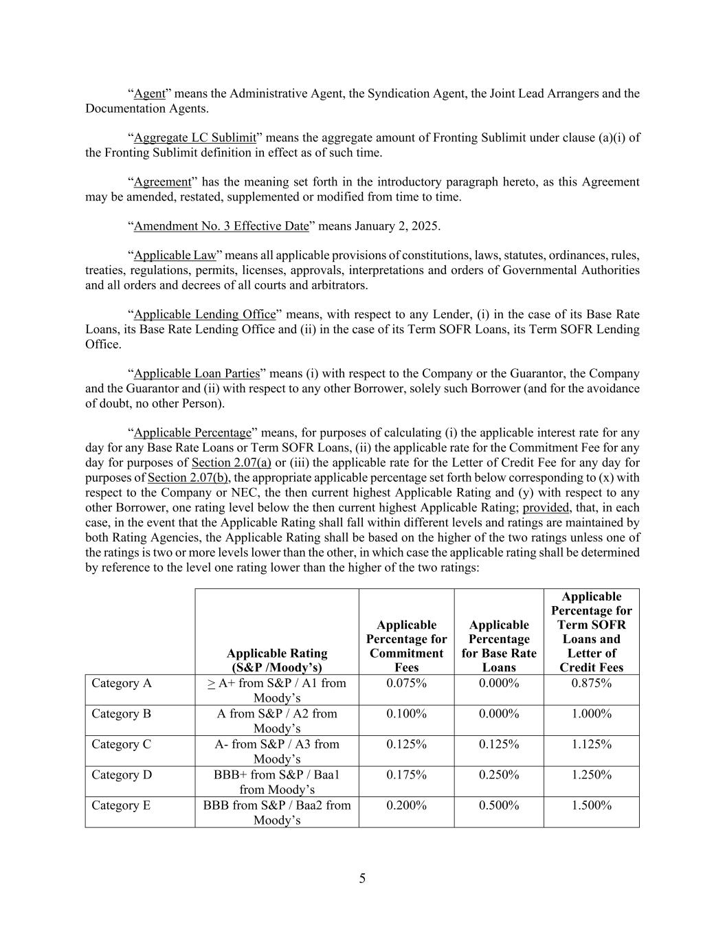 5 “Agent” means the Administrative Agent, the Syndication Agent, the Joint Lead Arrangers and the Documentation Agents. “Aggregate LC Sublimit” means the aggregate amount of Fronting Sublimit under clause (a)(i) of the Fronting Sublimit definition in effect as of such time. “Agreement” has the meaning set forth in the introductory paragraph hereto, as this Agreement may be amended, restated, supplemented or modified from time to time. “Amendment No. 3 Effective Date” means January 2, 2025. “Applicable Law” means all applicable provisions of constitutions, laws, statutes, ordinances, rules, treaties, regulations, permits, licenses, approvals, interpretations and orders of Governmental Authorities and all orders and decrees of all courts and arbitrators. “Applicable Lending Office” means, with respect to any Lender, (i) in the case of its Base Rate Loans, its Base Rate Lending Office and (ii) in the case of its Term SOFR Loans, its Term SOFR Lending Office. “Applicable Loan Parties” means (i) with respect to the Company or the Guarantor, the Company and the Guarantor and (ii) with respect to any other Borrower, solely such Borrower (and for the avoidance of doubt, no other Person). “Applicable Percentage” means, for purposes of calculating (i) the applicable interest rate for any day for any Base Rate Loans or Term SOFR Loans, (ii) the applicable rate for the Commitment Fee for any day for purposes of Section 2.07(a) or (iii) the applicable rate for the Letter of Credit Fee for any day for purposes of Section 2.07(b), the appropriate applicable percentage set forth below corresponding to (x) with respect to the Company or NEC, the then current highest Applicable Rating and (y) with respect to any other Borrower, one rating level below the then current highest Applicable Rating; provided, that, in each case, in the event that the Applicable Rating shall fall within different levels and ratings are maintained by both Rating Agencies, the Applicable Rating shall be based on the higher of the two ratings unless one of the ratings is two or more levels lower than the other, in which case the applicable rating shall be determined by reference to the level one rating lower than the higher of the two ratings: Applicable Rating (S&P /Moody’s) Applicable Percentage for Commitment Fees Applicable Percentage for Base Rate Loans Applicable Percentage for Term SOFR Loans and Letter of Credit Fees Category A > A+ from S&P / A1 from Moody’s 0.075% 0.000% 0.875% Category B A from S&P / A2 from Moody’s 0.100% 0.000% 1.000% Category C A- from S&P / A3 from Moody’s 0.125% 0.125% 1.125% Category D BBB+ from S&P / Baa1 from Moody’s 0.175% 0.250% 1.250% Category E BBB from S&P / Baa2 from Moody’s 0.200% 0.500% 1.500%