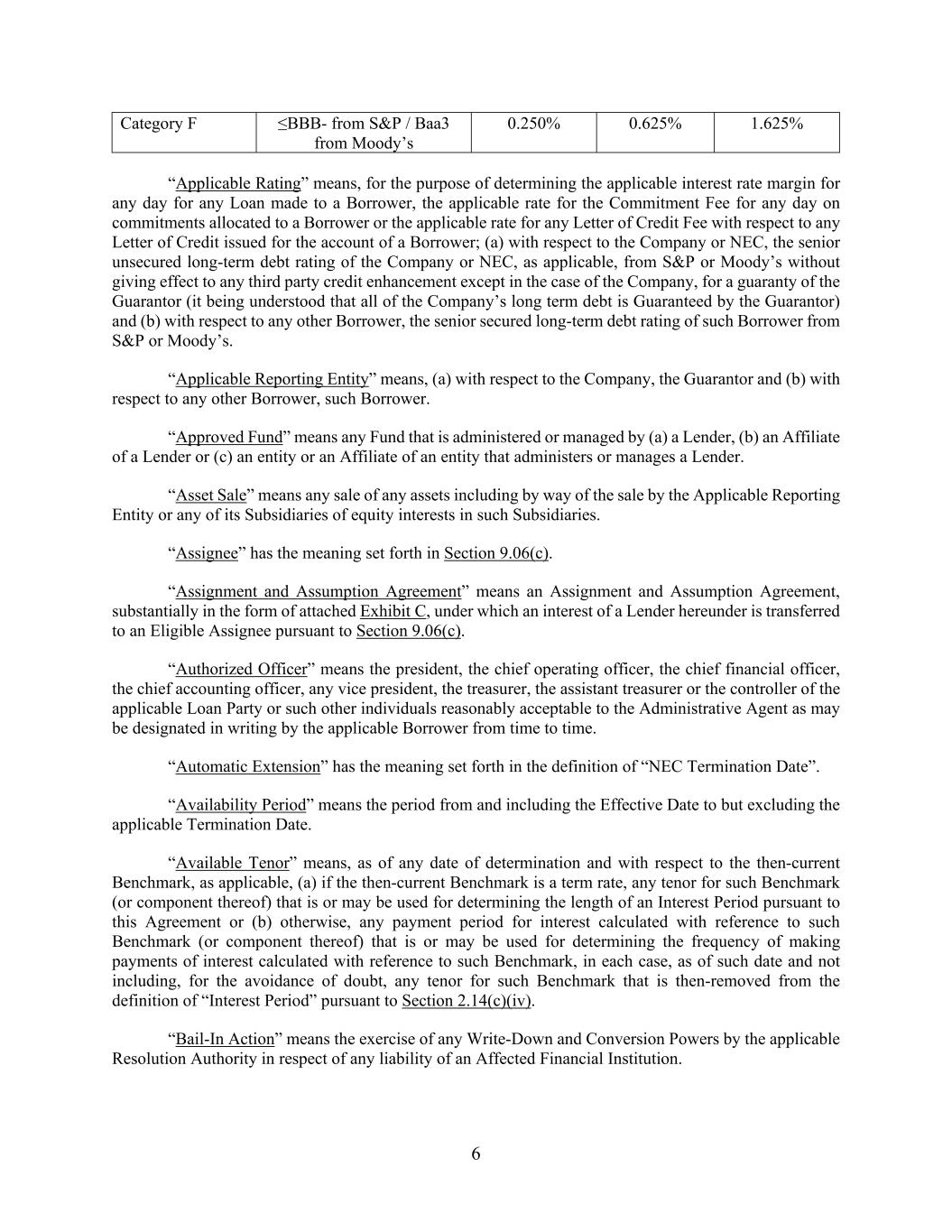 6 Category F ≤BBB- from S&P / Baa3 from Moody’s 0.250% 0.625% 1.625% “Applicable Rating” means, for the purpose of determining the applicable interest rate margin for any day for any Loan made to a Borrower, the applicable rate for the Commitment Fee for any day on commitments allocated to a Borrower or the applicable rate for any Letter of Credit Fee with respect to any Letter of Credit issued for the account of a Borrower; (a) with respect to the Company or NEC, the senior unsecured long-term debt rating of the Company or NEC, as applicable, from S&P or Moody’s without giving effect to any third party credit enhancement except in the case of the Company, for a guaranty of the Guarantor (it being understood that all of the Company’s long term debt is Guaranteed by the Guarantor) and (b) with respect to any other Borrower, the senior secured long-term debt rating of such Borrower from S&P or Moody’s. “Applicable Reporting Entity” means, (a) with respect to the Company, the Guarantor and (b) with respect to any other Borrower, such Borrower. “Approved Fund” means any Fund that is administered or managed by (a) a Lender, (b) an Affiliate of a Lender or (c) an entity or an Affiliate of an entity that administers or manages a Lender. “Asset Sale” means any sale of any assets including by way of the sale by the Applicable Reporting Entity or any of its Subsidiaries of equity interests in such Subsidiaries. “Assignee” has the meaning set forth in Section 9.06(c). “Assignment and Assumption Agreement” means an Assignment and Assumption Agreement, substantially in the form of attached Exhibit C, under which an interest of a Lender hereunder is transferred to an Eligible Assignee pursuant to Section 9.06(c). “Authorized Officer” means the president, the chief operating officer, the chief financial officer, the chief accounting officer, any vice president, the treasurer, the assistant treasurer or the controller of the applicable Loan Party or such other individuals reasonably acceptable to the Administrative Agent as may be designated in writing by the applicable Borrower from time to time. “Automatic Extension” has the meaning set forth in the definition of “NEC Termination Date”. “Availability Period” means the period from and including the Effective Date to but excluding the applicable Termination Date. “Available Tenor” means, as of any date of determination and with respect to the then-current Benchmark, as applicable, (a) if the then-current Benchmark is a term rate, any tenor for such Benchmark (or component thereof) that is or may be used for determining the length of an Interest Period pursuant to this Agreement or (b) otherwise, any payment period for interest calculated with reference to such Benchmark (or component thereof) that is or may be used for determining the frequency of making payments of interest calculated with reference to such Benchmark, in each case, as of such date and not including, for the avoidance of doubt, any tenor for such Benchmark that is then-removed from the definition of “Interest Period” pursuant to Section 2.14(c)(iv). “Bail-In Action” means the exercise of any Write-Down and Conversion Powers by the applicable Resolution Authority in respect of any liability of an Affected Financial Institution.