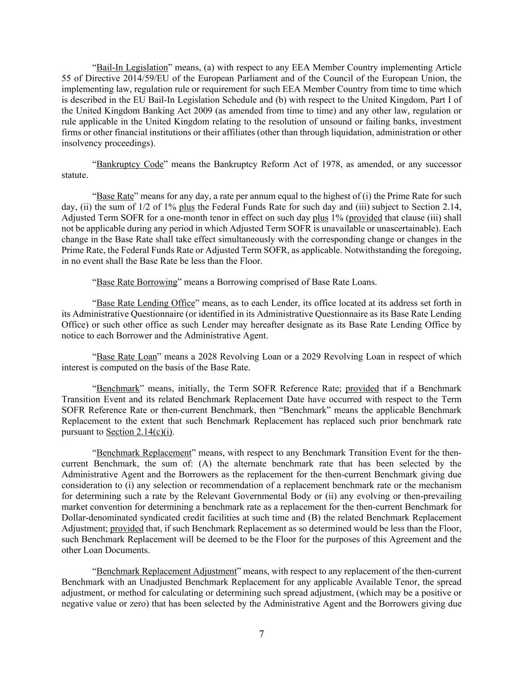 7 “Bail-In Legislation” means, (a) with respect to any EEA Member Country implementing Article 55 of Directive 2014/59/EU of the European Parliament and of the Council of the European Union, the implementing law, regulation rule or requirement for such EEA Member Country from time to time which is described in the EU Bail-In Legislation Schedule and (b) with respect to the United Kingdom, Part I of the United Kingdom Banking Act 2009 (as amended from time to time) and any other law, regulation or rule applicable in the United Kingdom relating to the resolution of unsound or failing banks, investment firms or other financial institutions or their affiliates (other than through liquidation, administration or other insolvency proceedings). “Bankruptcy Code” means the Bankruptcy Reform Act of 1978, as amended, or any successor statute. “Base Rate” means for any day, a rate per annum equal to the highest of (i) the Prime Rate for such day, (ii) the sum of 1/2 of 1% plus the Federal Funds Rate for such day and (iii) subject to Section 2.14, Adjusted Term SOFR for a one-month tenor in effect on such day plus 1% (provided that clause (iii) shall not be applicable during any period in which Adjusted Term SOFR is unavailable or unascertainable). Each change in the Base Rate shall take effect simultaneously with the corresponding change or changes in the Prime Rate, the Federal Funds Rate or Adjusted Term SOFR, as applicable. Notwithstanding the foregoing, in no event shall the Base Rate be less than the Floor. “Base Rate Borrowing” means a Borrowing comprised of Base Rate Loans. “Base Rate Lending Office” means, as to each Lender, its office located at its address set forth in its Administrative Questionnaire (or identified in its Administrative Questionnaire as its Base Rate Lending Office) or such other office as such Lender may hereafter designate as its Base Rate Lending Office by notice to each Borrower and the Administrative Agent. “Base Rate Loan” means a 2028 Revolving Loan or a 2029 Revolving Loan in respect of which interest is computed on the basis of the Base Rate. “Benchmark” means, initially, the Term SOFR Reference Rate; provided that if a Benchmark Transition Event and its related Benchmark Replacement Date have occurred with respect to the Term SOFR Reference Rate or then-current Benchmark, then “Benchmark” means the applicable Benchmark Replacement to the extent that such Benchmark Replacement has replaced such prior benchmark rate pursuant to Section 2.14(c)(i). “Benchmark Replacement” means, with respect to any Benchmark Transition Event for the then- current Benchmark, the sum of: (A) the alternate benchmark rate that has been selected by the Administrative Agent and the Borrowers as the replacement for the then-current Benchmark giving due consideration to (i) any selection or recommendation of a replacement benchmark rate or the mechanism for determining such a rate by the Relevant Governmental Body or (ii) any evolving or then-prevailing market convention for determining a benchmark rate as a replacement for the then-current Benchmark for Dollar-denominated syndicated credit facilities at such time and (B) the related Benchmark Replacement Adjustment; provided that, if such Benchmark Replacement as so determined would be less than the Floor, such Benchmark Replacement will be deemed to be the Floor for the purposes of this Agreement and the other Loan Documents. “Benchmark Replacement Adjustment” means, with respect to any replacement of the then-current Benchmark with an Unadjusted Benchmark Replacement for any applicable Available Tenor, the spread adjustment, or method for calculating or determining such spread adjustment, (which may be a positive or negative value or zero) that has been selected by the Administrative Agent and the Borrowers giving due