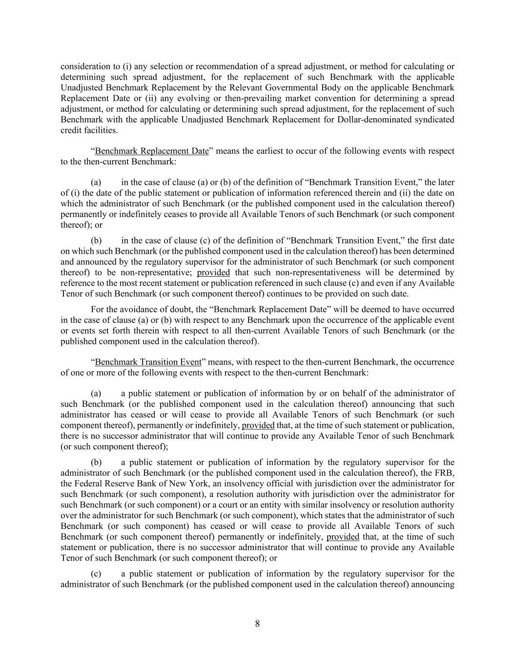 8 consideration to (i) any selection or recommendation of a spread adjustment, or method for calculating or determining such spread adjustment, for the replacement of such Benchmark with the applicable Unadjusted Benchmark Replacement by the Relevant Governmental Body on the applicable Benchmark Replacement Date or (ii) any evolving or then-prevailing market convention for determining a spread adjustment, or method for calculating or determining such spread adjustment, for the replacement of such Benchmark with the applicable Unadjusted Benchmark Replacement for Dollar-denominated syndicated credit facilities. “Benchmark Replacement Date” means the earliest to occur of the following events with respect to the then-current Benchmark: (a) in the case of clause (a) or (b) of the definition of “Benchmark Transition Event,” the later of (i) the date of the public statement or publication of information referenced therein and (ii) the date on which the administrator of such Benchmark (or the published component used in the calculation thereof) permanently or indefinitely ceases to provide all Available Tenors of such Benchmark (or such component thereof); or (b) in the case of clause (c) of the definition of “Benchmark Transition Event,” the first date on which such Benchmark (or the published component used in the calculation thereof) has been determined and announced by the regulatory supervisor for the administrator of such Benchmark (or such component thereof) to be non-representative; provided that such non-representativeness will be determined by reference to the most recent statement or publication referenced in such clause (c) and even if any Available Tenor of such Benchmark (or such component thereof) continues to be provided on such date. For the avoidance of doubt, the “Benchmark Replacement Date” will be deemed to have occurred in the case of clause (a) or (b) with respect to any Benchmark upon the occurrence of the applicable event or events set forth therein with respect to all then-current Available Tenors of such Benchmark (or the published component used in the calculation thereof). “Benchmark Transition Event” means, with respect to the then-current Benchmark, the occurrence of one or more of the following events with respect to the then-current Benchmark: (a) a public statement or publication of information by or on behalf of the administrator of such Benchmark (or the published component used in the calculation thereof) announcing that such administrator has ceased or will cease to provide all Available Tenors of such Benchmark (or such component thereof), permanently or indefinitely, provided that, at the time of such statement or publication, there is no successor administrator that will continue to provide any Available Tenor of such Benchmark (or such component thereof); (b) a public statement or publication of information by the regulatory supervisor for the administrator of such Benchmark (or the published component used in the calculation thereof), the FRB, the Federal Reserve Bank of New York, an insolvency official with jurisdiction over the administrator for such Benchmark (or such component), a resolution authority with jurisdiction over the administrator for such Benchmark (or such component) or a court or an entity with similar insolvency or resolution authority over the administrator for such Benchmark (or such component), which states that the administrator of such Benchmark (or such component) has ceased or will cease to provide all Available Tenors of such Benchmark (or such component thereof) permanently or indefinitely, provided that, at the time of such statement or publication, there is no successor administrator that will continue to provide any Available Tenor of such Benchmark (or such component thereof); or (c) a public statement or publication of information by the regulatory supervisor for the administrator of such Benchmark (or the published component used in the calculation thereof) announcing
