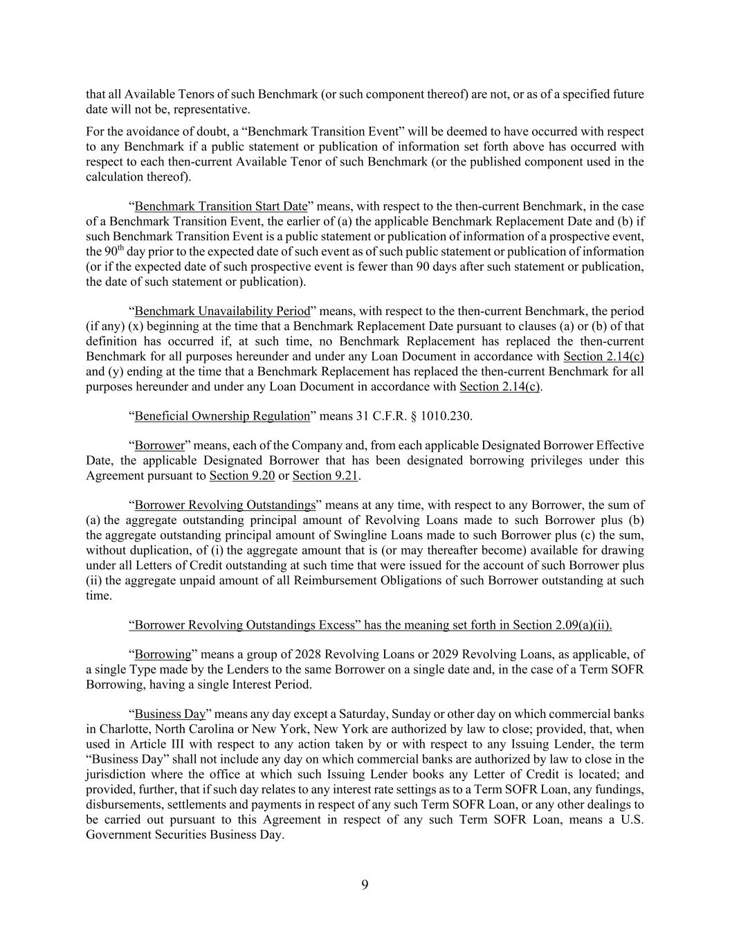 9 that all Available Tenors of such Benchmark (or such component thereof) are not, or as of a specified future date will not be, representative. For the avoidance of doubt, a “Benchmark Transition Event” will be deemed to have occurred with respect to any Benchmark if a public statement or publication of information set forth above has occurred with respect to each then-current Available Tenor of such Benchmark (or the published component used in the calculation thereof). “Benchmark Transition Start Date” means, with respect to the then-current Benchmark, in the case of a Benchmark Transition Event, the earlier of (a) the applicable Benchmark Replacement Date and (b) if such Benchmark Transition Event is a public statement or publication of information of a prospective event, the 90th day prior to the expected date of such event as of such public statement or publication of information (or if the expected date of such prospective event is fewer than 90 days after such statement or publication, the date of such statement or publication). “Benchmark Unavailability Period” means, with respect to the then-current Benchmark, the period (if any) (x) beginning at the time that a Benchmark Replacement Date pursuant to clauses (a) or (b) of that definition has occurred if, at such time, no Benchmark Replacement has replaced the then-current Benchmark for all purposes hereunder and under any Loan Document in accordance with Section 2.14(c) and (y) ending at the time that a Benchmark Replacement has replaced the then-current Benchmark for all purposes hereunder and under any Loan Document in accordance with Section 2.14(c). “Beneficial Ownership Regulation” means 31 C.F.R. § 1010.230. “Borrower” means, each of the Company and, from each applicable Designated Borrower Effective Date, the applicable Designated Borrower that has been designated borrowing privileges under this Agreement pursuant to Section 9.20 or Section 9.21. “Borrower Revolving Outstandings” means at any time, with respect to any Borrower, the sum of (a) the aggregate outstanding principal amount of Revolving Loans made to such Borrower plus (b) the aggregate outstanding principal amount of Swingline Loans made to such Borrower plus (c) the sum, without duplication, of (i) the aggregate amount that is (or may thereafter become) available for drawing under all Letters of Credit outstanding at such time that were issued for the account of such Borrower plus (ii) the aggregate unpaid amount of all Reimbursement Obligations of such Borrower outstanding at such time. “Borrower Revolving Outstandings Excess” has the meaning set forth in Section 2.09(a)(ii). “Borrowing” means a group of 2028 Revolving Loans or 2029 Revolving Loans, as applicable, of a single Type made by the Lenders to the same Borrower on a single date and, in the case of a Term SOFR Borrowing, having a single Interest Period. “Business Day” means any day except a Saturday, Sunday or other day on which commercial banks in Charlotte, North Carolina or New York, New York are authorized by law to close; provided, that, when used in Article III with respect to any action taken by or with respect to any Issuing Lender, the term “Business Day” shall not include any day on which commercial banks are authorized by law to close in the jurisdiction where the office at which such Issuing Lender books any Letter of Credit is located; and provided, further, that if such day relates to any interest rate settings as to a Term SOFR Loan, any fundings, disbursements, settlements and payments in respect of any such Term SOFR Loan, or any other dealings to be carried out pursuant to this Agreement in respect of any such Term SOFR Loan, means a U.S. Government Securities Business Day.