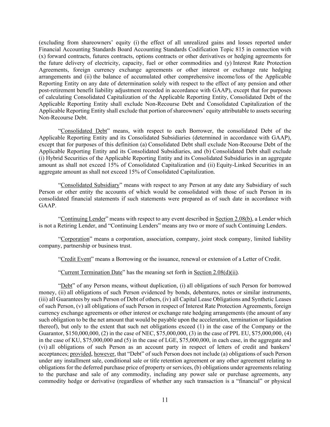11 (excluding from shareowners’ equity (i) the effect of all unrealized gains and losses reported under Financial Accounting Standards Board Accounting Standards Codification Topic 815 in connection with (x) forward contracts, futures contracts, options contracts or other derivatives or hedging agreements for the future delivery of electricity, capacity, fuel or other commodities and (y) Interest Rate Protection Agreements, foreign currency exchange agreements or other interest or exchange rate hedging arrangements and (ii) the balance of accumulated other comprehensive income/loss of the Applicable Reporting Entity on any date of determination solely with respect to the effect of any pension and other post-retirement benefit liability adjustment recorded in accordance with GAAP), except that for purposes of calculating Consolidated Capitalization of the Applicable Reporting Entity, Consolidated Debt of the Applicable Reporting Entity shall exclude Non-Recourse Debt and Consolidated Capitalization of the Applicable Reporting Entity shall exclude that portion of shareowners’ equity attributable to assets securing Non-Recourse Debt. “Consolidated Debt” means, with respect to each Borrower, the consolidated Debt of the Applicable Reporting Entity and its Consolidated Subsidiaries (determined in accordance with GAAP), except that for purposes of this definition (a) Consolidated Debt shall exclude Non-Recourse Debt of the Applicable Reporting Entity and its Consolidated Subsidiaries, and (b) Consolidated Debt shall exclude (i) Hybrid Securities of the Applicable Reporting Entity and its Consolidated Subsidiaries in an aggregate amount as shall not exceed 15% of Consolidated Capitalization and (ii) Equity-Linked Securities in an aggregate amount as shall not exceed 15% of Consolidated Capitalization. “Consolidated Subsidiary” means with respect to any Person at any date any Subsidiary of such Person or other entity the accounts of which would be consolidated with those of such Person in its consolidated financial statements if such statements were prepared as of such date in accordance with GAAP. “Continuing Lender” means with respect to any event described in Section 2.08(b), a Lender which is not a Retiring Lender, and “Continuing Lenders” means any two or more of such Continuing Lenders. “Corporation” means a corporation, association, company, joint stock company, limited liability company, partnership or business trust. “Credit Event” means a Borrowing or the issuance, renewal or extension of a Letter of Credit. “Current Termination Date” has the meaning set forth in Section 2.08(d)(ii). “Debt” of any Person means, without duplication, (i) all obligations of such Person for borrowed money, (ii) all obligations of such Person evidenced by bonds, debentures, notes or similar instruments, (iii) all Guarantees by such Person of Debt of others, (iv) all Capital Lease Obligations and Synthetic Leases of such Person, (v) all obligations of such Person in respect of Interest Rate Protection Agreements, foreign currency exchange agreements or other interest or exchange rate hedging arrangements (the amount of any such obligation to be the net amount that would be payable upon the acceleration, termination or liquidation thereof), but only to the extent that such net obligations exceed (1) in the case of the Company or the Guarantor, $150,000,000, (2) in the case of NEC, $75,000,000, (3) in the case of PPL EU, $75,000,000, (4) in the case of KU, $75,000,000 and (5) in the case of LGE, $75,000,000, in each case, in the aggregate and (vi) all obligations of such Person as an account party in respect of letters of credit and bankers’ acceptances; provided, however, that “Debt” of such Person does not include (a) obligations of such Person under any installment sale, conditional sale or title retention agreement or any other agreement relating to obligations for the deferred purchase price of property or services, (b) obligations under agreements relating to the purchase and sale of any commodity, including any power sale or purchase agreements, any commodity hedge or derivative (regardless of whether any such transaction is a “financial” or physical