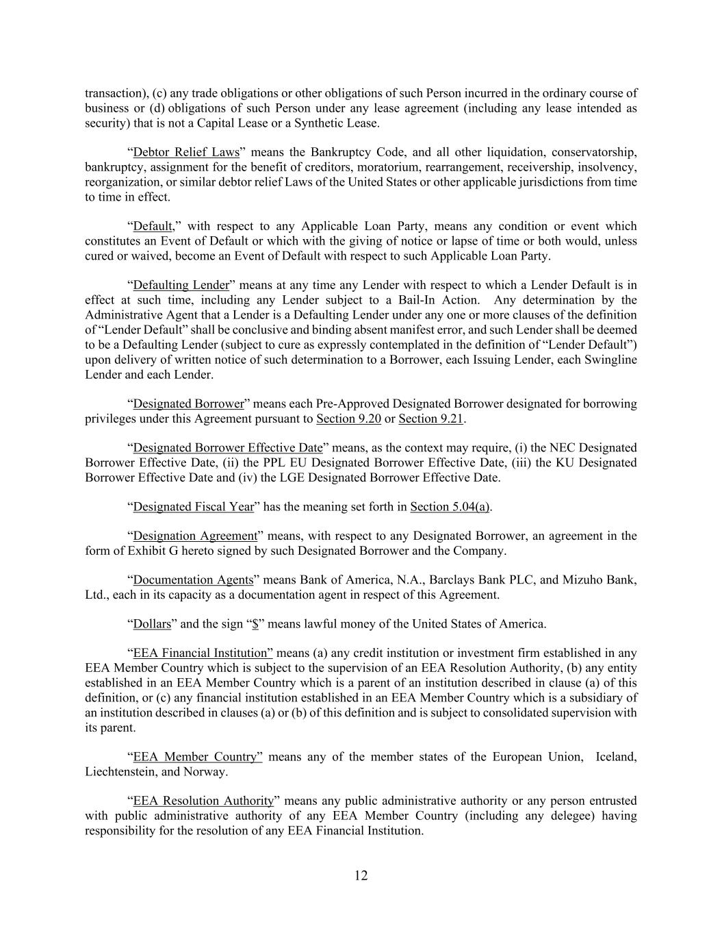 12 transaction), (c) any trade obligations or other obligations of such Person incurred in the ordinary course of business or (d) obligations of such Person under any lease agreement (including any lease intended as security) that is not a Capital Lease or a Synthetic Lease. “Debtor Relief Laws” means the Bankruptcy Code, and all other liquidation, conservatorship, bankruptcy, assignment for the benefit of creditors, moratorium, rearrangement, receivership, insolvency, reorganization, or similar debtor relief Laws of the United States or other applicable jurisdictions from time to time in effect. “Default,” with respect to any Applicable Loan Party, means any condition or event which constitutes an Event of Default or which with the giving of notice or lapse of time or both would, unless cured or waived, become an Event of Default with respect to such Applicable Loan Party. “Defaulting Lender” means at any time any Lender with respect to which a Lender Default is in effect at such time, including any Lender subject to a Bail-In Action. Any determination by the Administrative Agent that a Lender is a Defaulting Lender under any one or more clauses of the definition of “Lender Default” shall be conclusive and binding absent manifest error, and such Lender shall be deemed to be a Defaulting Lender (subject to cure as expressly contemplated in the definition of “Lender Default”) upon delivery of written notice of such determination to a Borrower, each Issuing Lender, each Swingline Lender and each Lender. “Designated Borrower” means each Pre-Approved Designated Borrower designated for borrowing privileges under this Agreement pursuant to Section 9.20 or Section 9.21. “Designated Borrower Effective Date” means, as the context may require, (i) the NEC Designated Borrower Effective Date, (ii) the PPL EU Designated Borrower Effective Date, (iii) the KU Designated Borrower Effective Date and (iv) the LGE Designated Borrower Effective Date. “Designated Fiscal Year” has the meaning set forth in Section 5.04(a). “Designation Agreement” means, with respect to any Designated Borrower, an agreement in the form of Exhibit G hereto signed by such Designated Borrower and the Company. “Documentation Agents” means Bank of America, N.A., Barclays Bank PLC, and Mizuho Bank, Ltd., each in its capacity as a documentation agent in respect of this Agreement. “Dollars” and the sign “$” means lawful money of the United States of America. “EEA Financial Institution” means (a) any credit institution or investment firm established in any EEA Member Country which is subject to the supervision of an EEA Resolution Authority, (b) any entity established in an EEA Member Country which is a parent of an institution described in clause (a) of this definition, or (c) any financial institution established in an EEA Member Country which is a subsidiary of an institution described in clauses (a) or (b) of this definition and is subject to consolidated supervision with its parent. “EEA Member Country” means any of the member states of the European Union, Iceland, Liechtenstein, and Norway. “EEA Resolution Authority” means any public administrative authority or any person entrusted with public administrative authority of any EEA Member Country (including any delegee) having responsibility for the resolution of any EEA Financial Institution.