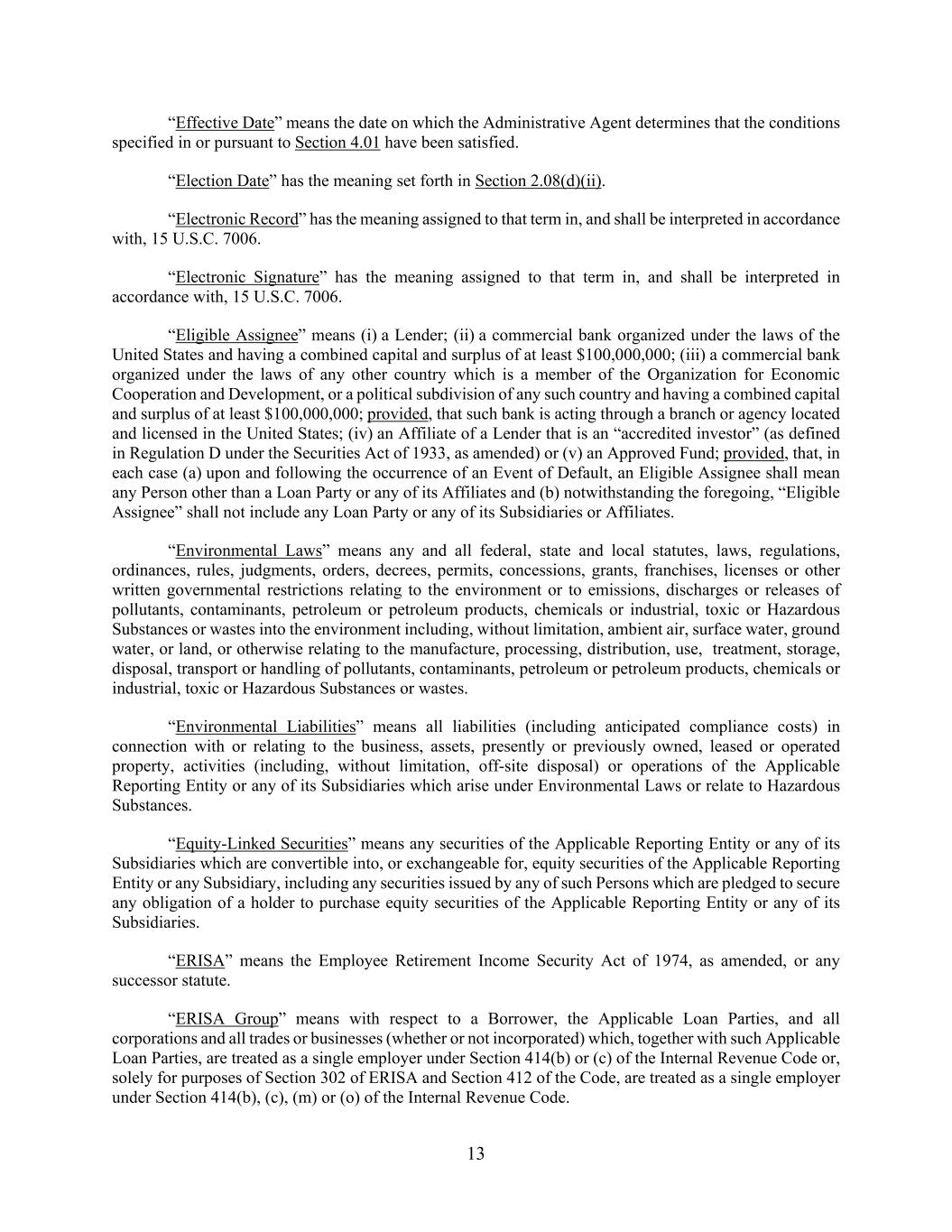13 “Effective Date” means the date on which the Administrative Agent determines that the conditions specified in or pursuant to Section 4.01 have been satisfied. “Election Date” has the meaning set forth in Section 2.08(d)(ii). “Electronic Record” has the meaning assigned to that term in, and shall be interpreted in accordance with, 15 U.S.C. 7006. “Electronic Signature” has the meaning assigned to that term in, and shall be interpreted in accordance with, 15 U.S.C. 7006. “Eligible Assignee” means (i) a Lender; (ii) a commercial bank organized under the laws of the United States and having a combined capital and surplus of at least $100,000,000; (iii) a commercial bank organized under the laws of any other country which is a member of the Organization for Economic Cooperation and Development, or a political subdivision of any such country and having a combined capital and surplus of at least $100,000,000; provided, that such bank is acting through a branch or agency located and licensed in the United States; (iv) an Affiliate of a Lender that is an “accredited investor” (as defined in Regulation D under the Securities Act of 1933, as amended) or (v) an Approved Fund; provided, that, in each case (a) upon and following the occurrence of an Event of Default, an Eligible Assignee shall mean any Person other than a Loan Party or any of its Affiliates and (b) notwithstanding the foregoing, “Eligible Assignee” shall not include any Loan Party or any of its Subsidiaries or Affiliates. “Environmental Laws” means any and all federal, state and local statutes, laws, regulations, ordinances, rules, judgments, orders, decrees, permits, concessions, grants, franchises, licenses or other written governmental restrictions relating to the environment or to emissions, discharges or releases of pollutants, contaminants, petroleum or petroleum products, chemicals or industrial, toxic or Hazardous Substances or wastes into the environment including, without limitation, ambient air, surface water, ground water, or land, or otherwise relating to the manufacture, processing, distribution, use, treatment, storage, disposal, transport or handling of pollutants, contaminants, petroleum or petroleum products, chemicals or industrial, toxic or Hazardous Substances or wastes. “Environmental Liabilities” means all liabilities (including anticipated compliance costs) in connection with or relating to the business, assets, presently or previously owned, leased or operated property, activities (including, without limitation, off-site disposal) or operations of the Applicable Reporting Entity or any of its Subsidiaries which arise under Environmental Laws or relate to Hazardous Substances. “Equity-Linked Securities” means any securities of the Applicable Reporting Entity or any of its Subsidiaries which are convertible into, or exchangeable for, equity securities of the Applicable Reporting Entity or any Subsidiary, including any securities issued by any of such Persons which are pledged to secure any obligation of a holder to purchase equity securities of the Applicable Reporting Entity or any of its Subsidiaries. “ERISA” means the Employee Retirement Income Security Act of 1974, as amended, or any successor statute. “ERISA Group” means with respect to a Borrower, the Applicable Loan Parties, and all corporations and all trades or businesses (whether or not incorporated) which, together with such Applicable Loan Parties, are treated as a single employer under Section 414(b) or (c) of the Internal Revenue Code or, solely for purposes of Section 302 of ERISA and Section 412 of the Code, are treated as a single employer under Section 414(b), (c), (m) or (o) of the Internal Revenue Code.