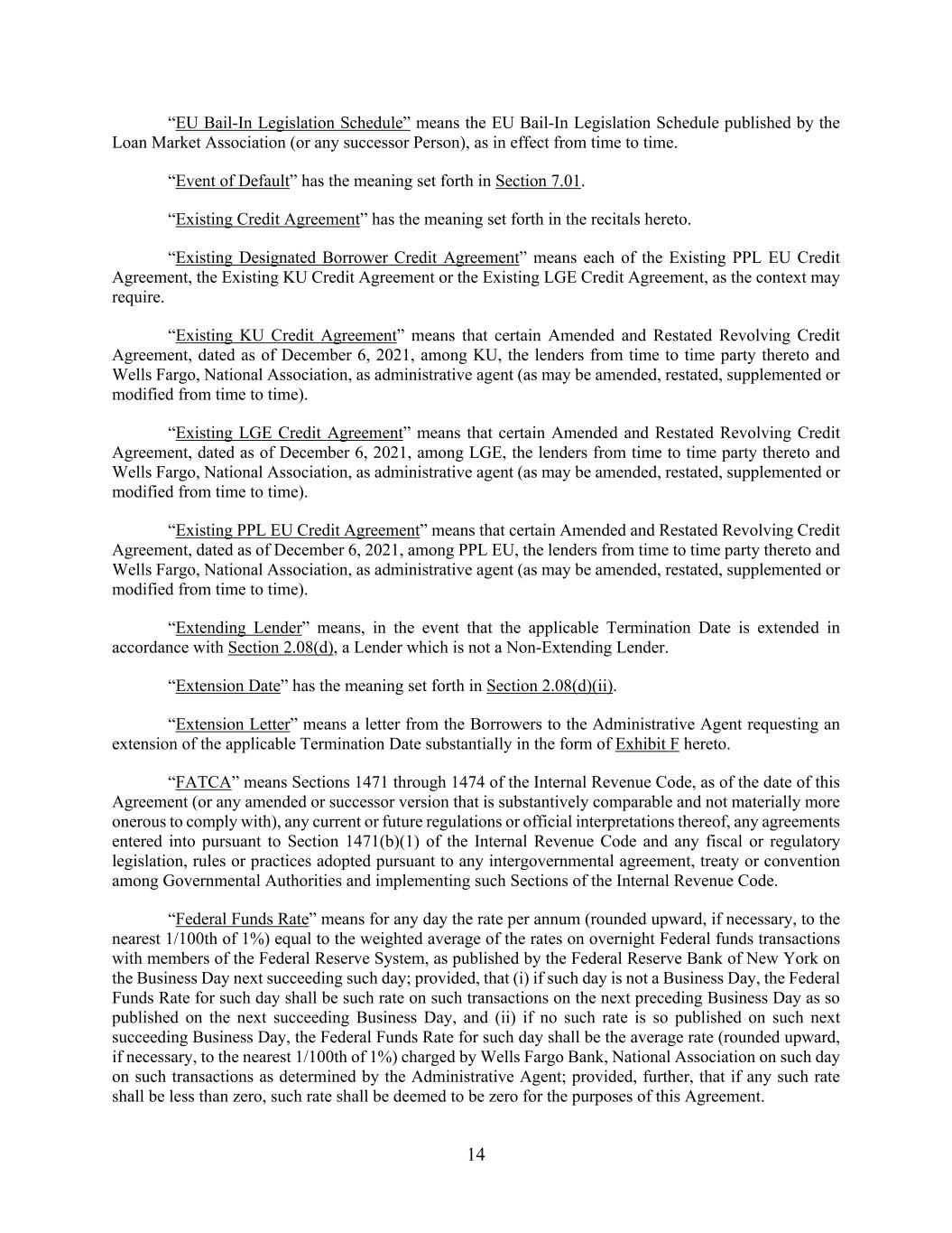 14 “EU Bail-In Legislation Schedule” means the EU Bail-In Legislation Schedule published by the Loan Market Association (or any successor Person), as in effect from time to time. “Event of Default” has the meaning set forth in Section 7.01. “Existing Credit Agreement” has the meaning set forth in the recitals hereto. “Existing Designated Borrower Credit Agreement” means each of the Existing PPL EU Credit Agreement, the Existing KU Credit Agreement or the Existing LGE Credit Agreement, as the context may require. “Existing KU Credit Agreement” means that certain Amended and Restated Revolving Credit Agreement, dated as of December 6, 2021, among KU, the lenders from time to time party thereto and Wells Fargo, National Association, as administrative agent (as may be amended, restated, supplemented or modified from time to time). “Existing LGE Credit Agreement” means that certain Amended and Restated Revolving Credit Agreement, dated as of December 6, 2021, among LGE, the lenders from time to time party thereto and Wells Fargo, National Association, as administrative agent (as may be amended, restated, supplemented or modified from time to time). “Existing PPL EU Credit Agreement” means that certain Amended and Restated Revolving Credit Agreement, dated as of December 6, 2021, among PPL EU, the lenders from time to time party thereto and Wells Fargo, National Association, as administrative agent (as may be amended, restated, supplemented or modified from time to time). “Extending Lender” means, in the event that the applicable Termination Date is extended in accordance with Section 2.08(d), a Lender which is not a Non-Extending Lender. “Extension Date” has the meaning set forth in Section 2.08(d)(ii). “Extension Letter” means a letter from the Borrowers to the Administrative Agent requesting an extension of the applicable Termination Date substantially in the form of Exhibit F hereto. “FATCA” means Sections 1471 through 1474 of the Internal Revenue Code, as of the date of this Agreement (or any amended or successor version that is substantively comparable and not materially more onerous to comply with), any current or future regulations or official interpretations thereof, any agreements entered into pursuant to Section 1471(b)(1) of the Internal Revenue Code and any fiscal or regulatory legislation, rules or practices adopted pursuant to any intergovernmental agreement, treaty or convention among Governmental Authorities and implementing such Sections of the Internal Revenue Code. “Federal Funds Rate” means for any day the rate per annum (rounded upward, if necessary, to the nearest 1/100th of 1%) equal to the weighted average of the rates on overnight Federal funds transactions with members of the Federal Reserve System, as published by the Federal Reserve Bank of New York on the Business Day next succeeding such day; provided, that (i) if such day is not a Business Day, the Federal Funds Rate for such day shall be such rate on such transactions on the next preceding Business Day as so published on the next succeeding Business Day, and (ii) if no such rate is so published on such next succeeding Business Day, the Federal Funds Rate for such day shall be the average rate (rounded upward, if necessary, to the nearest 1/100th of 1%) charged by Wells Fargo Bank, National Association on such day on such transactions as determined by the Administrative Agent; provided, further, that if any such rate shall be less than zero, such rate shall be deemed to be zero for the purposes of this Agreement.