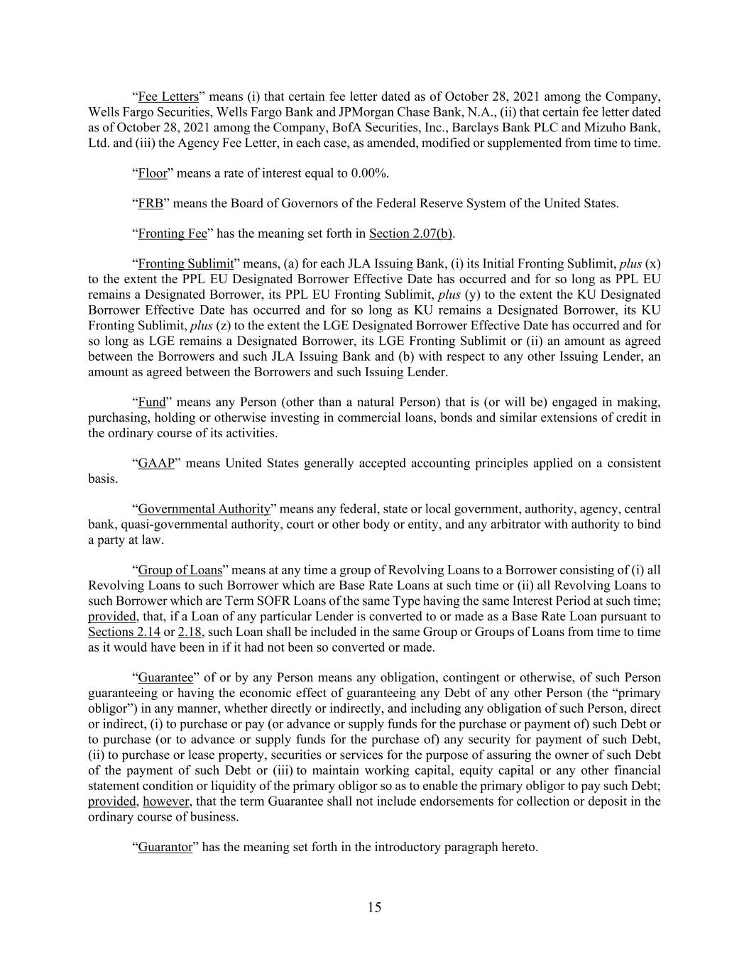 15 “Fee Letters” means (i) that certain fee letter dated as of October 28, 2021 among the Company, Wells Fargo Securities, Wells Fargo Bank and JPMorgan Chase Bank, N.A., (ii) that certain fee letter dated as of October 28, 2021 among the Company, BofA Securities, Inc., Barclays Bank PLC and Mizuho Bank, Ltd. and (iii) the Agency Fee Letter, in each case, as amended, modified or supplemented from time to time. “Floor” means a rate of interest equal to 0.00%. “FRB” means the Board of Governors of the Federal Reserve System of the United States. “Fronting Fee” has the meaning set forth in Section 2.07(b). “Fronting Sublimit” means, (a) for each JLA Issuing Bank, (i) its Initial Fronting Sublimit, plus (x) to the extent the PPL EU Designated Borrower Effective Date has occurred and for so long as PPL EU remains a Designated Borrower, its PPL EU Fronting Sublimit, plus (y) to the extent the KU Designated Borrower Effective Date has occurred and for so long as KU remains a Designated Borrower, its KU Fronting Sublimit, plus (z) to the extent the LGE Designated Borrower Effective Date has occurred and for so long as LGE remains a Designated Borrower, its LGE Fronting Sublimit or (ii) an amount as agreed between the Borrowers and such JLA Issuing Bank and (b) with respect to any other Issuing Lender, an amount as agreed between the Borrowers and such Issuing Lender. “Fund” means any Person (other than a natural Person) that is (or will be) engaged in making, purchasing, holding or otherwise investing in commercial loans, bonds and similar extensions of credit in the ordinary course of its activities. “GAAP” means United States generally accepted accounting principles applied on a consistent basis. “Governmental Authority” means any federal, state or local government, authority, agency, central bank, quasi-governmental authority, court or other body or entity, and any arbitrator with authority to bind a party at law. “Group of Loans” means at any time a group of Revolving Loans to a Borrower consisting of (i) all Revolving Loans to such Borrower which are Base Rate Loans at such time or (ii) all Revolving Loans to such Borrower which are Term SOFR Loans of the same Type having the same Interest Period at such time; provided, that, if a Loan of any particular Lender is converted to or made as a Base Rate Loan pursuant to Sections 2.14 or 2.18, such Loan shall be included in the same Group or Groups of Loans from time to time as it would have been in if it had not been so converted or made. “Guarantee” of or by any Person means any obligation, contingent or otherwise, of such Person guaranteeing or having the economic effect of guaranteeing any Debt of any other Person (the “primary obligor”) in any manner, whether directly or indirectly, and including any obligation of such Person, direct or indirect, (i) to purchase or pay (or advance or supply funds for the purchase or payment of) such Debt or to purchase (or to advance or supply funds for the purchase of) any security for payment of such Debt, (ii) to purchase or lease property, securities or services for the purpose of assuring the owner of such Debt of the payment of such Debt or (iii) to maintain working capital, equity capital or any other financial statement condition or liquidity of the primary obligor so as to enable the primary obligor to pay such Debt; provided, however, that the term Guarantee shall not include endorsements for collection or deposit in the ordinary course of business. “Guarantor” has the meaning set forth in the introductory paragraph hereto.