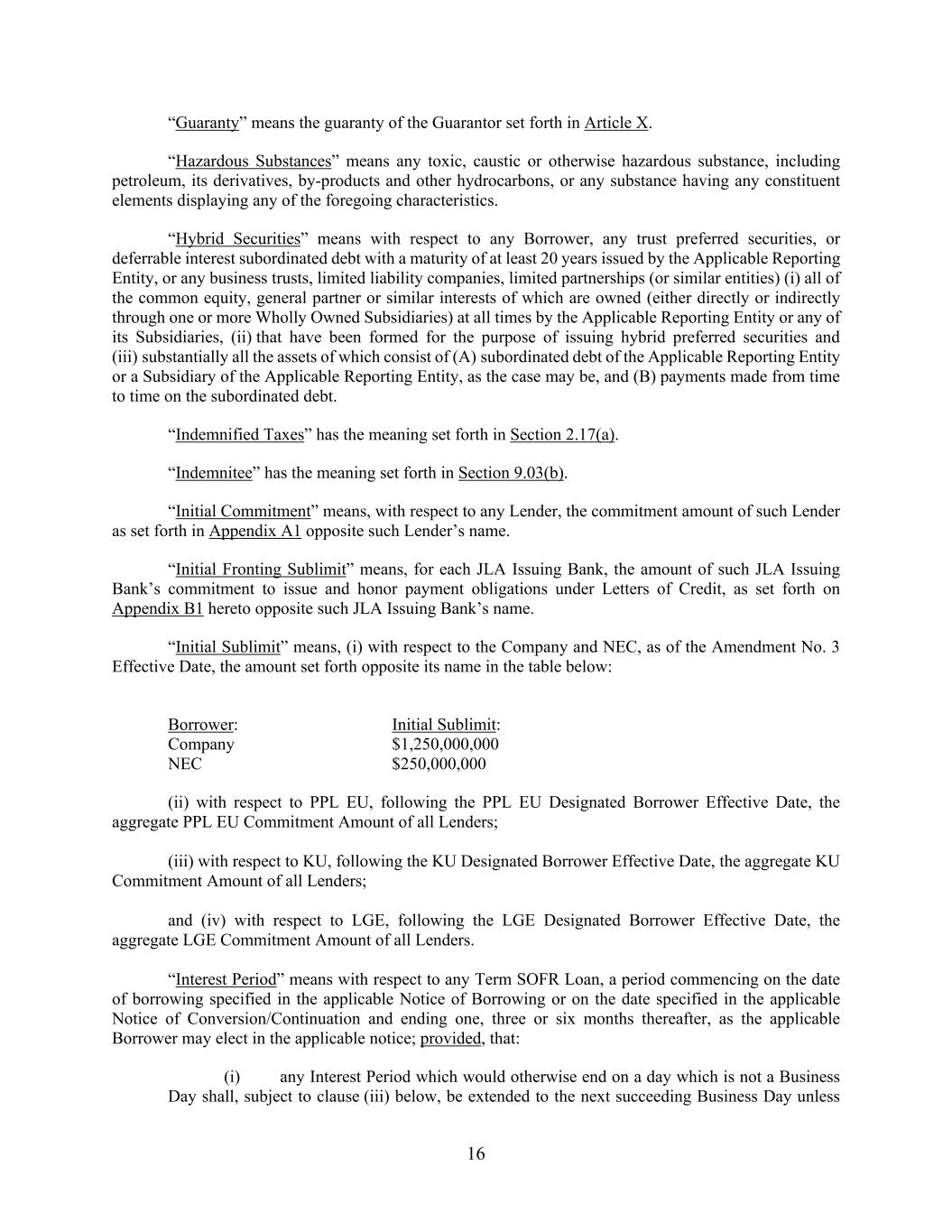 16 “Guaranty” means the guaranty of the Guarantor set forth in Article X. “Hazardous Substances” means any toxic, caustic or otherwise hazardous substance, including petroleum, its derivatives, by-products and other hydrocarbons, or any substance having any constituent elements displaying any of the foregoing characteristics. “Hybrid Securities” means with respect to any Borrower, any trust preferred securities, or deferrable interest subordinated debt with a maturity of at least 20 years issued by the Applicable Reporting Entity, or any business trusts, limited liability companies, limited partnerships (or similar entities) (i) all of the common equity, general partner or similar interests of which are owned (either directly or indirectly through one or more Wholly Owned Subsidiaries) at all times by the Applicable Reporting Entity or any of its Subsidiaries, (ii) that have been formed for the purpose of issuing hybrid preferred securities and (iii) substantially all the assets of which consist of (A) subordinated debt of the Applicable Reporting Entity or a Subsidiary of the Applicable Reporting Entity, as the case may be, and (B) payments made from time to time on the subordinated debt. “Indemnified Taxes” has the meaning set forth in Section 2.17(a). “Indemnitee” has the meaning set forth in Section 9.03(b). “Initial Commitment” means, with respect to any Lender, the commitment amount of such Lender as set forth in Appendix A1 opposite such Lender’s name. “Initial Fronting Sublimit” means, for each JLA Issuing Bank, the amount of such JLA Issuing Bank’s commitment to issue and honor payment obligations under Letters of Credit, as set forth on Appendix B1 hereto opposite such JLA Issuing Bank’s name. “Initial Sublimit” means, (i) with respect to the Company and NEC, as of the Amendment No. 3 Effective Date, the amount set forth opposite its name in the table below: Borrower: Initial Sublimit: Company $1,250,000,000 NEC $250,000,000 (ii) with respect to PPL EU, following the PPL EU Designated Borrower Effective Date, the aggregate PPL EU Commitment Amount of all Lenders; (iii) with respect to KU, following the KU Designated Borrower Effective Date, the aggregate KU Commitment Amount of all Lenders; and (iv) with respect to LGE, following the LGE Designated Borrower Effective Date, the aggregate LGE Commitment Amount of all Lenders. “Interest Period” means with respect to any Term SOFR Loan, a period commencing on the date of borrowing specified in the applicable Notice of Borrowing or on the date specified in the applicable Notice of Conversion/Continuation and ending one, three or six months thereafter, as the applicable Borrower may elect in the applicable notice; provided, that: (i) any Interest Period which would otherwise end on a day which is not a Business Day shall, subject to clause (iii) below, be extended to the next succeeding Business Day unless