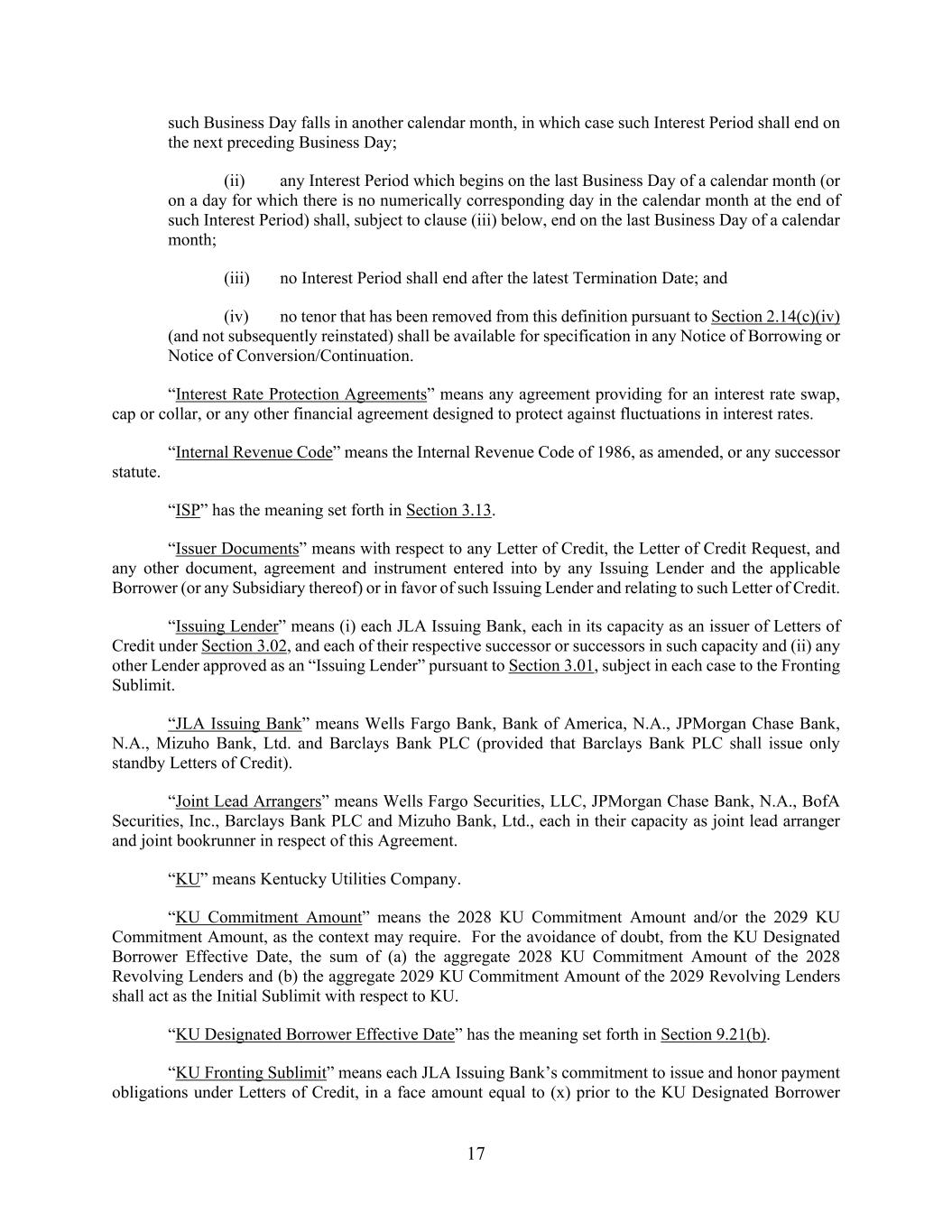 17 such Business Day falls in another calendar month, in which case such Interest Period shall end on the next preceding Business Day; (ii) any Interest Period which begins on the last Business Day of a calendar month (or on a day for which there is no numerically corresponding day in the calendar month at the end of such Interest Period) shall, subject to clause (iii) below, end on the last Business Day of a calendar month; (iii) no Interest Period shall end after the latest Termination Date; and (iv) no tenor that has been removed from this definition pursuant to Section 2.14(c)(iv) (and not subsequently reinstated) shall be available for specification in any Notice of Borrowing or Notice of Conversion/Continuation. “Interest Rate Protection Agreements” means any agreement providing for an interest rate swap, cap or collar, or any other financial agreement designed to protect against fluctuations in interest rates. “Internal Revenue Code” means the Internal Revenue Code of 1986, as amended, or any successor statute. “ISP” has the meaning set forth in Section 3.13. “Issuer Documents” means with respect to any Letter of Credit, the Letter of Credit Request, and any other document, agreement and instrument entered into by any Issuing Lender and the applicable Borrower (or any Subsidiary thereof) or in favor of such Issuing Lender and relating to such Letter of Credit. “Issuing Lender” means (i) each JLA Issuing Bank, each in its capacity as an issuer of Letters of Credit under Section 3.02, and each of their respective successor or successors in such capacity and (ii) any other Lender approved as an “Issuing Lender” pursuant to Section 3.01, subject in each case to the Fronting Sublimit. “JLA Issuing Bank” means Wells Fargo Bank, Bank of America, N.A., JPMorgan Chase Bank, N.A., Mizuho Bank, Ltd. and Barclays Bank PLC (provided that Barclays Bank PLC shall issue only standby Letters of Credit). “Joint Lead Arrangers” means Wells Fargo Securities, LLC, JPMorgan Chase Bank, N.A., BofA Securities, Inc., Barclays Bank PLC and Mizuho Bank, Ltd., each in their capacity as joint lead arranger and joint bookrunner in respect of this Agreement. “KU” means Kentucky Utilities Company. “KU Commitment Amount” means the 2028 KU Commitment Amount and/or the 2029 KU Commitment Amount, as the context may require. For the avoidance of doubt, from the KU Designated Borrower Effective Date, the sum of (a) the aggregate 2028 KU Commitment Amount of the 2028 Revolving Lenders and (b) the aggregate 2029 KU Commitment Amount of the 2029 Revolving Lenders shall act as the Initial Sublimit with respect to KU. “KU Designated Borrower Effective Date” has the meaning set forth in Section 9.21(b). “KU Fronting Sublimit” means each JLA Issuing Bank’s commitment to issue and honor payment obligations under Letters of Credit, in a face amount equal to (x) prior to the KU Designated Borrower