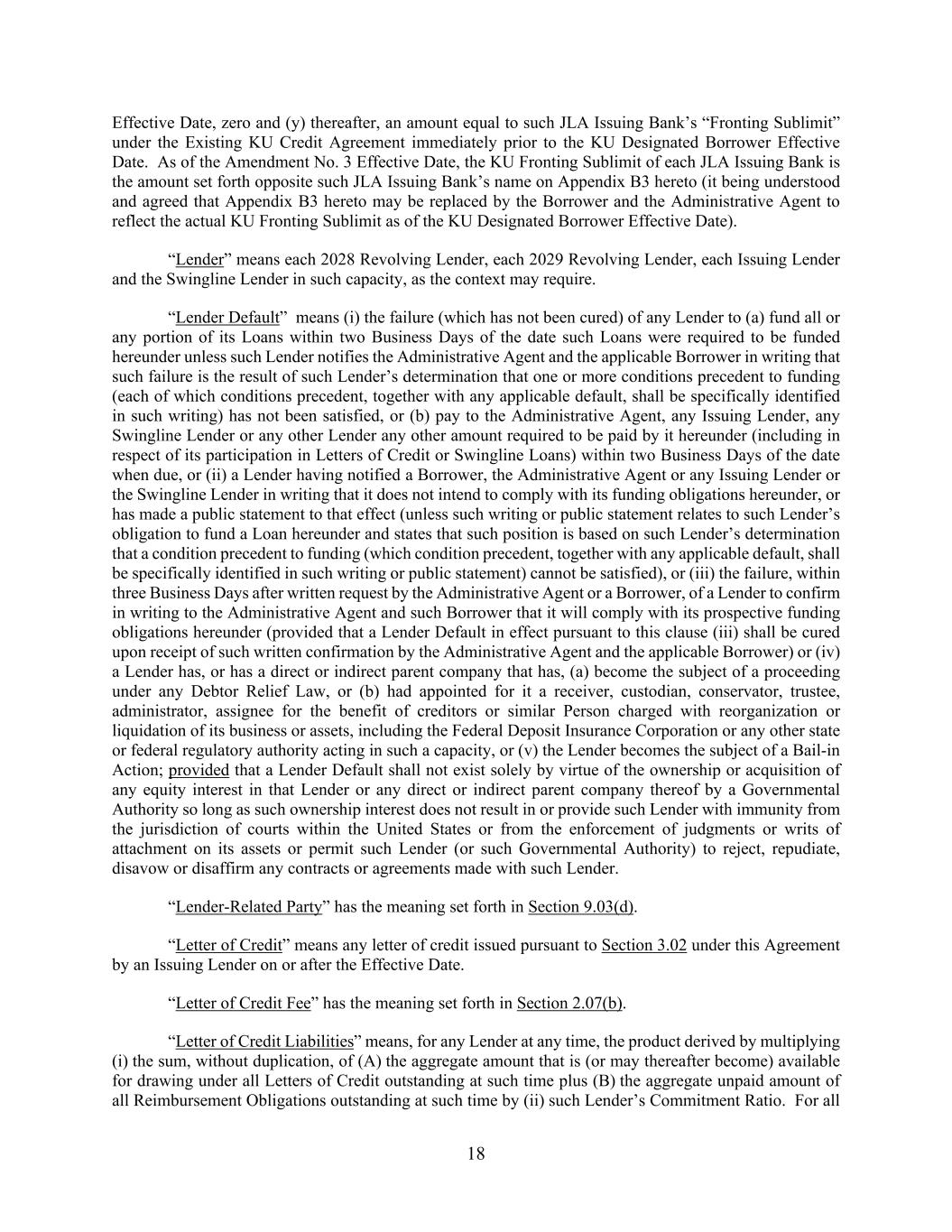 18 Effective Date, zero and (y) thereafter, an amount equal to such JLA Issuing Bank’s “Fronting Sublimit” under the Existing KU Credit Agreement immediately prior to the KU Designated Borrower Effective Date. As of the Amendment No. 3 Effective Date, the KU Fronting Sublimit of each JLA Issuing Bank is the amount set forth opposite such JLA Issuing Bank’s name on Appendix B3 hereto (it being understood and agreed that Appendix B3 hereto may be replaced by the Borrower and the Administrative Agent to reflect the actual KU Fronting Sublimit as of the KU Designated Borrower Effective Date). “Lender” means each 2028 Revolving Lender, each 2029 Revolving Lender, each Issuing Lender and the Swingline Lender in such capacity, as the context may require. “Lender Default” means (i) the failure (which has not been cured) of any Lender to (a) fund all or any portion of its Loans within two Business Days of the date such Loans were required to be funded hereunder unless such Lender notifies the Administrative Agent and the applicable Borrower in writing that such failure is the result of such Lender’s determination that one or more conditions precedent to funding (each of which conditions precedent, together with any applicable default, shall be specifically identified in such writing) has not been satisfied, or (b) pay to the Administrative Agent, any Issuing Lender, any Swingline Lender or any other Lender any other amount required to be paid by it hereunder (including in respect of its participation in Letters of Credit or Swingline Loans) within two Business Days of the date when due, or (ii) a Lender having notified a Borrower, the Administrative Agent or any Issuing Lender or the Swingline Lender in writing that it does not intend to comply with its funding obligations hereunder, or has made a public statement to that effect (unless such writing or public statement relates to such Lender’s obligation to fund a Loan hereunder and states that such position is based on such Lender’s determination that a condition precedent to funding (which condition precedent, together with any applicable default, shall be specifically identified in such writing or public statement) cannot be satisfied), or (iii) the failure, within three Business Days after written request by the Administrative Agent or a Borrower, of a Lender to confirm in writing to the Administrative Agent and such Borrower that it will comply with its prospective funding obligations hereunder (provided that a Lender Default in effect pursuant to this clause (iii) shall be cured upon receipt of such written confirmation by the Administrative Agent and the applicable Borrower) or (iv) a Lender has, or has a direct or indirect parent company that has, (a) become the subject of a proceeding under any Debtor Relief Law, or (b) had appointed for it a receiver, custodian, conservator, trustee, administrator, assignee for the benefit of creditors or similar Person charged with reorganization or liquidation of its business or assets, including the Federal Deposit Insurance Corporation or any other state or federal regulatory authority acting in such a capacity, or (v) the Lender becomes the subject of a Bail-in Action; provided that a Lender Default shall not exist solely by virtue of the ownership or acquisition of any equity interest in that Lender or any direct or indirect parent company thereof by a Governmental Authority so long as such ownership interest does not result in or provide such Lender with immunity from the jurisdiction of courts within the United States or from the enforcement of judgments or writs of attachment on its assets or permit such Lender (or such Governmental Authority) to reject, repudiate, disavow or disaffirm any contracts or agreements made with such Lender. “Lender-Related Party” has the meaning set forth in Section 9.03(d). “Letter of Credit” means any letter of credit issued pursuant to Section 3.02 under this Agreement by an Issuing Lender on or after the Effective Date. “Letter of Credit Fee” has the meaning set forth in Section 2.07(b). “Letter of Credit Liabilities” means, for any Lender at any time, the product derived by multiplying (i) the sum, without duplication, of (A) the aggregate amount that is (or may thereafter become) available for drawing under all Letters of Credit outstanding at such time plus (B) the aggregate unpaid amount of all Reimbursement Obligations outstanding at such time by (ii) such Lender’s Commitment Ratio. For all