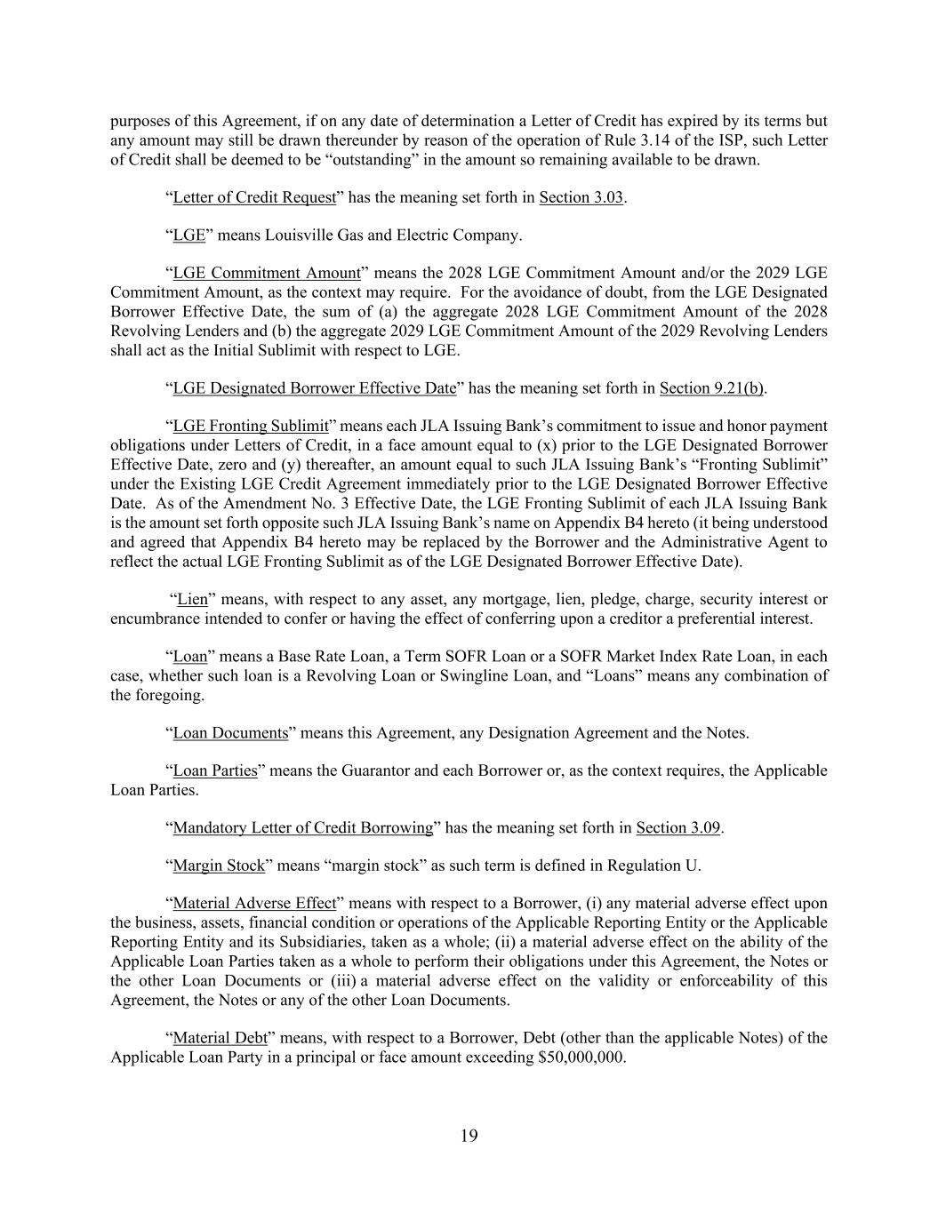 19 purposes of this Agreement, if on any date of determination a Letter of Credit has expired by its terms but any amount may still be drawn thereunder by reason of the operation of Rule 3.14 of the ISP, such Letter of Credit shall be deemed to be “outstanding” in the amount so remaining available to be drawn. “Letter of Credit Request” has the meaning set forth in Section 3.03. “LGE” means Louisville Gas and Electric Company. “LGE Commitment Amount” means the 2028 LGE Commitment Amount and/or the 2029 LGE Commitment Amount, as the context may require. For the avoidance of doubt, from the LGE Designated Borrower Effective Date, the sum of (a) the aggregate 2028 LGE Commitment Amount of the 2028 Revolving Lenders and (b) the aggregate 2029 LGE Commitment Amount of the 2029 Revolving Lenders shall act as the Initial Sublimit with respect to LGE. “LGE Designated Borrower Effective Date” has the meaning set forth in Section 9.21(b). “LGE Fronting Sublimit” means each JLA Issuing Bank’s commitment to issue and honor payment obligations under Letters of Credit, in a face amount equal to (x) prior to the LGE Designated Borrower Effective Date, zero and (y) thereafter, an amount equal to such JLA Issuing Bank’s “Fronting Sublimit” under the Existing LGE Credit Agreement immediately prior to the LGE Designated Borrower Effective Date. As of the Amendment No. 3 Effective Date, the LGE Fronting Sublimit of each JLA Issuing Bank is the amount set forth opposite such JLA Issuing Bank’s name on Appendix B4 hereto (it being understood and agreed that Appendix B4 hereto may be replaced by the Borrower and the Administrative Agent to reflect the actual LGE Fronting Sublimit as of the LGE Designated Borrower Effective Date). “Lien” means, with respect to any asset, any mortgage, lien, pledge, charge, security interest or encumbrance intended to confer or having the effect of conferring upon a creditor a preferential interest. “Loan” means a Base Rate Loan, a Term SOFR Loan or a SOFR Market Index Rate Loan, in each case, whether such loan is a Revolving Loan or Swingline Loan, and “Loans” means any combination of the foregoing. “Loan Documents” means this Agreement, any Designation Agreement and the Notes. “Loan Parties” means the Guarantor and each Borrower or, as the context requires, the Applicable Loan Parties. “Mandatory Letter of Credit Borrowing” has the meaning set forth in Section 3.09. “Margin Stock” means “margin stock” as such term is defined in Regulation U. “Material Adverse Effect” means with respect to a Borrower, (i) any material adverse effect upon the business, assets, financial condition or operations of the Applicable Reporting Entity or the Applicable Reporting Entity and its Subsidiaries, taken as a whole; (ii) a material adverse effect on the ability of the Applicable Loan Parties taken as a whole to perform their obligations under this Agreement, the Notes or the other Loan Documents or (iii) a material adverse effect on the validity or enforceability of this Agreement, the Notes or any of the other Loan Documents. “Material Debt” means, with respect to a Borrower, Debt (other than the applicable Notes) of the Applicable Loan Party in a principal or face amount exceeding $50,000,000.