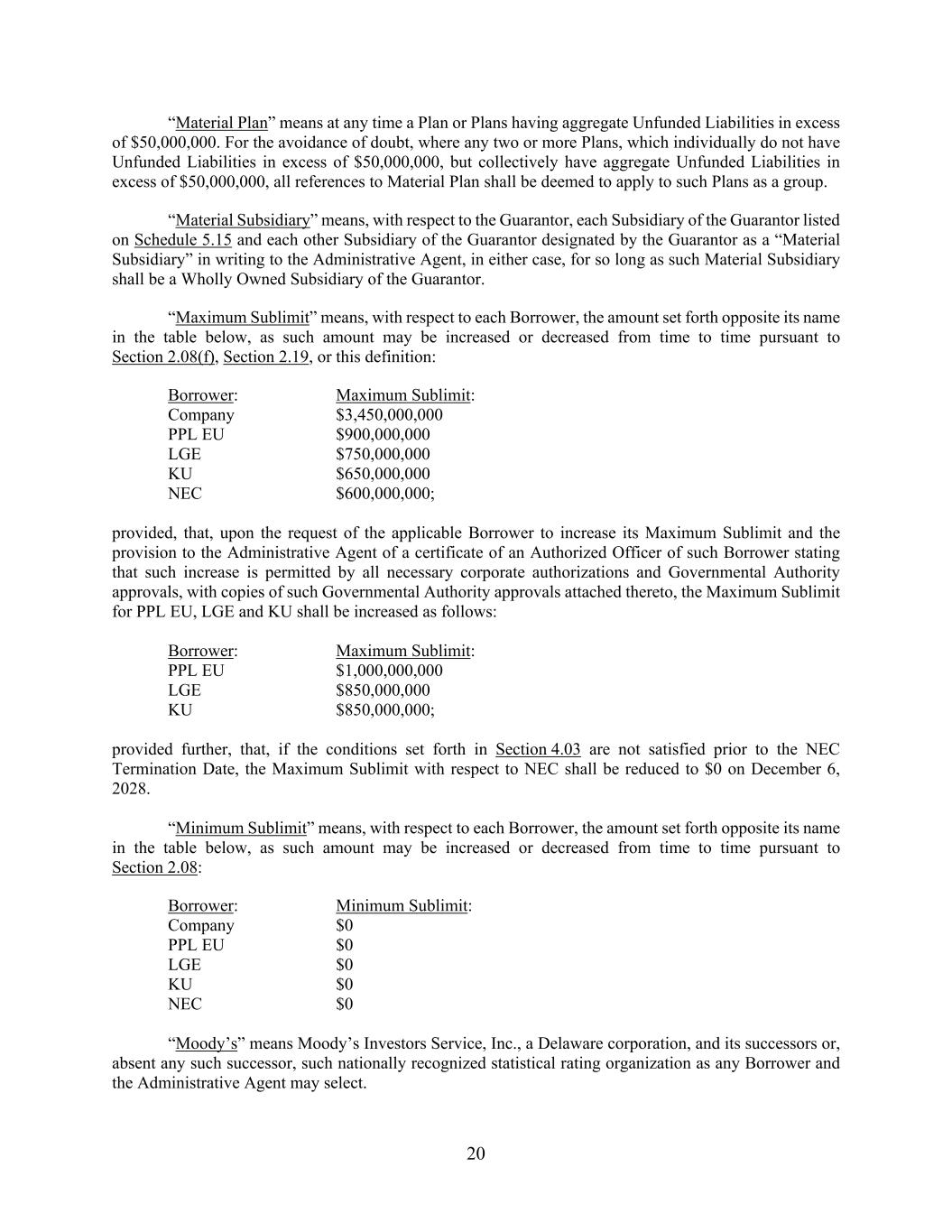 20 “Material Plan” means at any time a Plan or Plans having aggregate Unfunded Liabilities in excess of $50,000,000. For the avoidance of doubt, where any two or more Plans, which individually do not have Unfunded Liabilities in excess of $50,000,000, but collectively have aggregate Unfunded Liabilities in excess of $50,000,000, all references to Material Plan shall be deemed to apply to such Plans as a group. “Material Subsidiary” means, with respect to the Guarantor, each Subsidiary of the Guarantor listed on Schedule 5.15 and each other Subsidiary of the Guarantor designated by the Guarantor as a “Material Subsidiary” in writing to the Administrative Agent, in either case, for so long as such Material Subsidiary shall be a Wholly Owned Subsidiary of the Guarantor. “Maximum Sublimit” means, with respect to each Borrower, the amount set forth opposite its name in the table below, as such amount may be increased or decreased from time to time pursuant to Section 2.08(f), Section 2.19, or this definition: Borrower: Maximum Sublimit: Company $3,450,000,000 PPL EU $900,000,000 LGE $750,000,000 KU $650,000,000 NEC $600,000,000; provided, that, upon the request of the applicable Borrower to increase its Maximum Sublimit and the provision to the Administrative Agent of a certificate of an Authorized Officer of such Borrower stating that such increase is permitted by all necessary corporate authorizations and Governmental Authority approvals, with copies of such Governmental Authority approvals attached thereto, the Maximum Sublimit for PPL EU, LGE and KU shall be increased as follows: Borrower: Maximum Sublimit: PPL EU $1,000,000,000 LGE $850,000,000 KU $850,000,000; provided further, that, if the conditions set forth in Section 4.03 are not satisfied prior to the NEC Termination Date, the Maximum Sublimit with respect to NEC shall be reduced to $0 on December 6, 2028. “Minimum Sublimit” means, with respect to each Borrower, the amount set forth opposite its name in the table below, as such amount may be increased or decreased from time to time pursuant to Section 2.08: Borrower: Minimum Sublimit: Company $0 PPL EU $0 LGE $0 KU $0 NEC $0 “Moody’s” means Moody’s Investors Service, Inc., a Delaware corporation, and its successors or, absent any such successor, such nationally recognized statistical rating organization as any Borrower and the Administrative Agent may select.