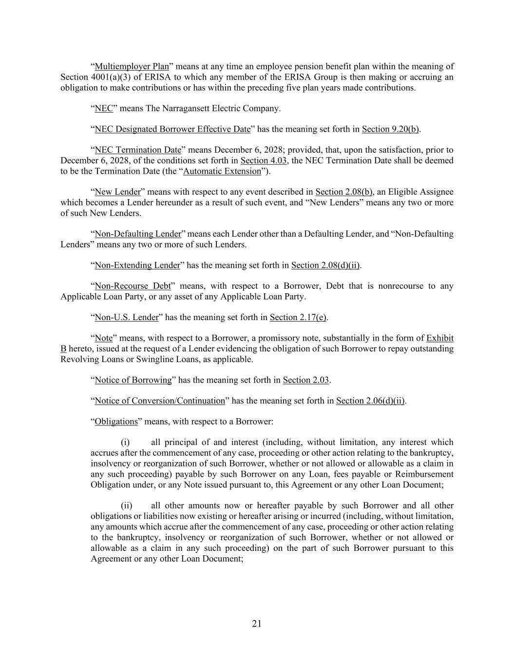 21 “Multiemployer Plan” means at any time an employee pension benefit plan within the meaning of Section 4001(a)(3) of ERISA to which any member of the ERISA Group is then making or accruing an obligation to make contributions or has within the preceding five plan years made contributions. “NEC” means The Narragansett Electric Company. “NEC Designated Borrower Effective Date” has the meaning set forth in Section 9.20(b). “NEC Termination Date” means December 6, 2028; provided, that, upon the satisfaction, prior to December 6, 2028, of the conditions set forth in Section 4.03, the NEC Termination Date shall be deemed to be the Termination Date (the “Automatic Extension”). “New Lender” means with respect to any event described in Section 2.08(b), an Eligible Assignee which becomes a Lender hereunder as a result of such event, and “New Lenders” means any two or more of such New Lenders. “Non-Defaulting Lender” means each Lender other than a Defaulting Lender, and “Non-Defaulting Lenders” means any two or more of such Lenders. “Non-Extending Lender” has the meaning set forth in Section 2.08(d)(ii). “Non-Recourse Debt” means, with respect to a Borrower, Debt that is nonrecourse to any Applicable Loan Party, or any asset of any Applicable Loan Party. “Non-U.S. Lender” has the meaning set forth in Section 2.17(e). “Note” means, with respect to a Borrower, a promissory note, substantially in the form of Exhibit B hereto, issued at the request of a Lender evidencing the obligation of such Borrower to repay outstanding Revolving Loans or Swingline Loans, as applicable. “Notice of Borrowing” has the meaning set forth in Section 2.03. “Notice of Conversion/Continuation” has the meaning set forth in Section 2.06(d)(ii). “Obligations” means, with respect to a Borrower: (i) all principal of and interest (including, without limitation, any interest which accrues after the commencement of any case, proceeding or other action relating to the bankruptcy, insolvency or reorganization of such Borrower, whether or not allowed or allowable as a claim in any such proceeding) payable by such Borrower on any Loan, fees payable or Reimbursement Obligation under, or any Note issued pursuant to, this Agreement or any other Loan Document; (ii) all other amounts now or hereafter payable by such Borrower and all other obligations or liabilities now existing or hereafter arising or incurred (including, without limitation, any amounts which accrue after the commencement of any case, proceeding or other action relating to the bankruptcy, insolvency or reorganization of such Borrower, whether or not allowed or allowable as a claim in any such proceeding) on the part of such Borrower pursuant to this Agreement or any other Loan Document;