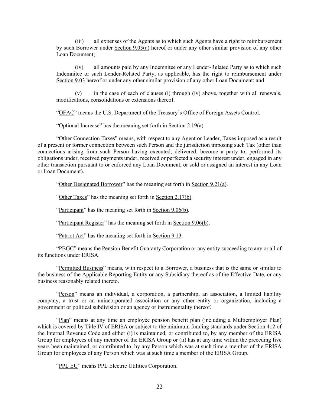 22 (iii) all expenses of the Agents as to which such Agents have a right to reimbursement by such Borrower under Section 9.03(a) hereof or under any other similar provision of any other Loan Document; (iv) all amounts paid by any Indemnitee or any Lender-Related Party as to which such Indemnitee or such Lender-Related Party, as applicable, has the right to reimbursement under Section 9.03 hereof or under any other similar provision of any other Loan Document; and (v) in the case of each of clauses (i) through (iv) above, together with all renewals, modifications, consolidations or extensions thereof. “OFAC” means the U.S. Department of the Treasury’s Office of Foreign Assets Control. “Optional Increase” has the meaning set forth in Section 2.19(a). “Other Connection Taxes” means, with respect to any Agent or Lender, Taxes imposed as a result of a present or former connection between such Person and the jurisdiction imposing such Tax (other than connections arising from such Person having executed, delivered, become a party to, performed its obligations under, received payments under, received or perfected a security interest under, engaged in any other transaction pursuant to or enforced any Loan Document, or sold or assigned an interest in any Loan or Loan Document). “Other Designated Borrower” has the meaning set forth in Section 9.21(a). “Other Taxes” has the meaning set forth in Section 2.17(b). “Participant” has the meaning set forth in Section 9.06(b). “Participant Register” has the meaning set forth in Section 9.06(b). “Patriot Act” has the meaning set forth in Section 9.13. “PBGC” means the Pension Benefit Guaranty Corporation or any entity succeeding to any or all of its functions under ERISA. “Permitted Business” means, with respect to a Borrower, a business that is the same or similar to the business of the Applicable Reporting Entity or any Subsidiary thereof as of the Effective Date, or any business reasonably related thereto. “Person” means an individual, a corporation, a partnership, an association, a limited liability company, a trust or an unincorporated association or any other entity or organization, including a government or political subdivision or an agency or instrumentality thereof. “Plan” means at any time an employee pension benefit plan (including a Multiemployer Plan) which is covered by Title IV of ERISA or subject to the minimum funding standards under Section 412 of the Internal Revenue Code and either (i) is maintained, or contributed to, by any member of the ERISA Group for employees of any member of the ERISA Group or (ii) has at any time within the preceding five years been maintained, or contributed to, by any Person which was at such time a member of the ERISA Group for employees of any Person which was at such time a member of the ERISA Group. “PPL EU” means PPL Electric Utilities Corporation.