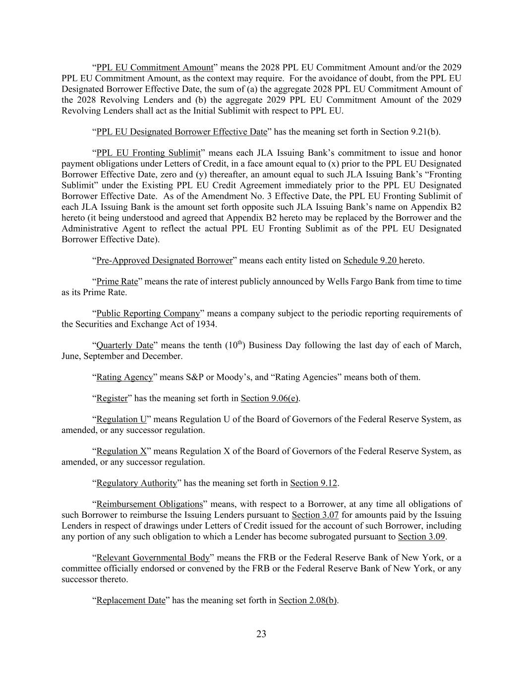 23 “PPL EU Commitment Amount” means the 2028 PPL EU Commitment Amount and/or the 2029 PPL EU Commitment Amount, as the context may require. For the avoidance of doubt, from the PPL EU Designated Borrower Effective Date, the sum of (a) the aggregate 2028 PPL EU Commitment Amount of the 2028 Revolving Lenders and (b) the aggregate 2029 PPL EU Commitment Amount of the 2029 Revolving Lenders shall act as the Initial Sublimit with respect to PPL EU. “PPL EU Designated Borrower Effective Date” has the meaning set forth in Section 9.21(b). “PPL EU Fronting Sublimit” means each JLA Issuing Bank’s commitment to issue and honor payment obligations under Letters of Credit, in a face amount equal to (x) prior to the PPL EU Designated Borrower Effective Date, zero and (y) thereafter, an amount equal to such JLA Issuing Bank’s “Fronting Sublimit” under the Existing PPL EU Credit Agreement immediately prior to the PPL EU Designated Borrower Effective Date. As of the Amendment No. 3 Effective Date, the PPL EU Fronting Sublimit of each JLA Issuing Bank is the amount set forth opposite such JLA Issuing Bank’s name on Appendix B2 hereto (it being understood and agreed that Appendix B2 hereto may be replaced by the Borrower and the Administrative Agent to reflect the actual PPL EU Fronting Sublimit as of the PPL EU Designated Borrower Effective Date). “Pre-Approved Designated Borrower” means each entity listed on Schedule 9.20 hereto. “Prime Rate” means the rate of interest publicly announced by Wells Fargo Bank from time to time as its Prime Rate. “Public Reporting Company” means a company subject to the periodic reporting requirements of the Securities and Exchange Act of 1934. “Quarterly Date” means the tenth (10th) Business Day following the last day of each of March, June, September and December. “Rating Agency” means S&P or Moody’s, and “Rating Agencies” means both of them. “Register” has the meaning set forth in Section 9.06(e). “Regulation U” means Regulation U of the Board of Governors of the Federal Reserve System, as amended, or any successor regulation. “Regulation X” means Regulation X of the Board of Governors of the Federal Reserve System, as amended, or any successor regulation. “Regulatory Authority” has the meaning set forth in Section 9.12. “Reimbursement Obligations” means, with respect to a Borrower, at any time all obligations of such Borrower to reimburse the Issuing Lenders pursuant to Section 3.07 for amounts paid by the Issuing Lenders in respect of drawings under Letters of Credit issued for the account of such Borrower, including any portion of any such obligation to which a Lender has become subrogated pursuant to Section 3.09. “Relevant Governmental Body” means the FRB or the Federal Reserve Bank of New York, or a committee officially endorsed or convened by the FRB or the Federal Reserve Bank of New York, or any successor thereto. “Replacement Date” has the meaning set forth in Section 2.08(b).